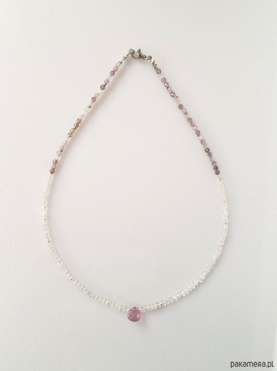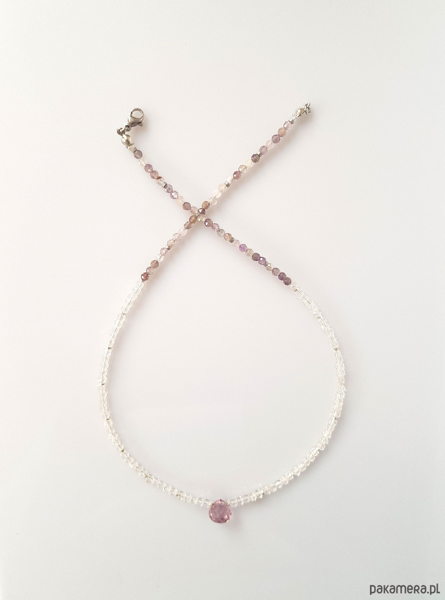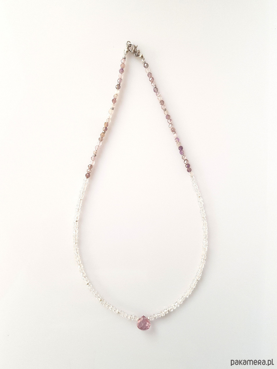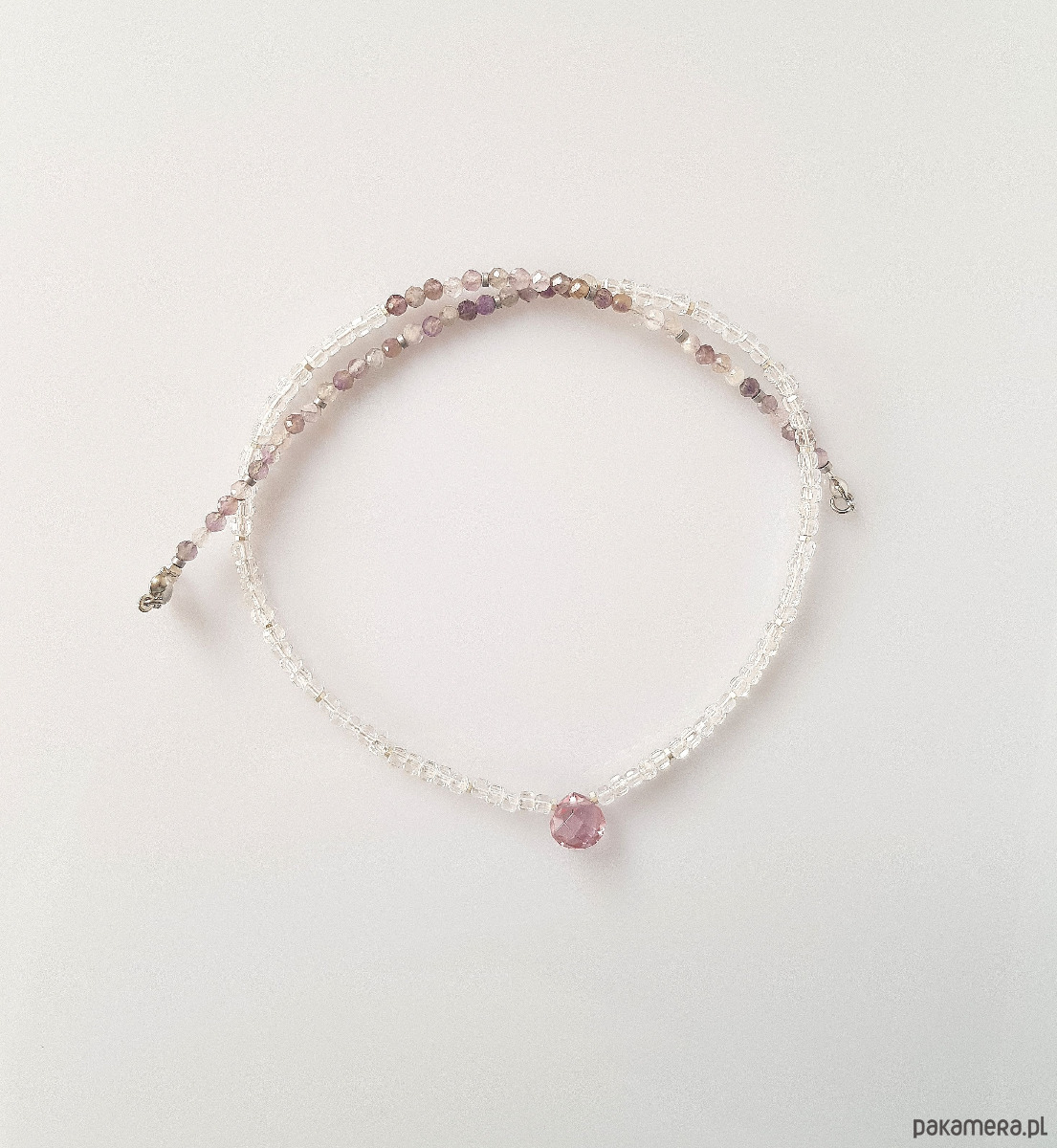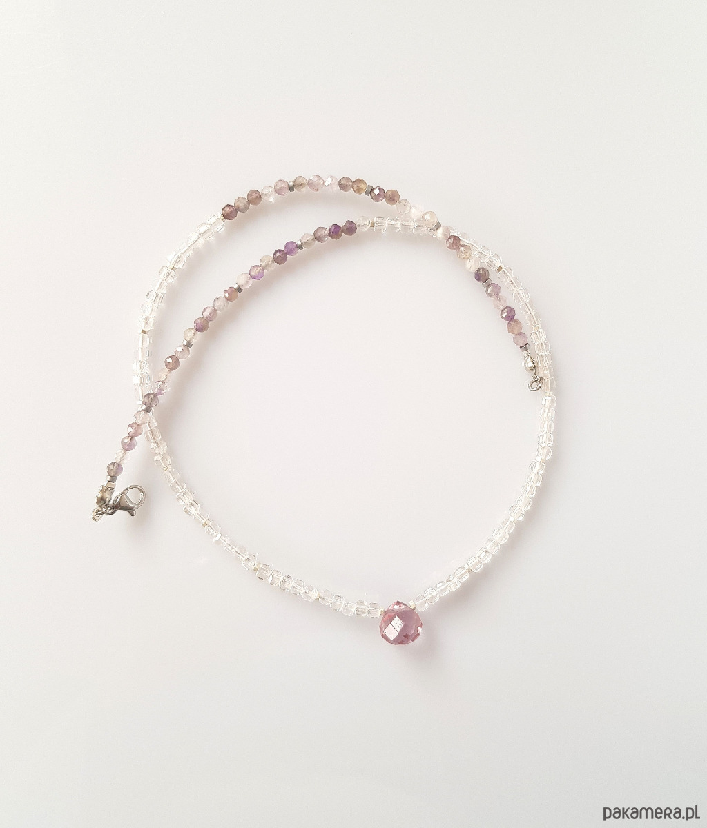 Brioletka przejrzystego ametystu o średnicy około 10 mm, fasetowane kuleczki ametystu i pięknie współpracujące ze światłem kostki kryształu górskiego.