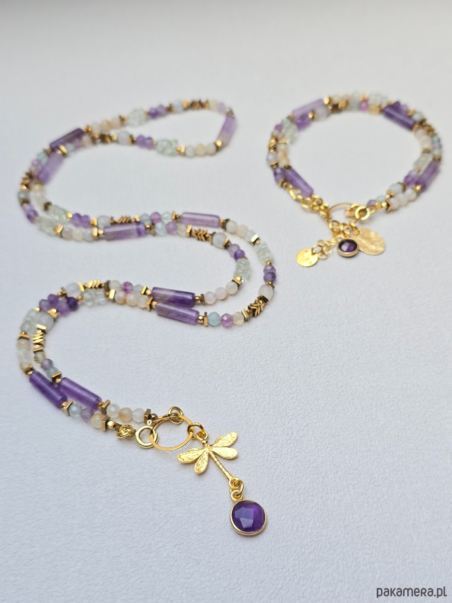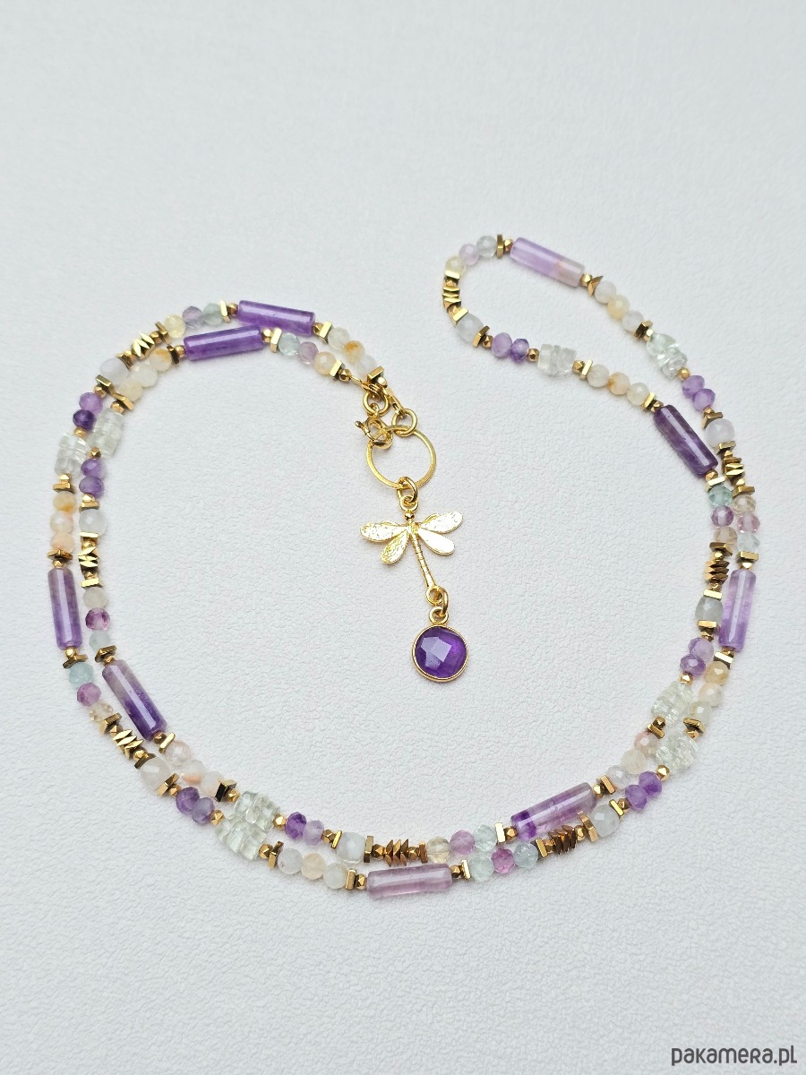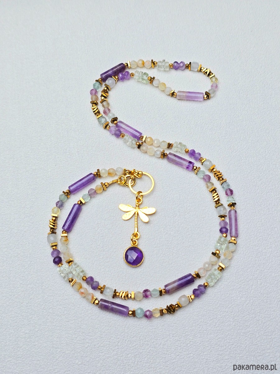 Dłuższy naszyjnik z ważką, wykonany z kamieni: ametystu, cytrynu, fluorytu, zielonego ametystu, którym towarzyszą przekładki ze złoconego hematytu.