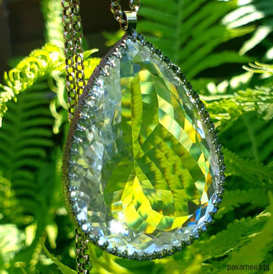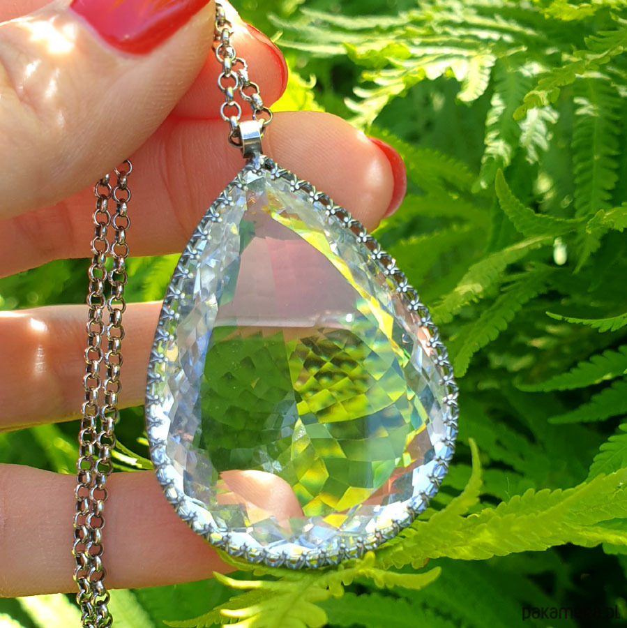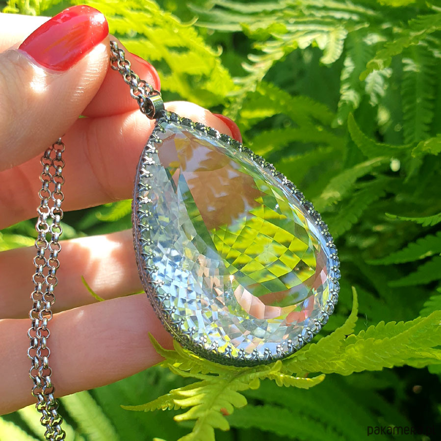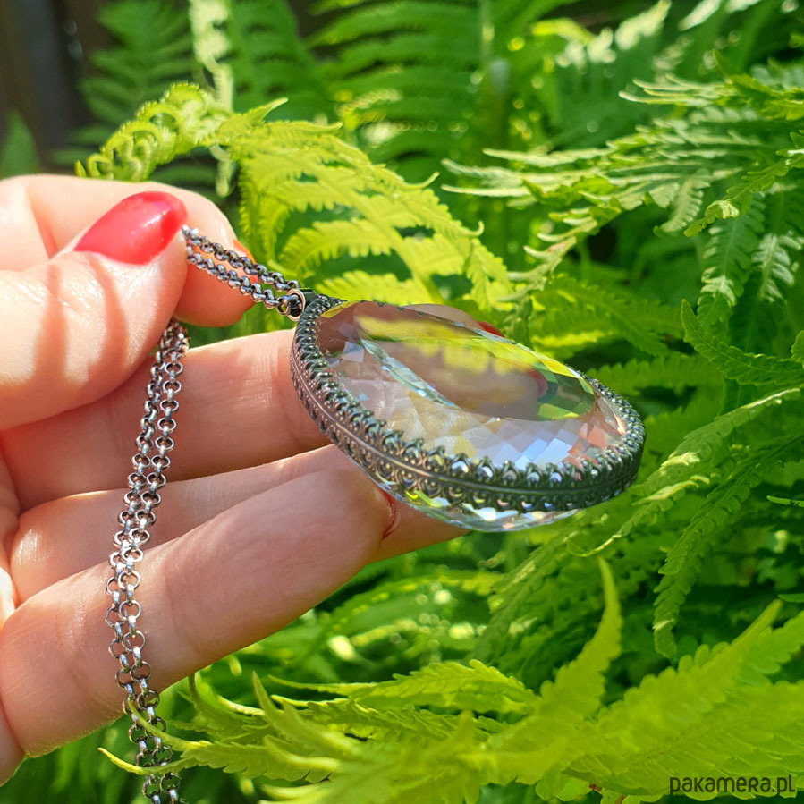 Wyjątkowy naszyjnik wykonany od podstaw ręcznie z przepięknej urody ogromnego naturalnego fasetowanego Kryształu Górskiego klasy AAA. Ma 146 ct. (karata). Wisior jest dwustronny. Kryształ Górski - zwany jest Królem Kryształów lub Solą Ziemi - ma najsilniejsze działanie oczyszczające. Jest naturalnym odpromiennikiem. Gdy masz już swój, dbaj o to aby nie był dotykany przez inne osoby. Polecany do wszystkich znaków zodiaku :), Srebro próby 925, przyczernione przetarte polerowane. Długość wisiora 5,1 cm a szerokość 3,3 cm – długi łańcuszek 70 cm w tym regulacja 5 cm. Nehesi Design.