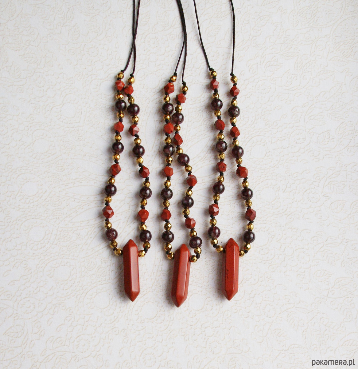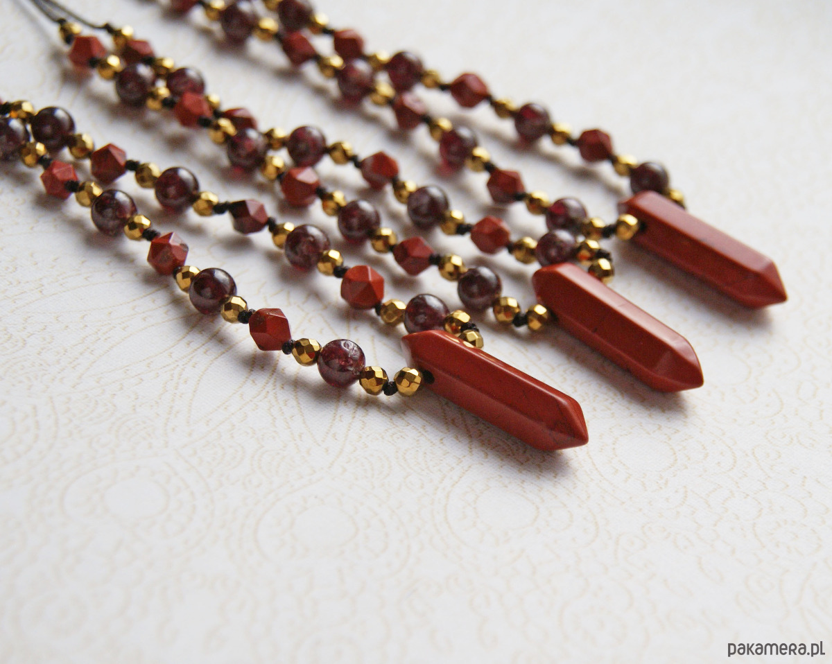 w centrum: grot z jaspisu królewskiego w odcieniu intensywnej, ceglastej czerwieni (ok. 3cm), dodatkowo : JASPIS (szlif gwiazdkowy 6-7mm), GRANAT (8mm), ZŁOTY HEMATYT.