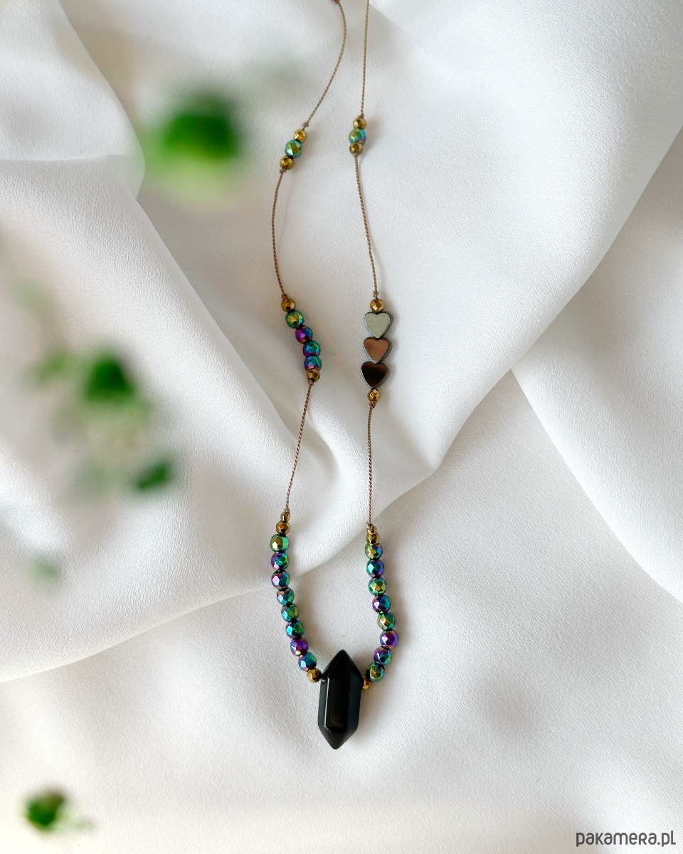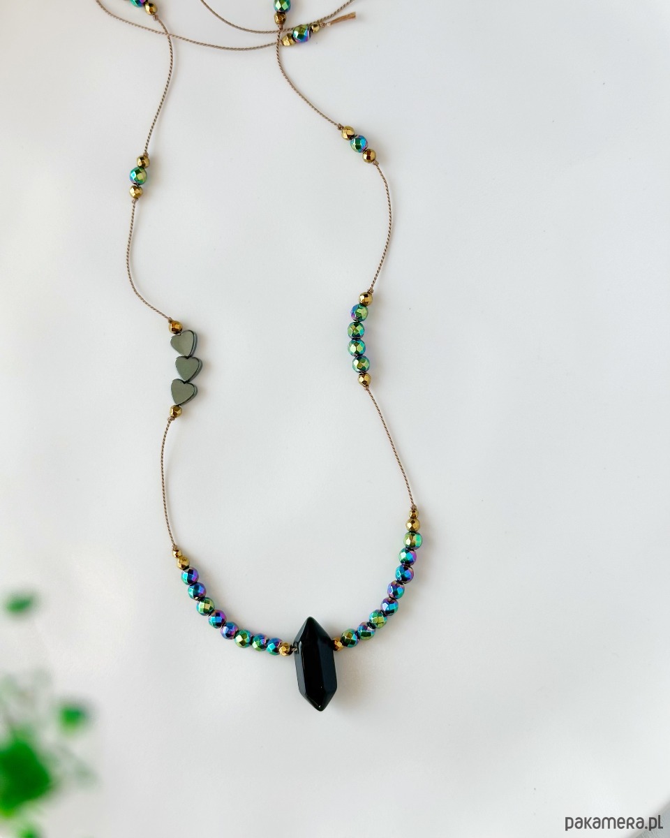 Magiczny naszyjnik na nici jedwabnej z czarnym onyksem, złotym i kolorowym hematytem. Ochrona, siła i równowaga💫