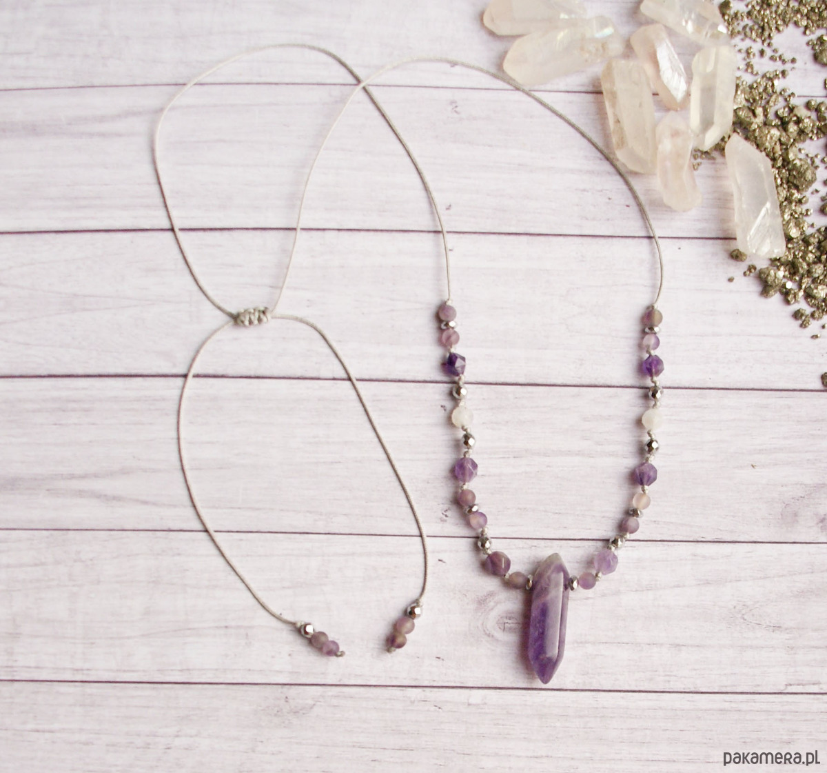 w centrum: grot z ametystu (ok. 3cm), dodatkowo : supełkowane kuleczki i oponki srebrnego hematytu 4mm i kule ametystu o szlifie gwiazdkowym (ok. 6mm), matowe kuleczki ametystu 4mm, kamień księżycowy 4mm.