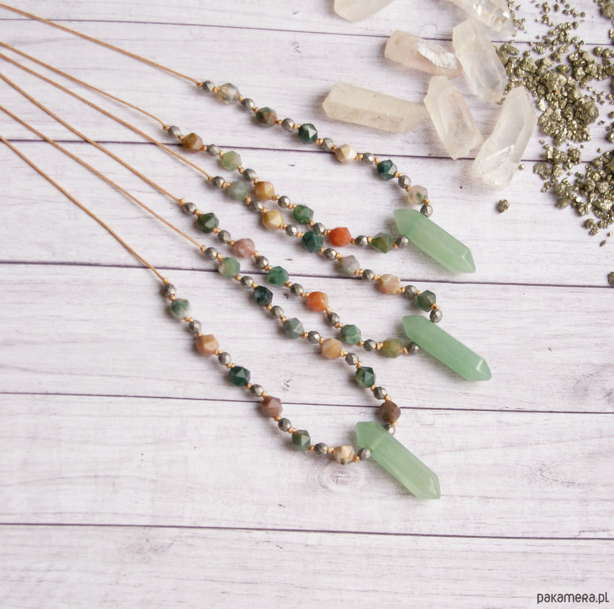 w centrum: grot z zielonego awenturynu (ok. 3cm), dodatkowo : supełkowane kuleczki matowego, srebrnego hematytu 4mm i kule wielobarwnego agatu indiańskiego o szlifie gwiazdkowym (7-8mm)