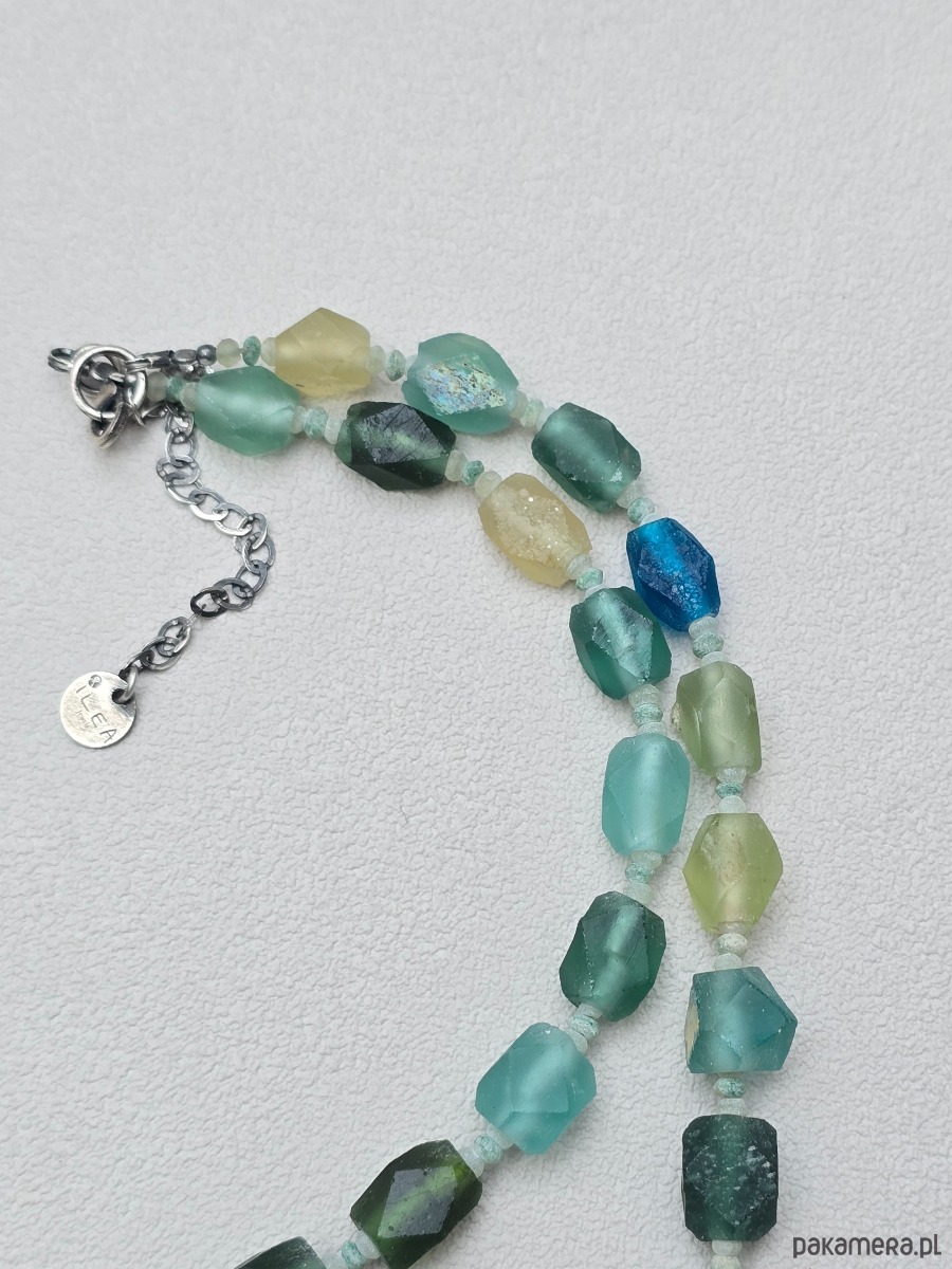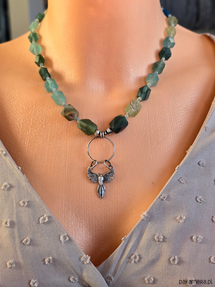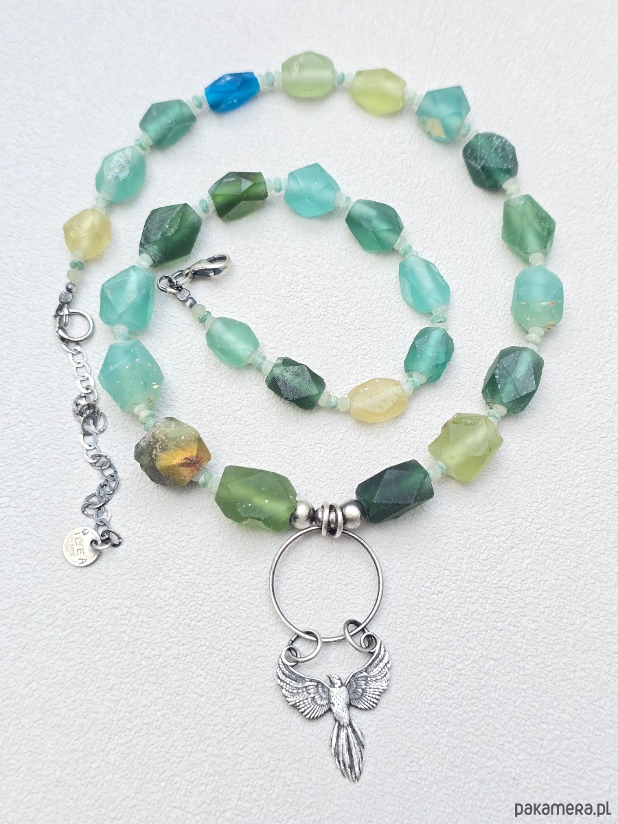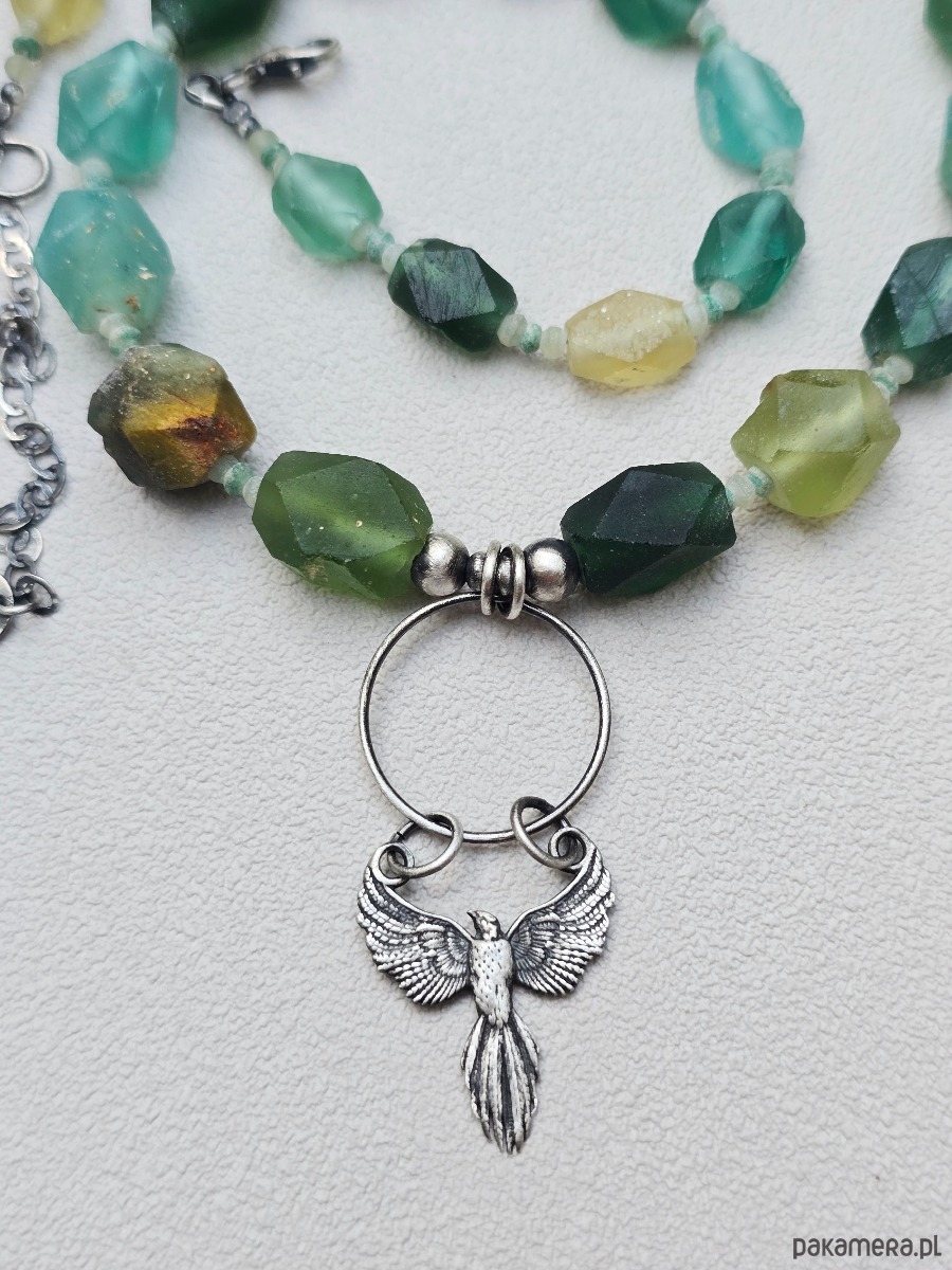 Wyjątkowy naszyjnik z motywem Feniksa. Wykonany z fasetowanych bryłek antycznego szkła.