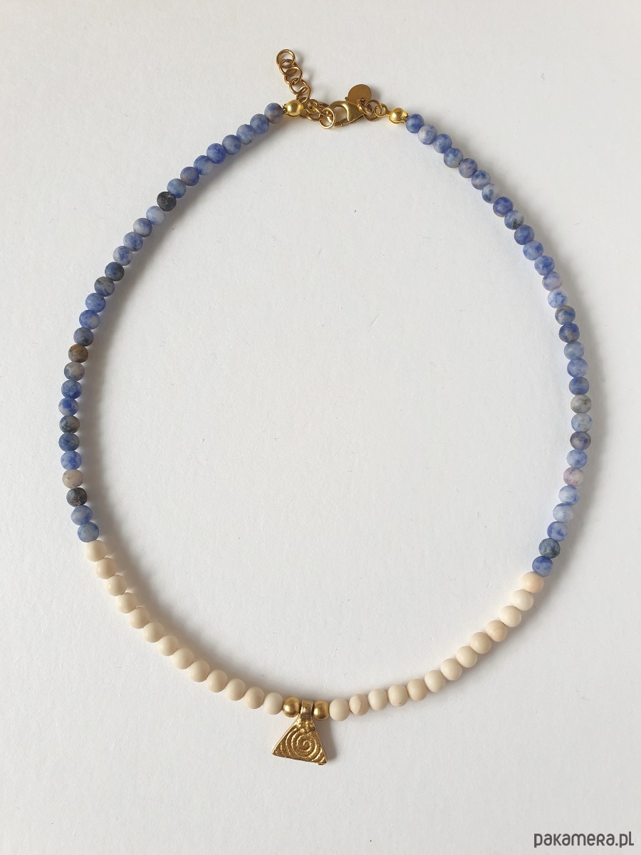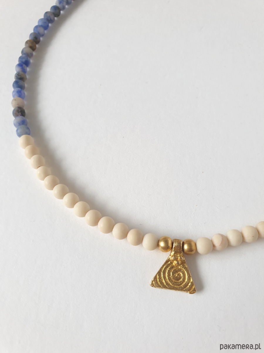 Naszyjnik choker z kolekcji ANTYK inspirowanej starożytnością. Tworzony ręcznie z kamieni naturalnych, tutaj jaspis niebieski, kamień rzeczny (jaspis river). Wisiorek w formie piramidy, trójkąta ze spiralą, kulki, elementy zapięcia z surowego mosiądzu. Na zdjęciu przykładowy naszyjnik, tworzę je z tych samych kamyczków i elementów, ale mogą być minimalne różnice w odcieniu kamienia.