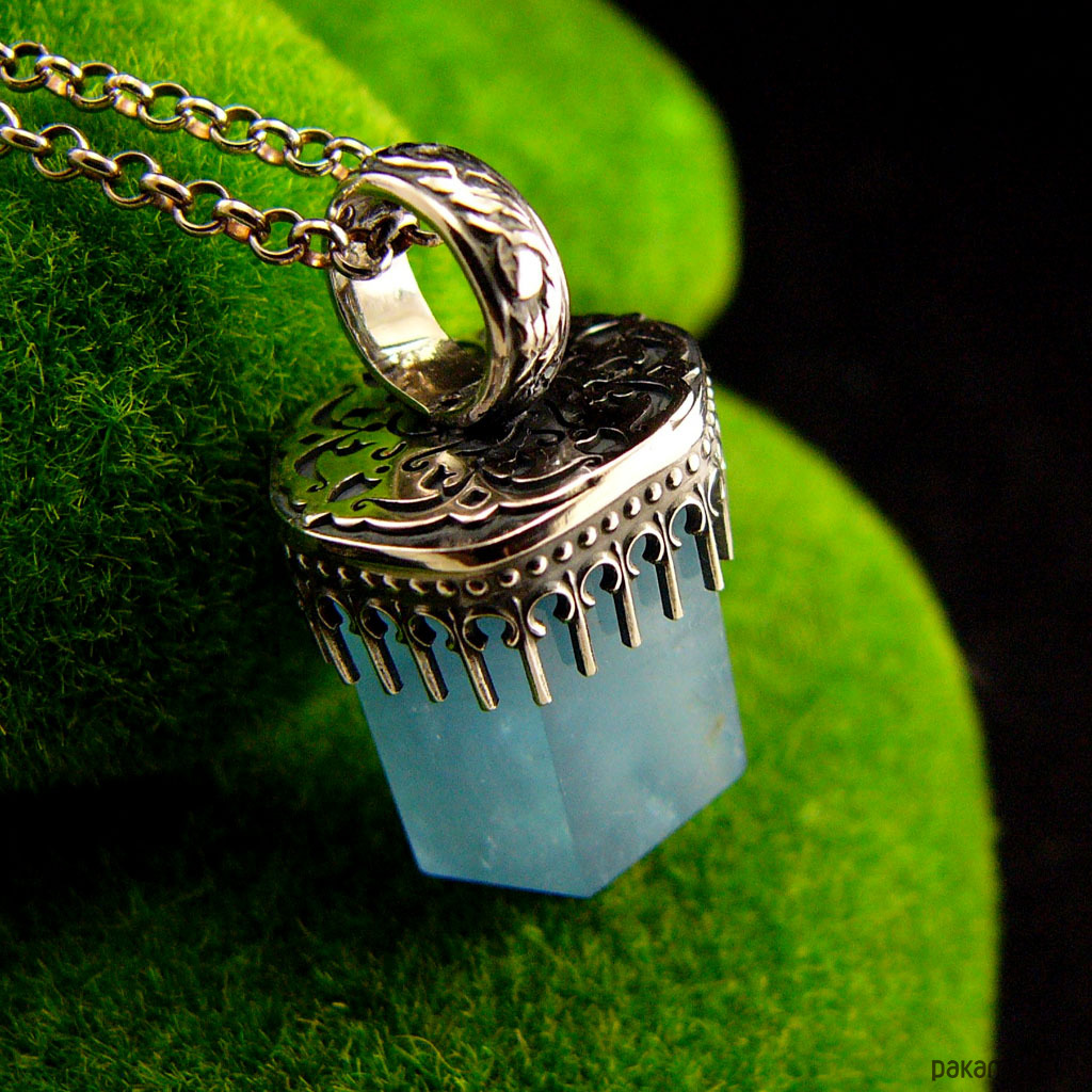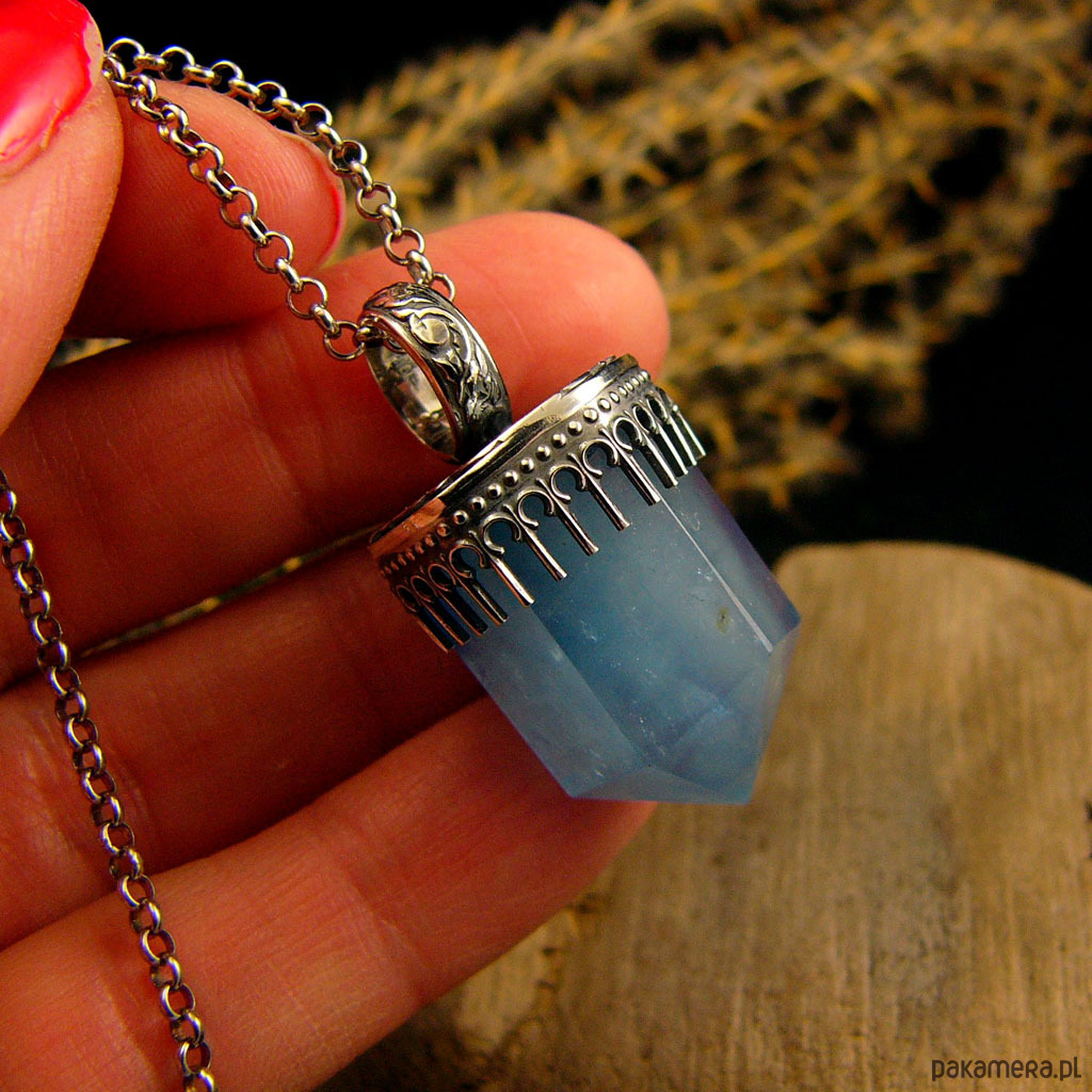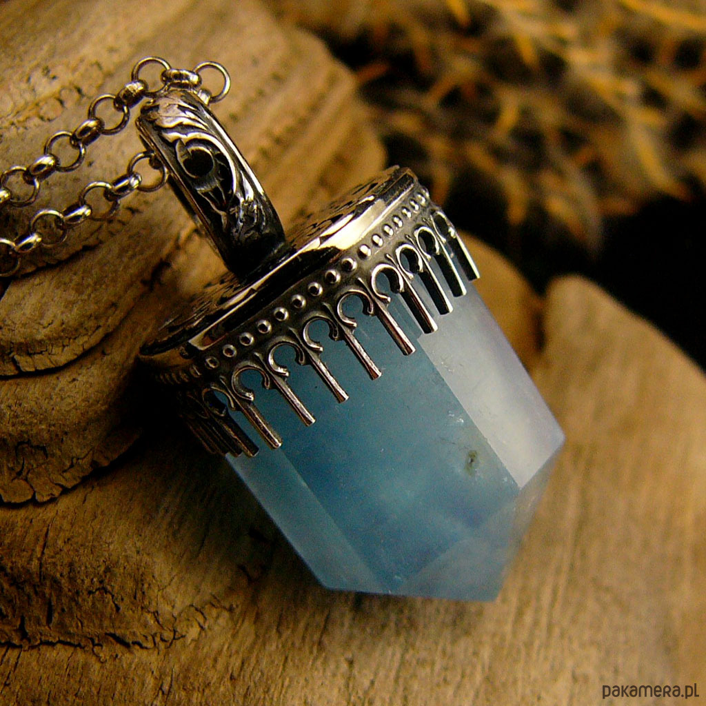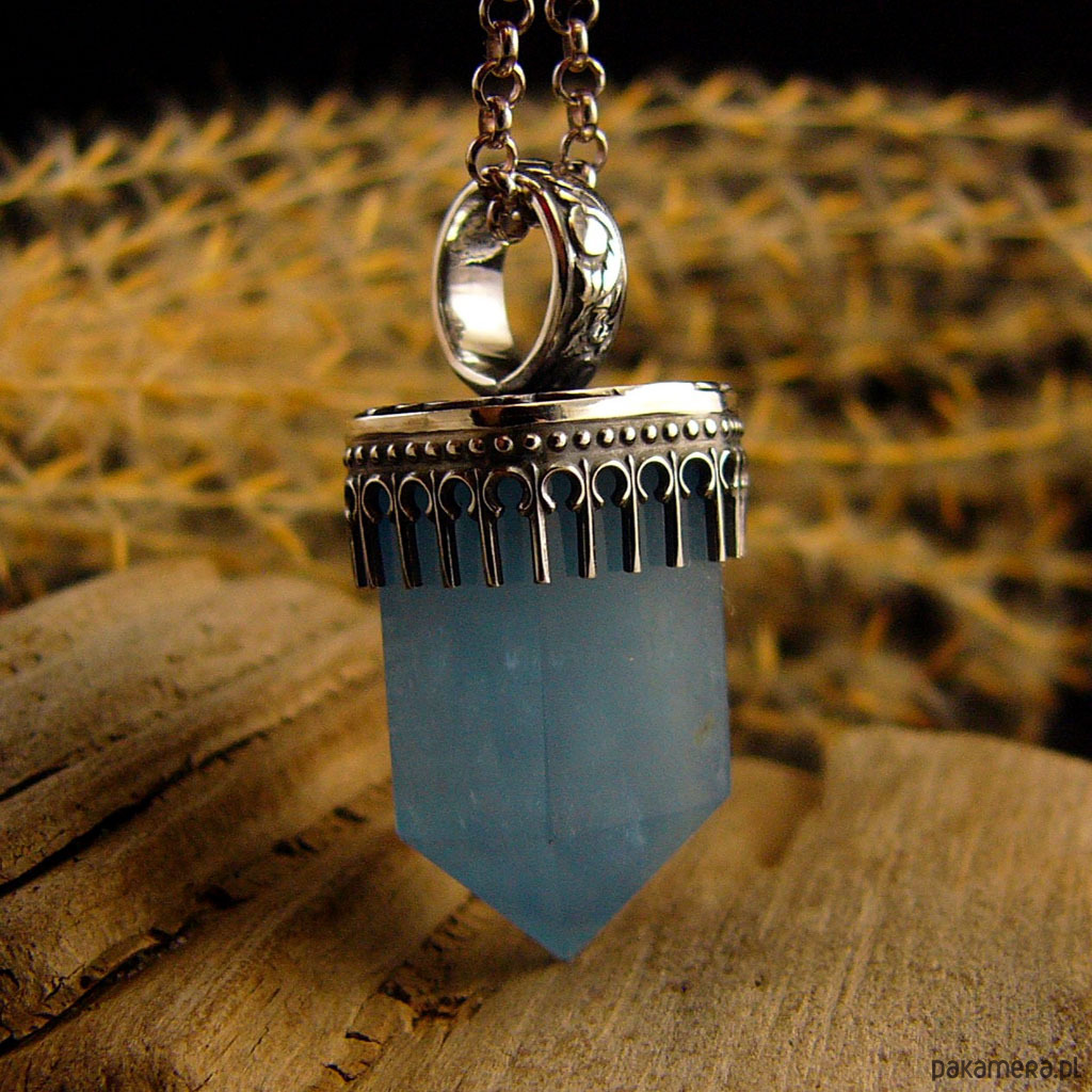Naszyjnik z przepięknej urody naturalnym Akwamarynem, wykonany został w srebrze prób 930 i 999. Wisior wykonany od podstaw ręcznie, ma 3,5 cm długości i 1,7 cm szerokości. Łańcuszek 70 cm długości całkowitej w tym 5 cm regulacja. Srebro muśnięte delikatnie czernią ( oksydowane), wypolerowane aby nadać antycznego charakteru. Akwamaryn to kamień ochronny podróżnych. Dobrze wpływa na mózg i intelekt. Naszyjnik wykonany został z największą precyzją - jest Unikatem. Nehesi Design.