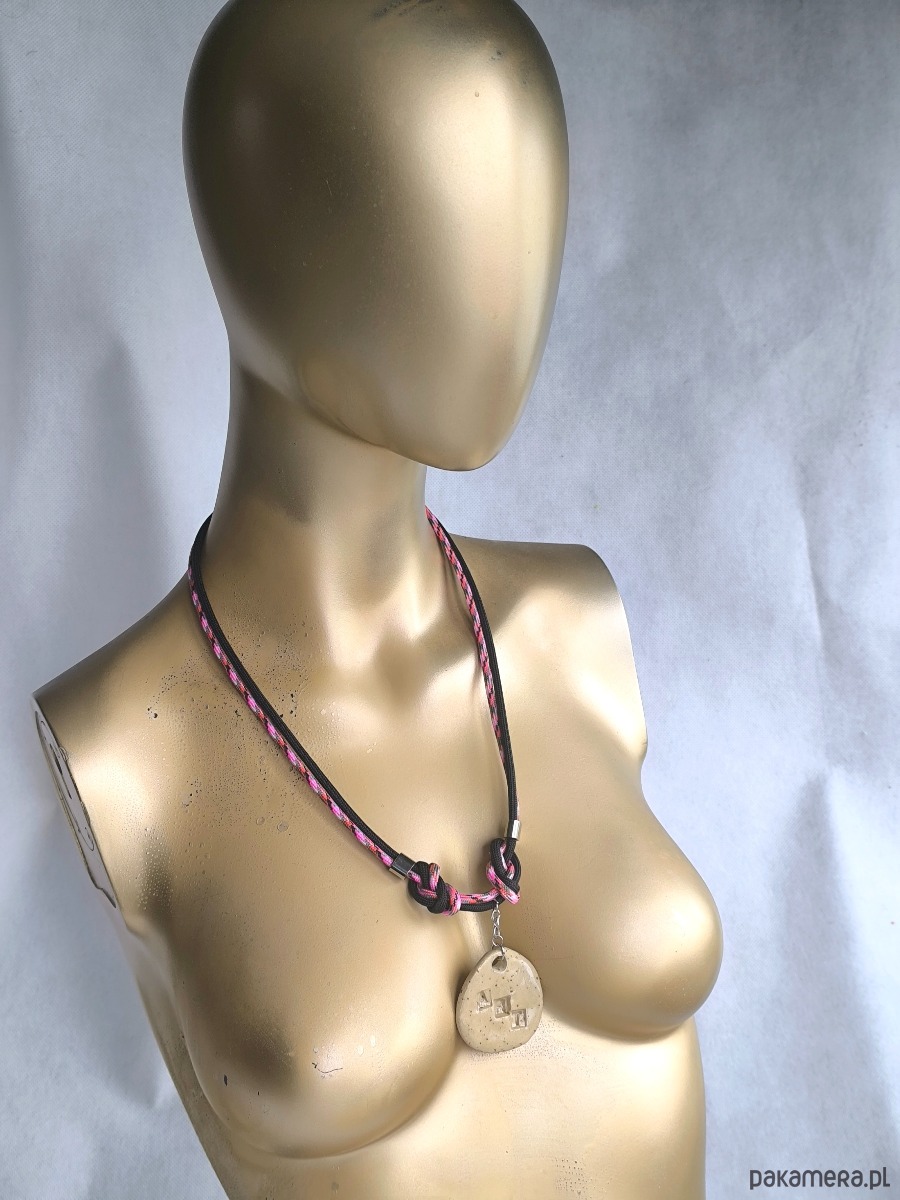 Ceramiczna zawieszka z napisem ART wykonana przeze mnie w zaprzyjaznionym studiu ceramicznym Zawieszona na linkach paracord w kolorze czarnym i miksie kolorów w odcieniu szarości i różu . Wykończenie stał szlachetna.
