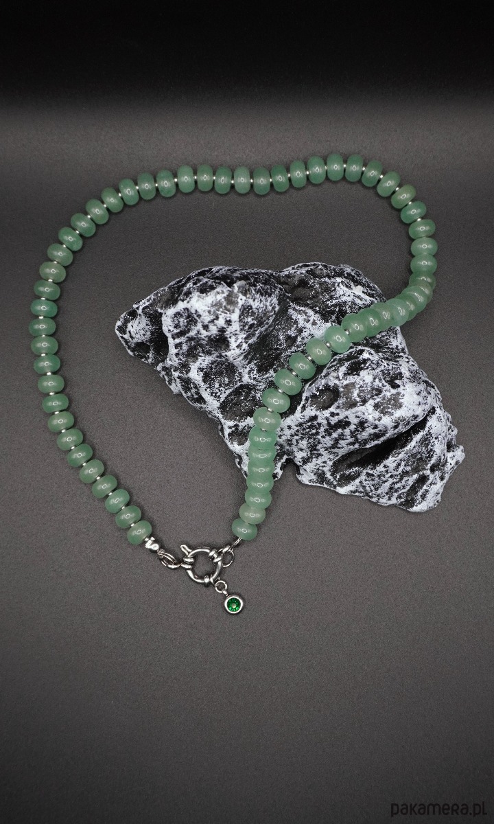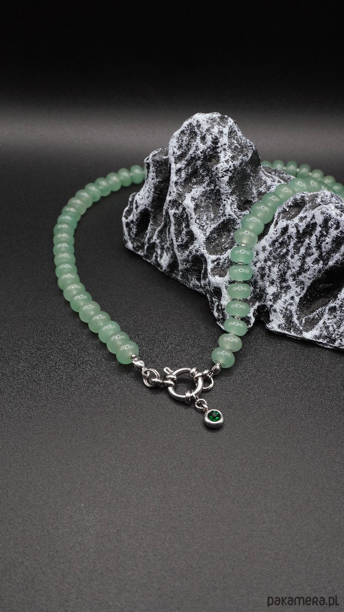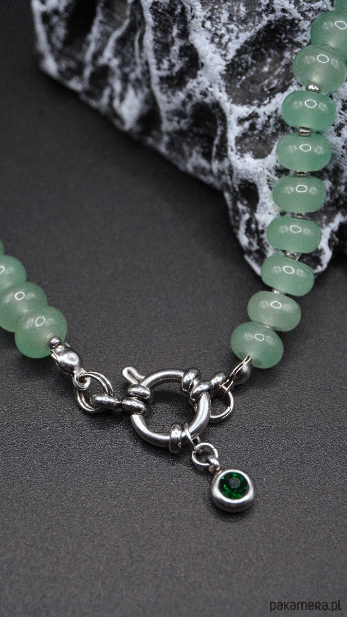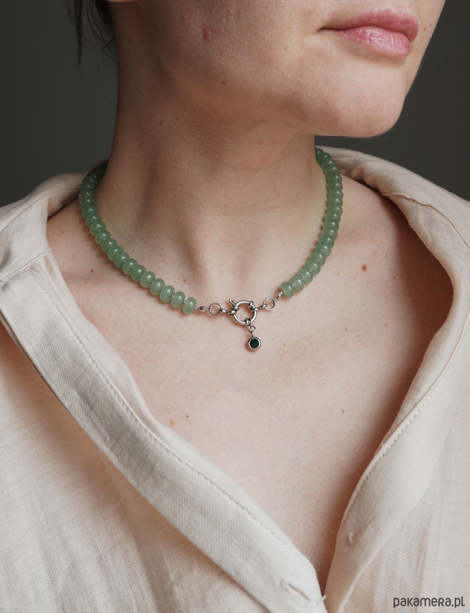 Elegancki naszyjnik–choker wykonany z naturalnego awenturynu w delikatnym, zielonym odcieniu. Gładkie, zaokrąglone koraliki pięknie układają się na linii szyi, tworząc subtelny akcent i podkreślając naturalne piękno stylizacji.
