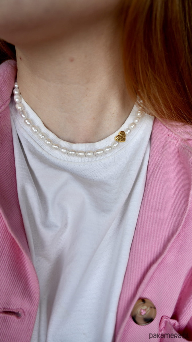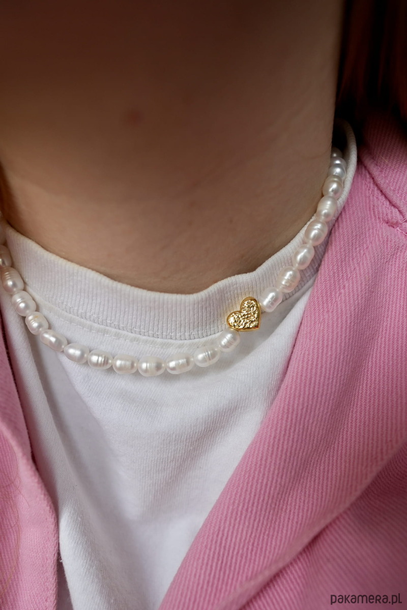 Perły naturalne o nieregularnym kształcie. Zawieszka serduszko umiejscowiona tak, by układała się z boku szyi. Elementy metalowe jak i zawieszka w kształcie serca to srebro 925, pozłacane 24K złotem. Ze względu na użycie naturalnych pereł, kształt i odcień może się różnić, co dodaje im jeszcze większej atrakcyjności i unikalnego wyglądu.