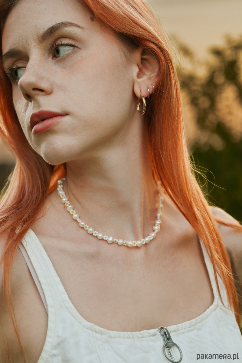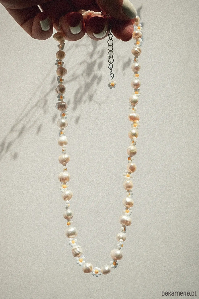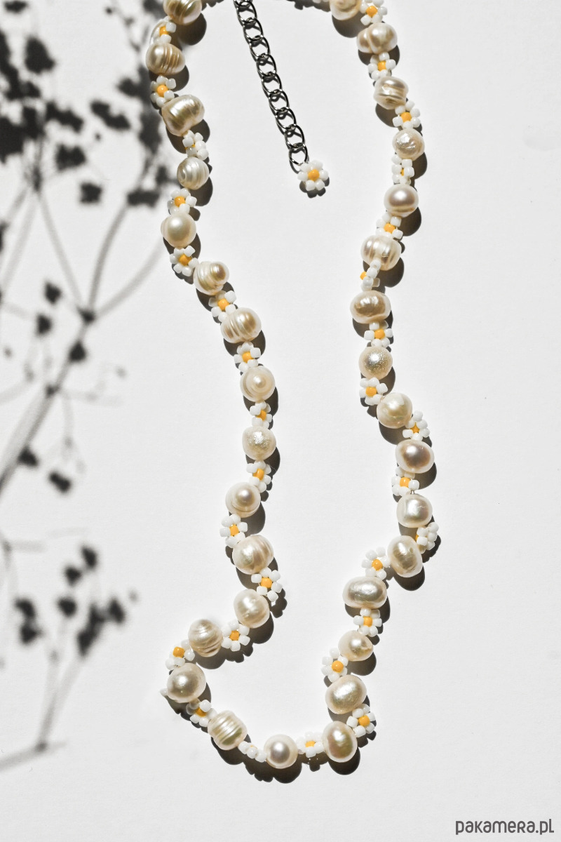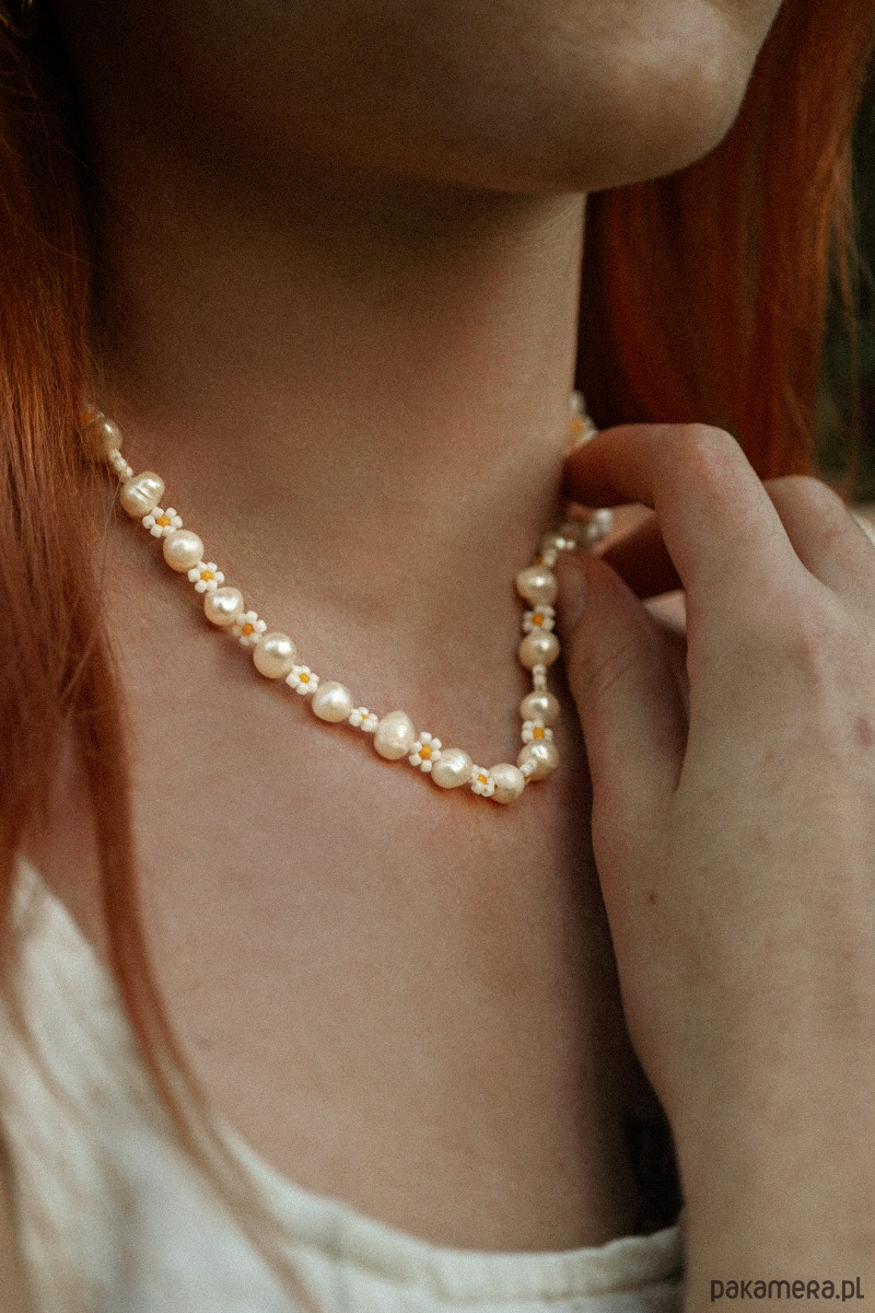 Połączenie pereł słodkowodnych oraz stokrotek z koralików zachwyci każdego!