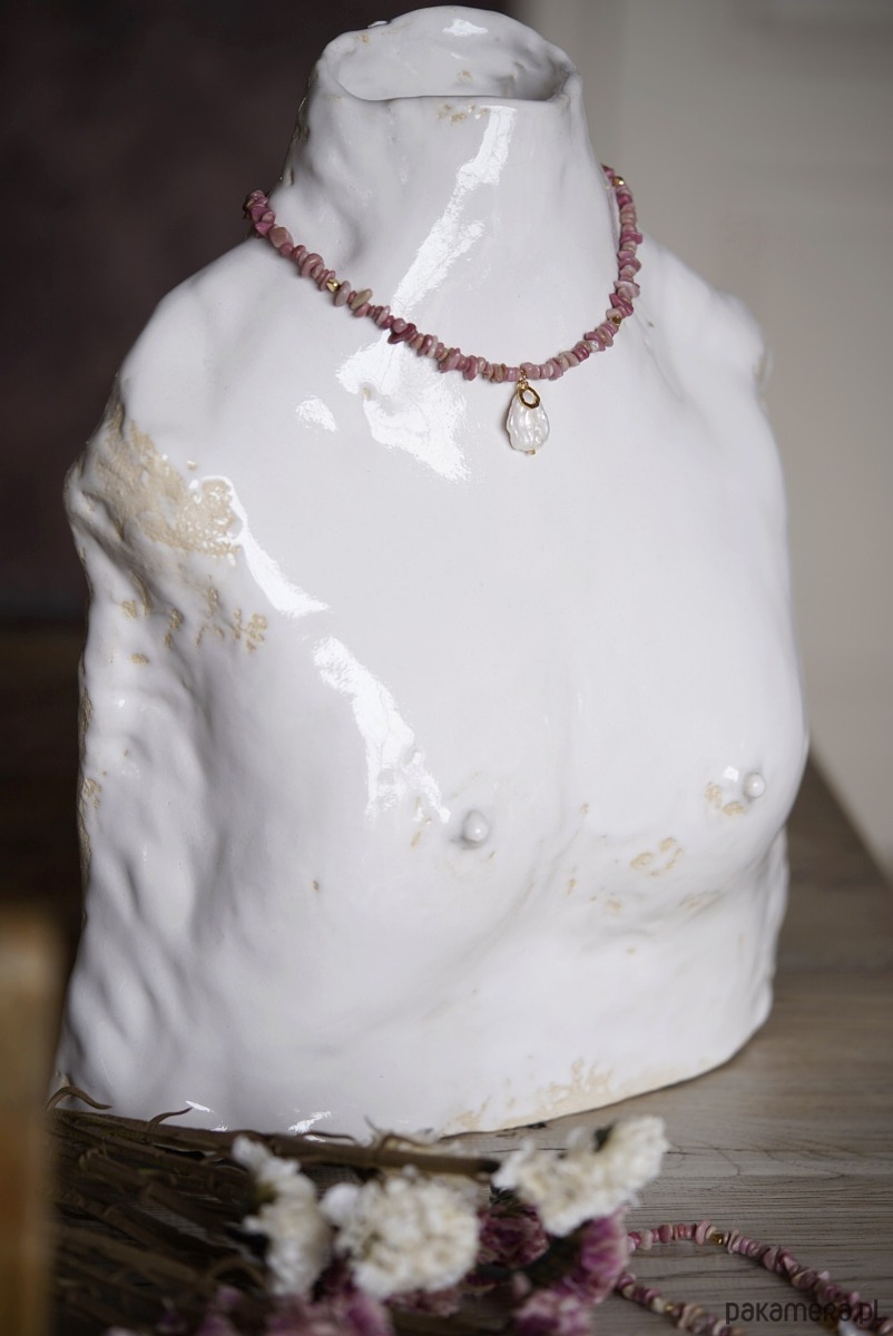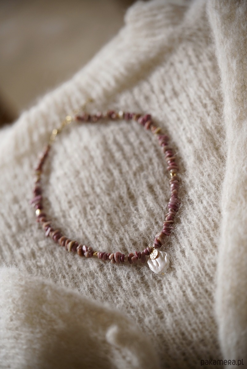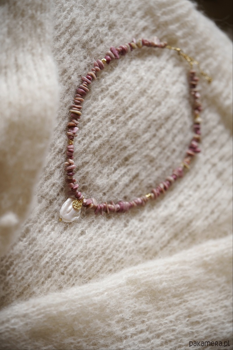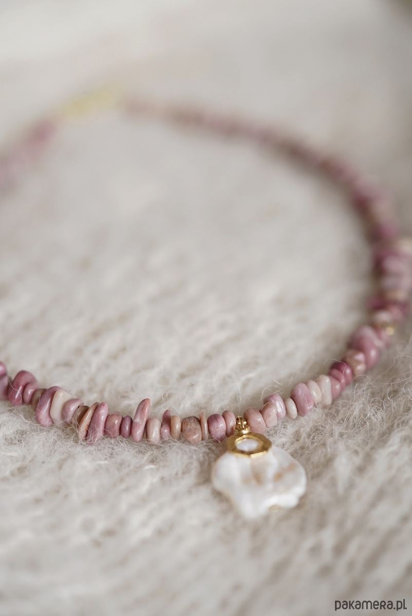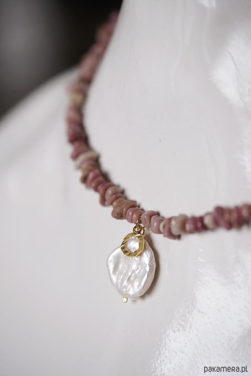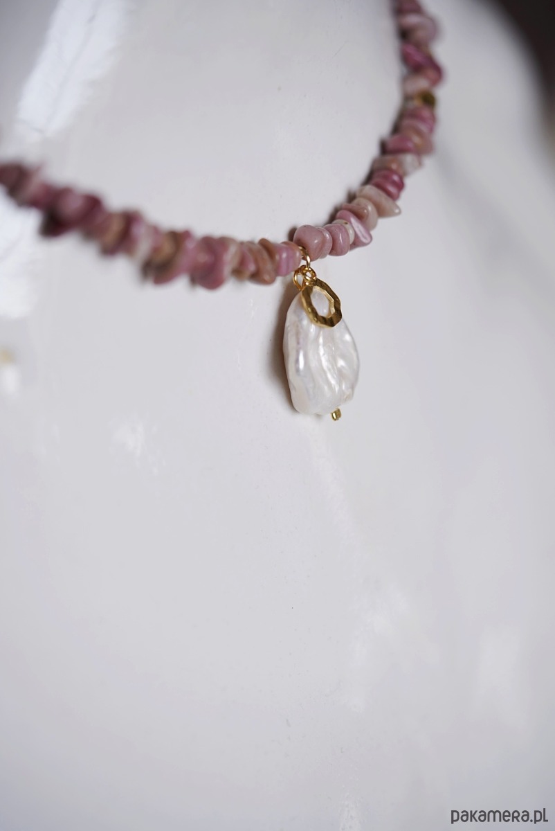 Autorsko komponowany naszyjnik, któy łączy w sobie naturalne piękno różowego rodonitu z elegancją pozłacanego srebra próby 925, a w roli głównej występuje naturalna, duża, nieregularna perła .
