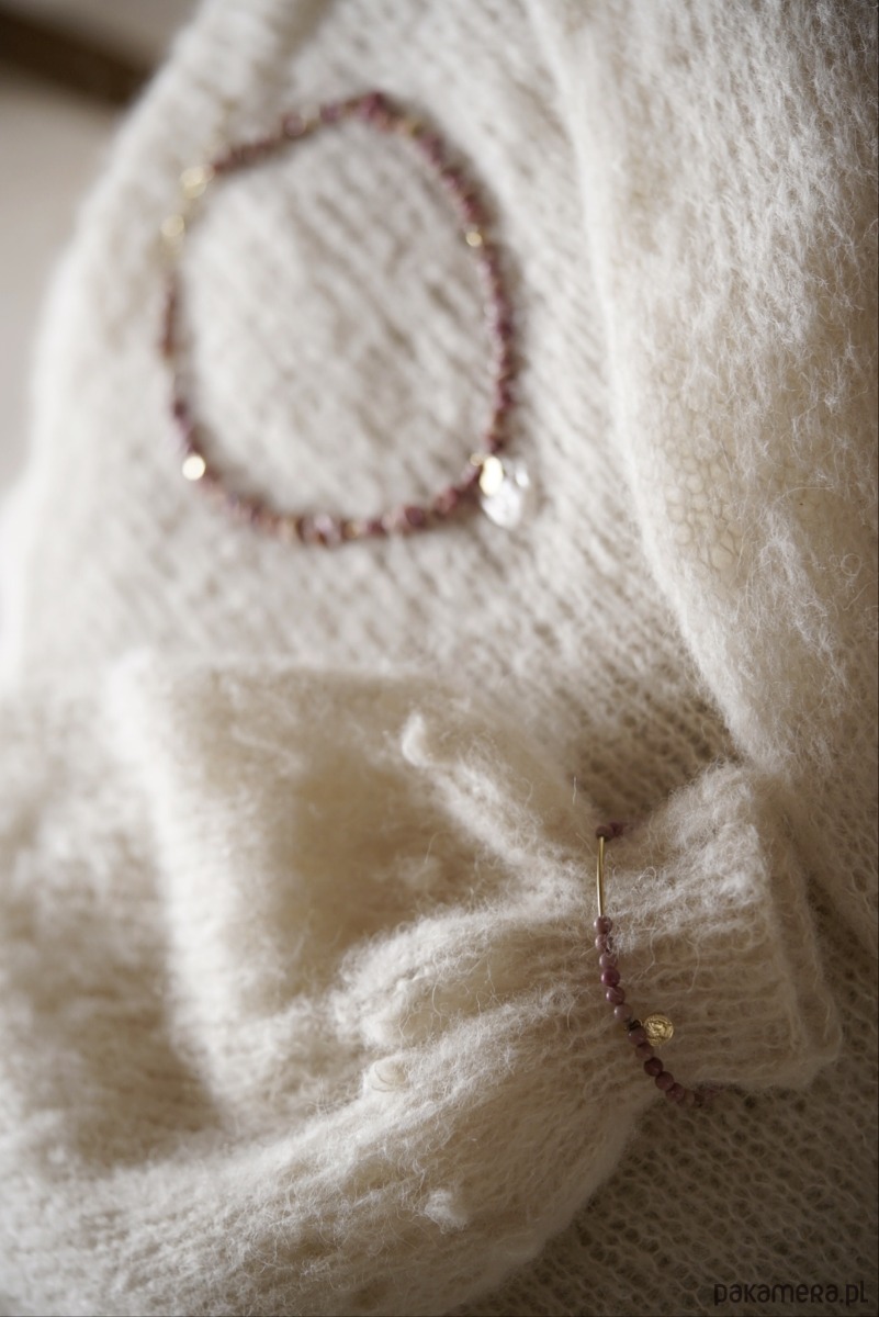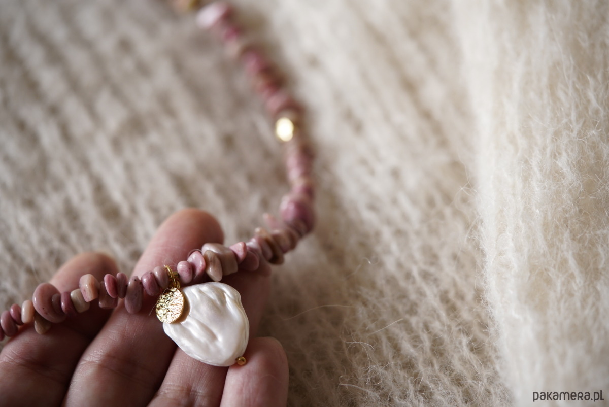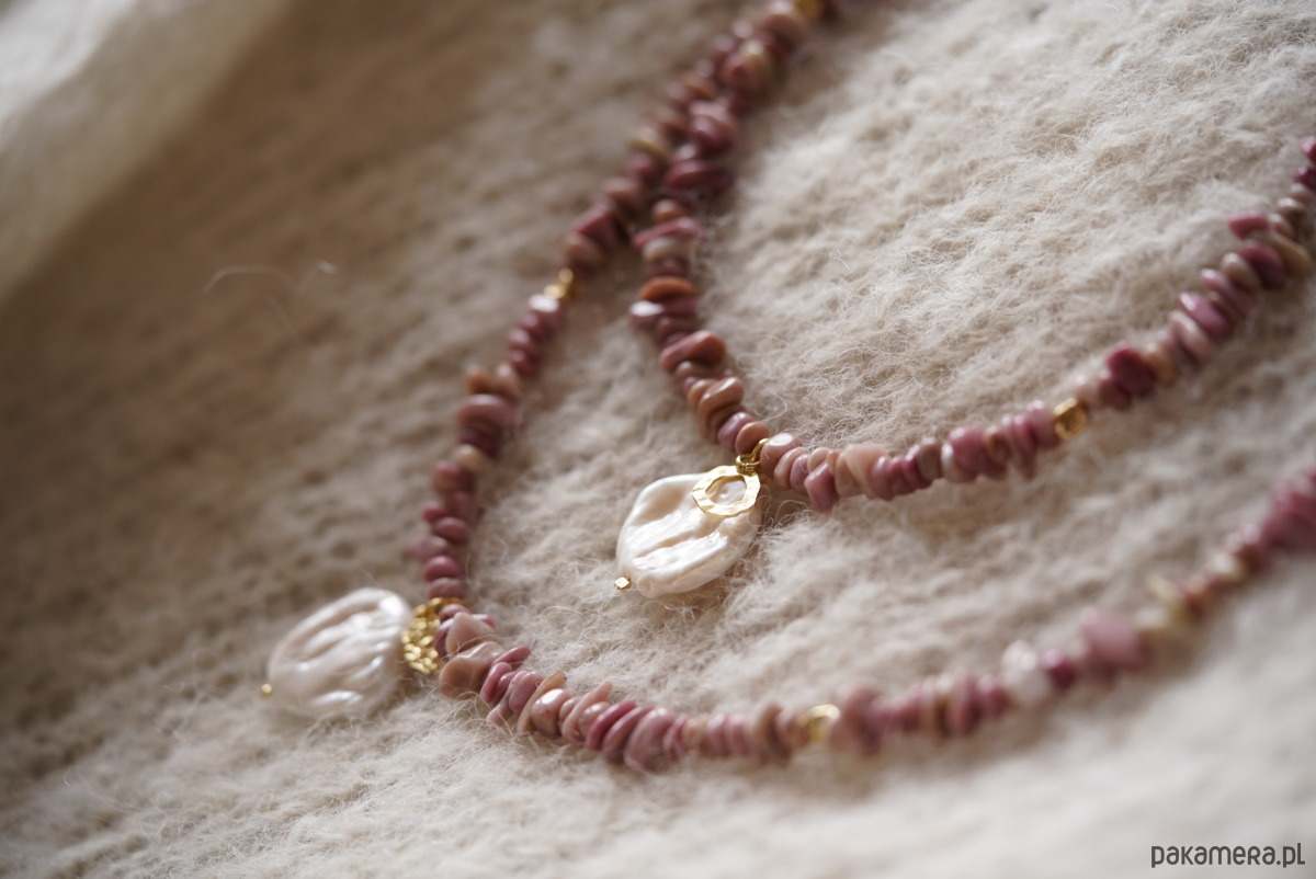 - Materiał: różowy rodonit, perła naturalna, pozłacane srebro próby 925, stal chirurgiczna