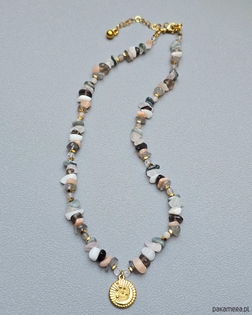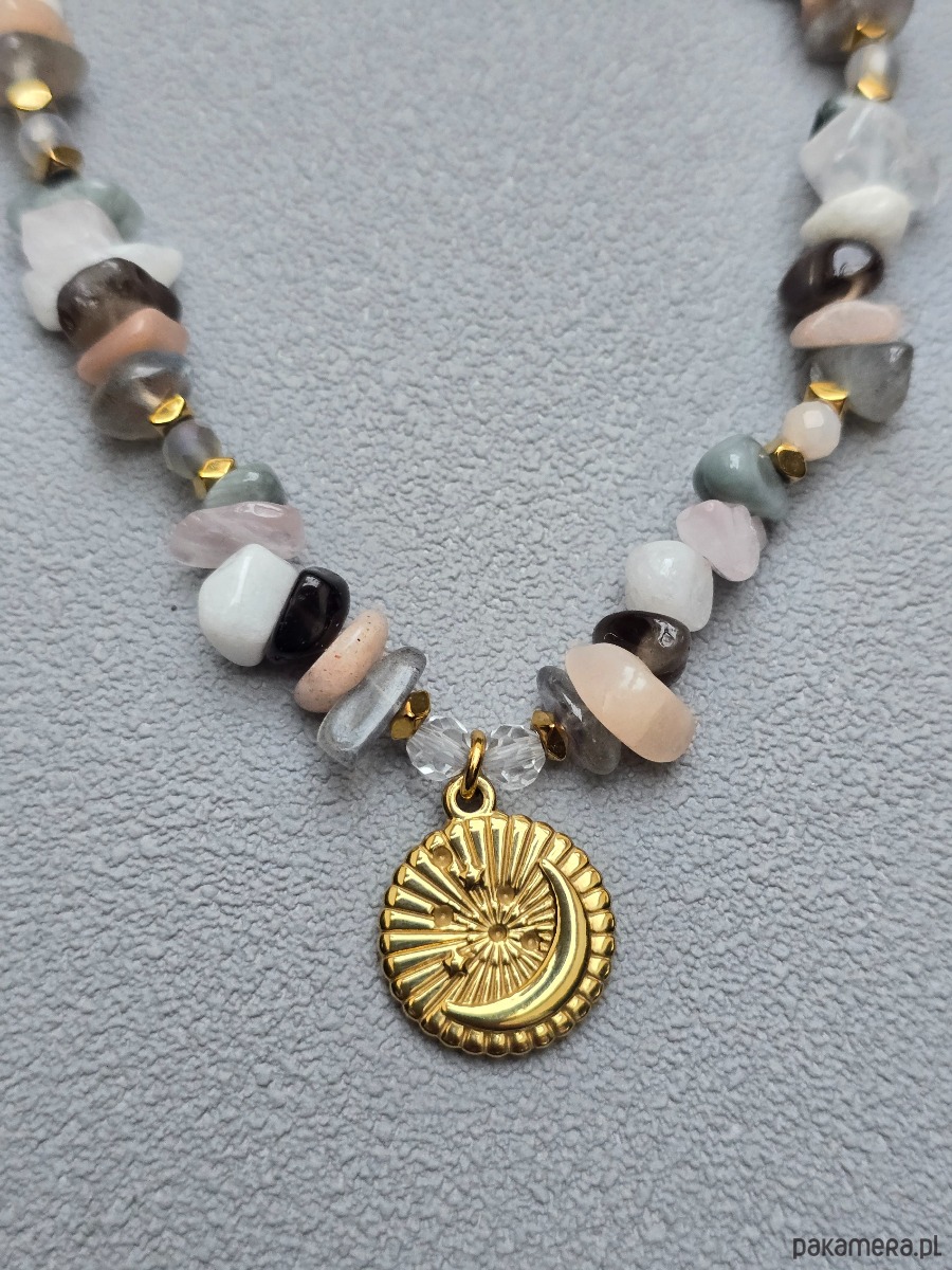 Niepowtarzalny naszyjnik o spokojnej kolorystyce wykonany znieregularnych kamieni. Ma piękną zawieszkę, na której jest motyw księżyca i gwiazd.
