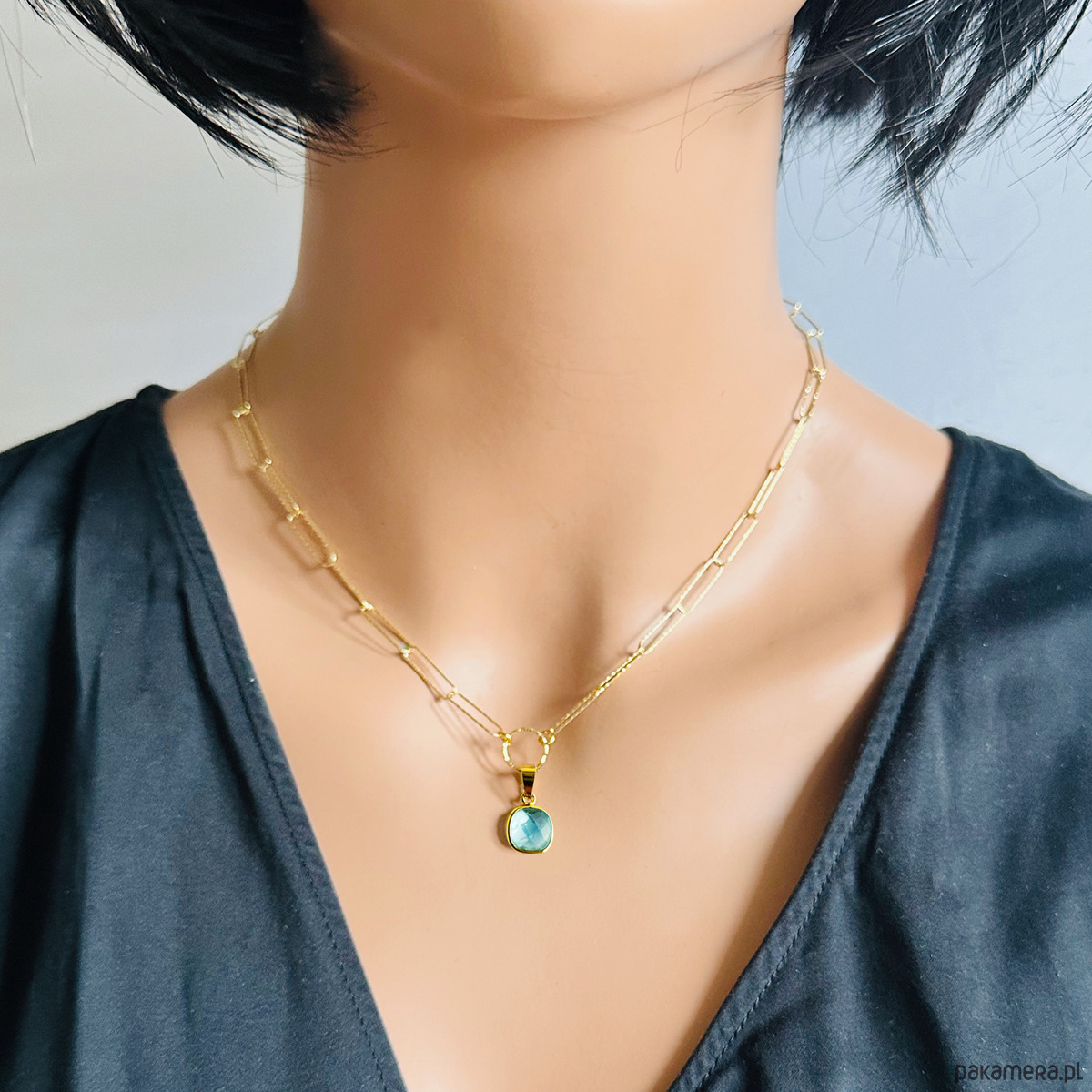 Piękny naszyjnik w stylu boho na szerokim łańcuchu o dużych ogniwach, ze efektowną zawieszką w kolorze błękitu -topazem w oprawie. Wyjątkowo efektowny, można go nosić pojedynczo lub łączyć z innymi naszyjnikami. Pasuje do stylu eleganckiego jak i casual.
