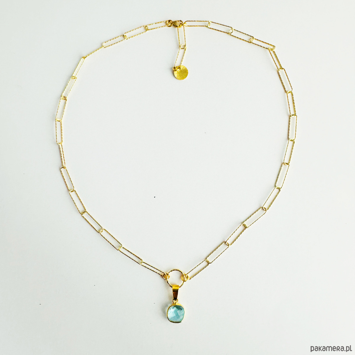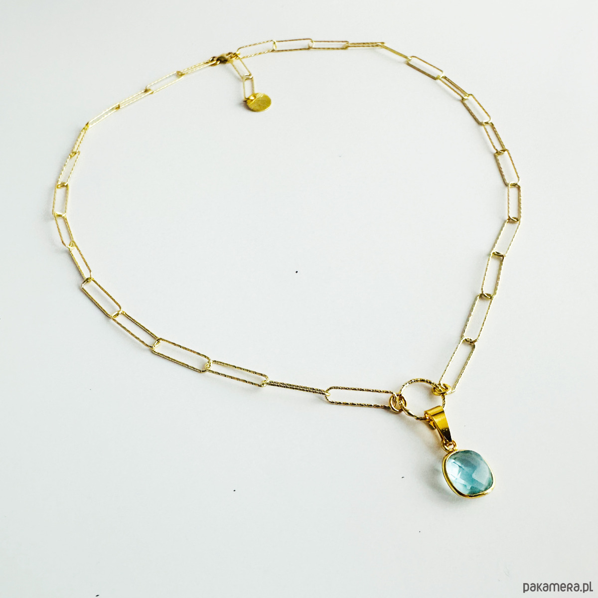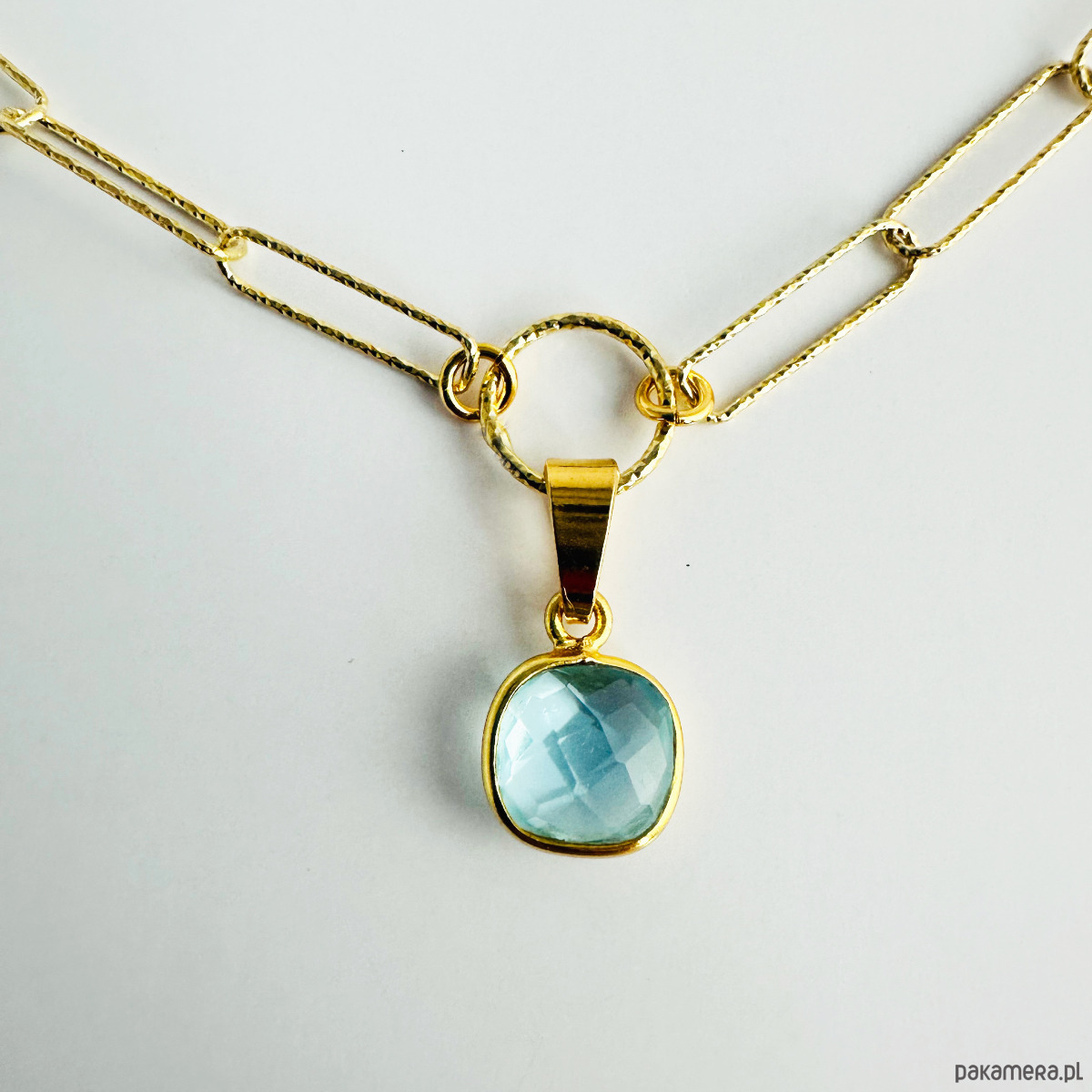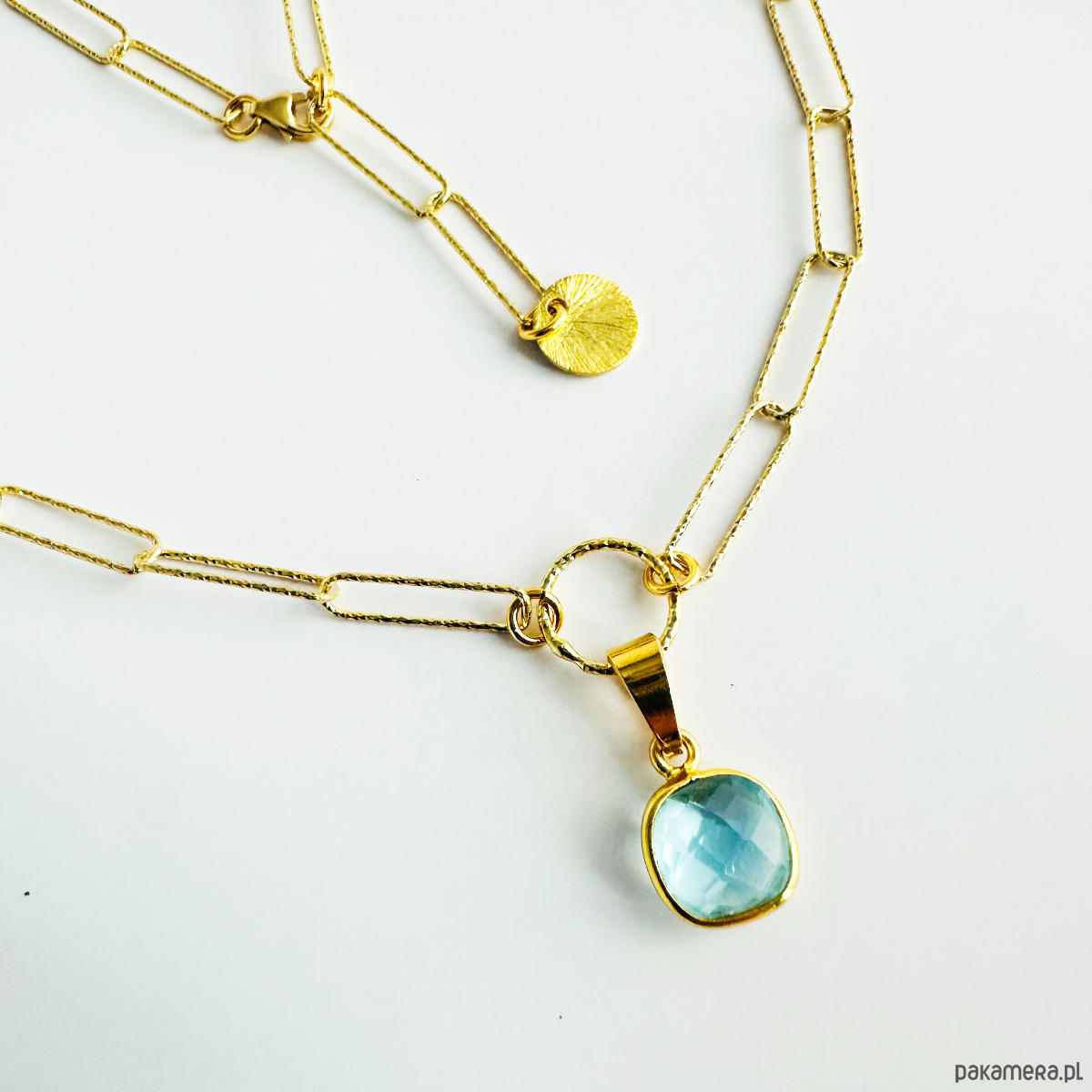Piękny naszyjnik w stylu boho na szerokim łańcuchu o dużych ogniwach, ze efektowną zawieszką w kolorze błękitu -topazem w oprawie. Wyjątkowo efektowny, można go nosić pojedynczo lub łączyć z innymi naszyjnikami. Pasuje do stylu eleganckiego jak i casual.
