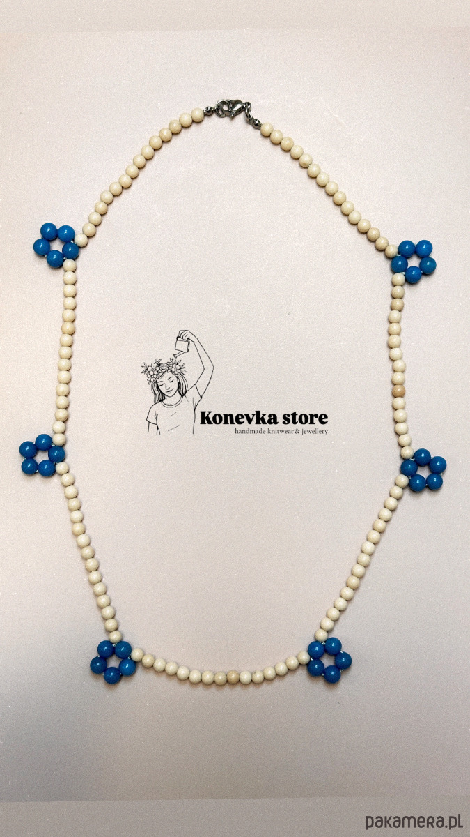 Naszyjnik wykonany z pięknego kamyczka rzecznego w odcieniach beżu oraz z niebieskiego jadeitu .