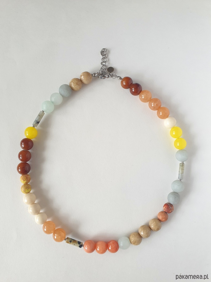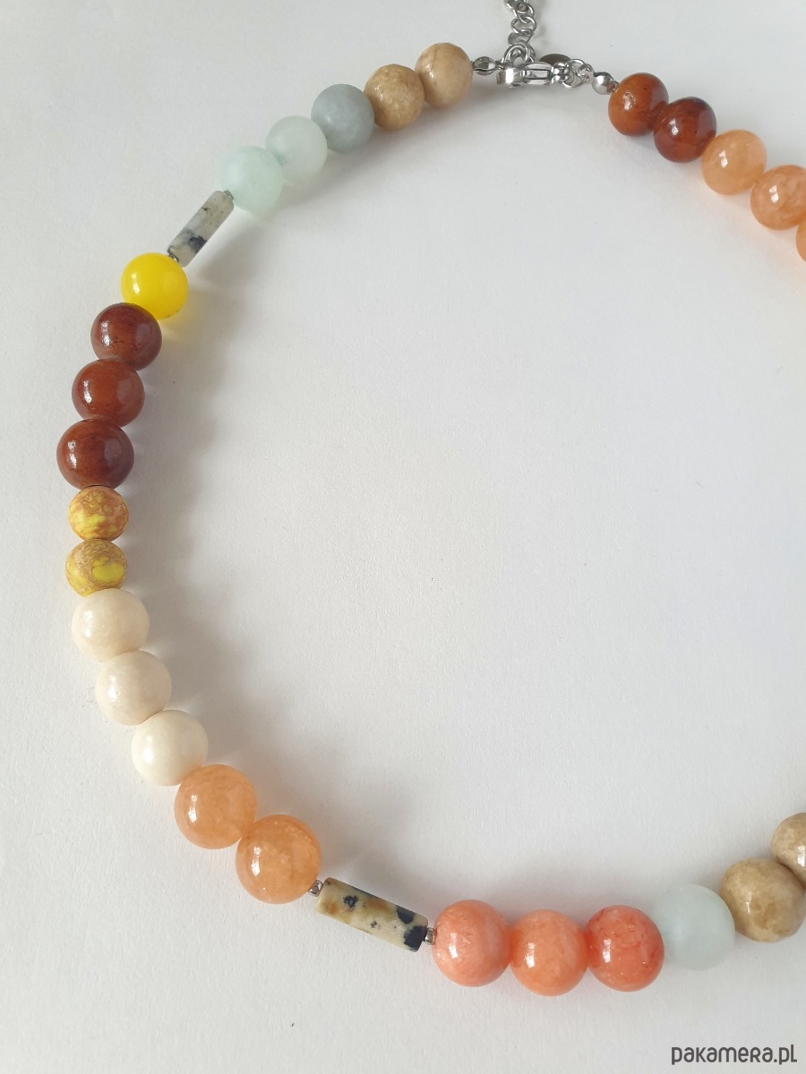 Wielobarwny, pastelowy naszyjnik z kolekcji BOHO ART inspirowanej sztuką Clare Grill i Mirco Marcelli. . Tworzony z kamieni kulek jadeitu barwionego , jaspisu dalmatynskiego i labrodorytu (patyczki) w kolorach aqua, jasno niebeiski, beż, brąz, krem, rudy, herbaciany, żółty. Na zdjęciu przykładowy naszyjnik, tworzę go na zamówienie z tych samych kamieni w tej samej tonacji kolorystycznej, ale mogą być minimalne różnice bo każdy kamień jest wyjątkowy.