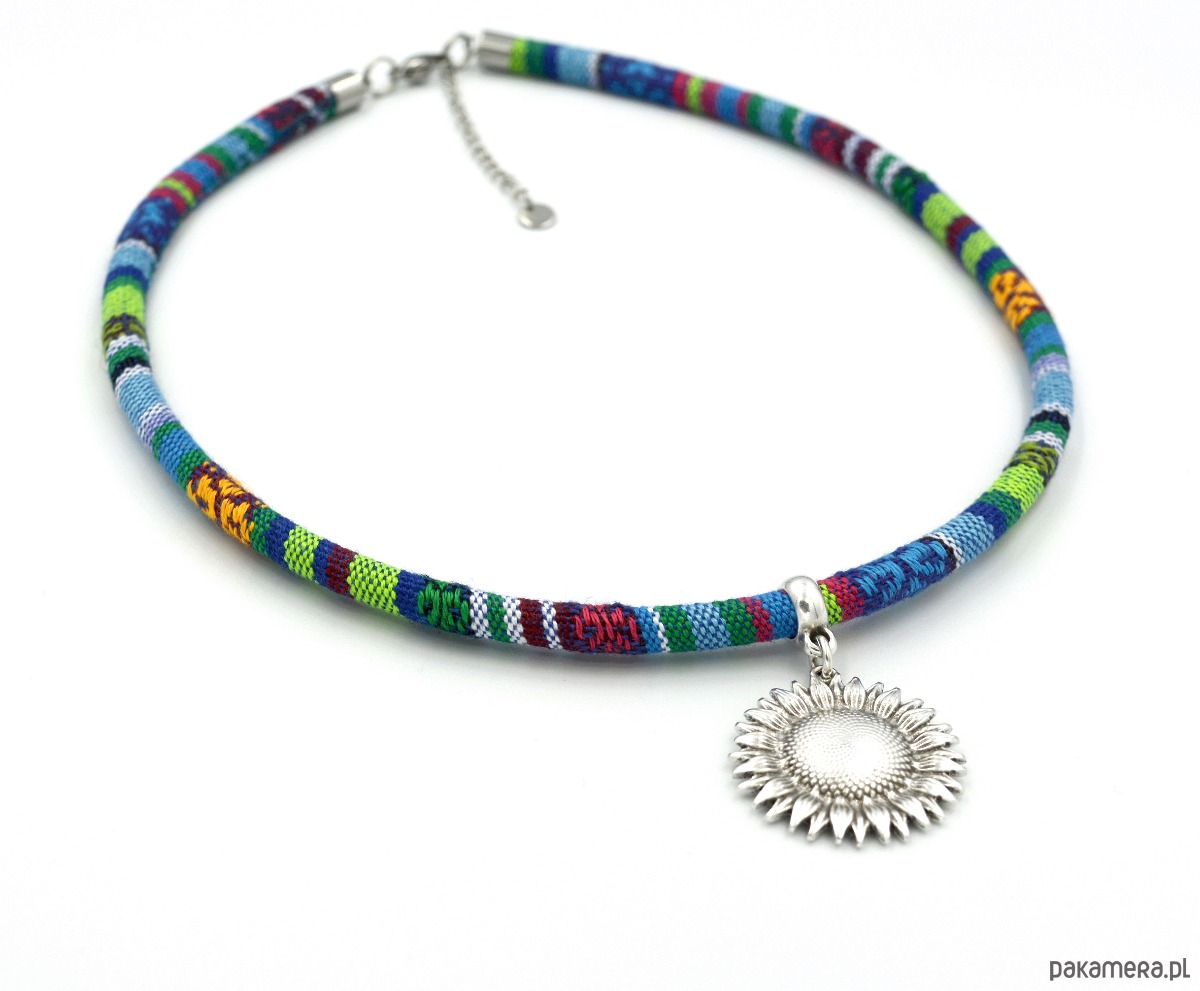 Barwny naszyjnik w stylu boho wykonany z szytego, okrągłego rzemienia-liny z tkaniny bawełnianej (śr. 6mm). Ozdobę naszyjnika stanowi cynowy wisiorek w kształcie kwiatu słonecznika o wymiarach ok. 31x29mm.