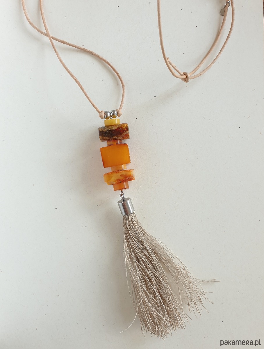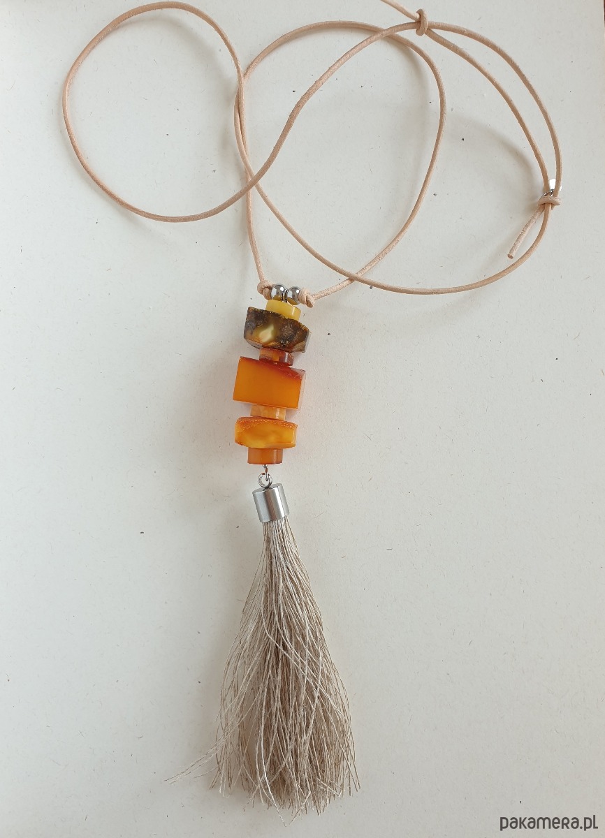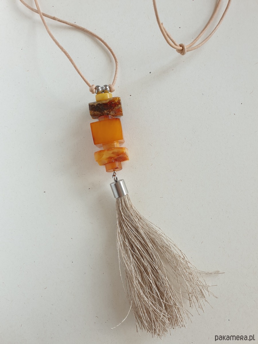 Naszyjnik boho, z bursztynem i lnianym chwostem, multikolor
