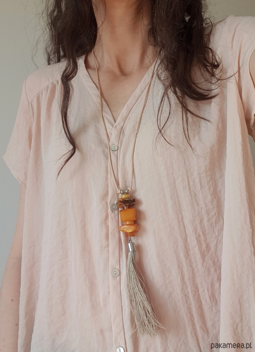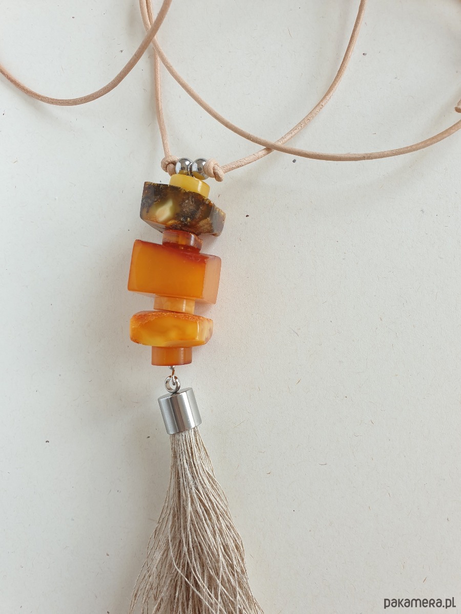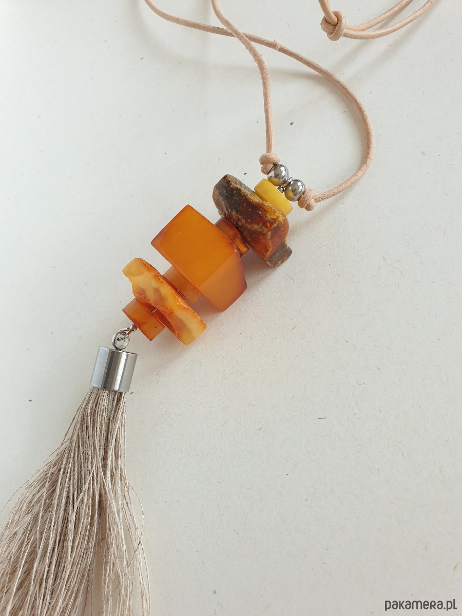 Naszyjnik boho, z bursztynem i lnianym chwostem, multikolor