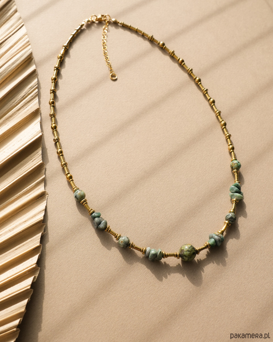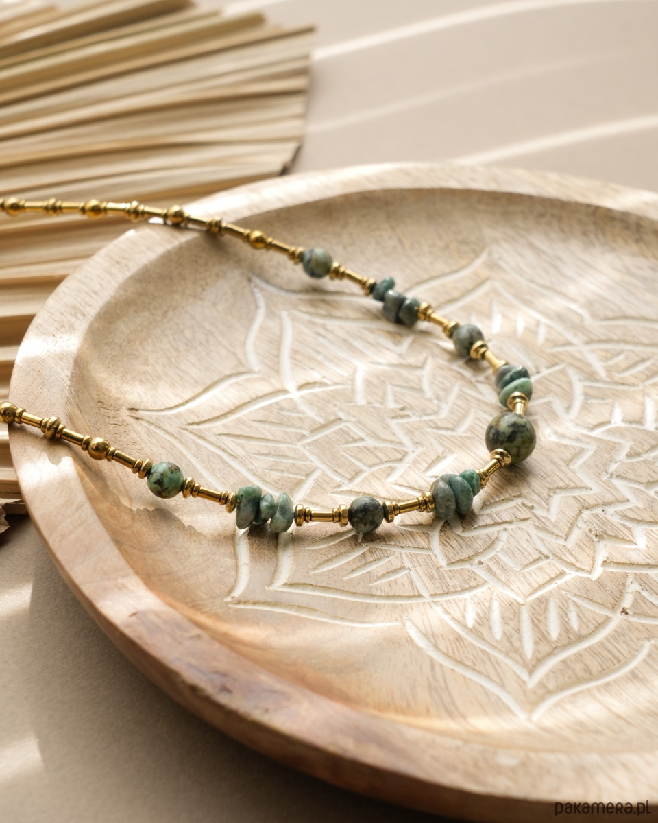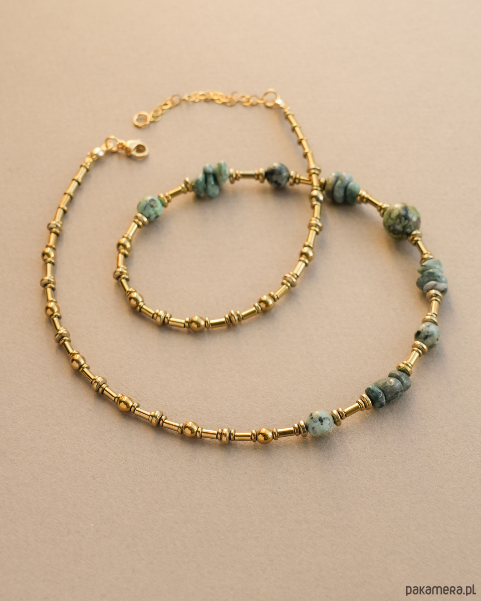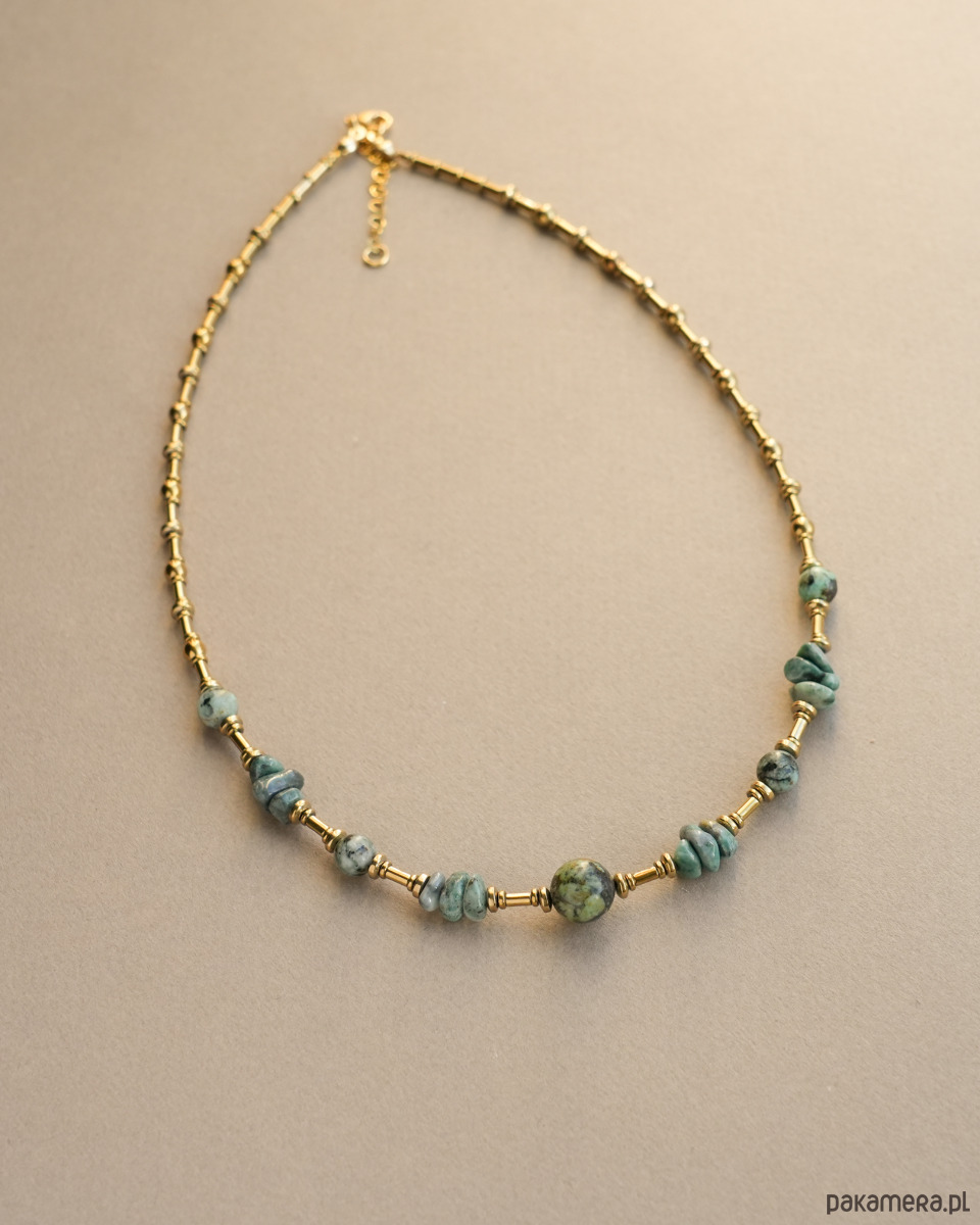 Unikatowy naszyjnik boho wykonany z TURKUSA AFRYKAŃSKIEGO (jaspisu) oraz złotego HEMATYTU. Zapięcie i łańcuszek to STAL SZLACHETNA w kolorze złotym.