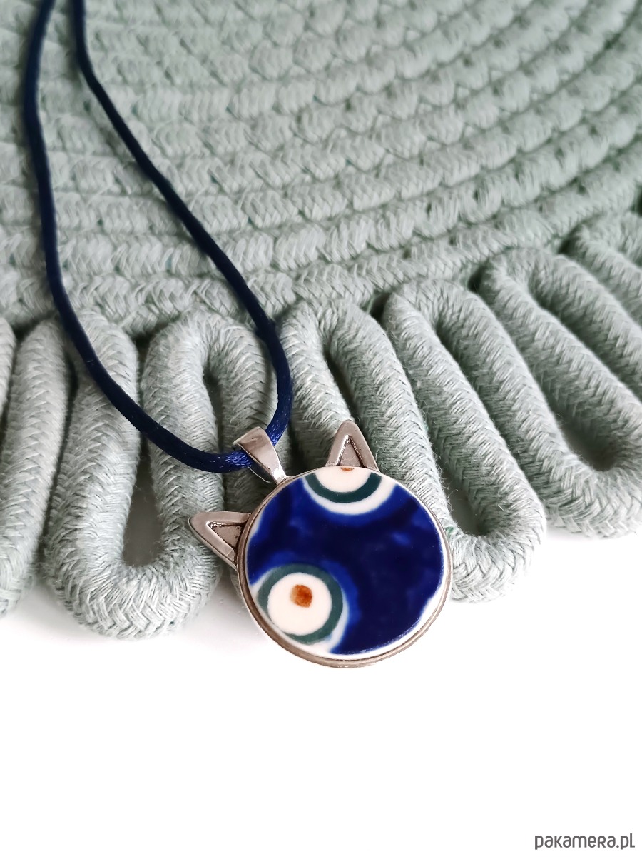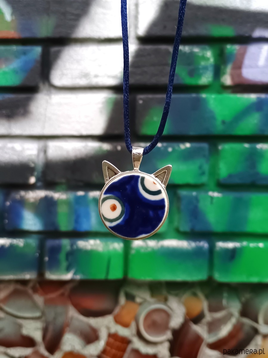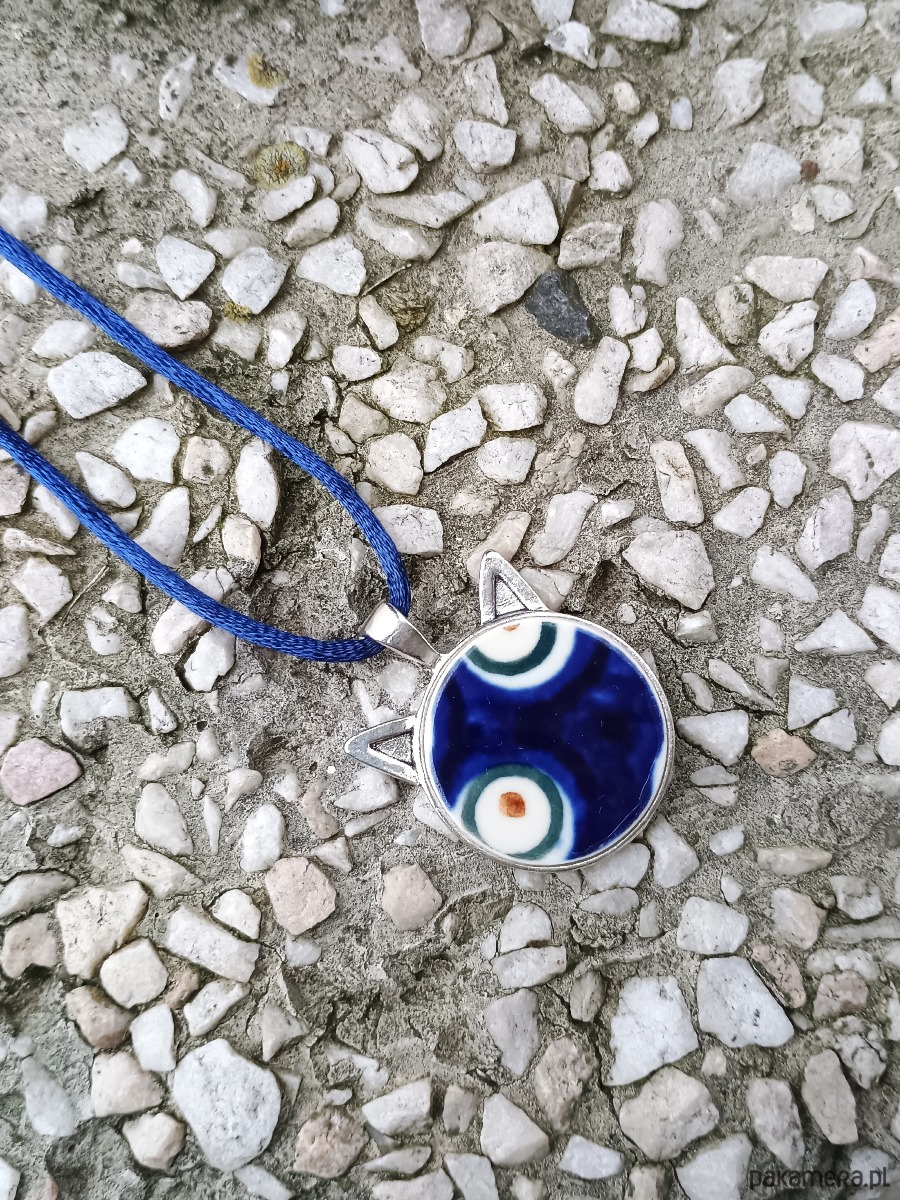 Ceramika w Bolesławcu i jego okolicach produkowana była już w XIV wieku. Do dziś najważniejszy surowiec, czyli glina wydobywany jest na miejscu, a tradycja wyrobu naczyń ceramicznych, rozwijana i kultywowana przez wieki - trwa. Bolesławiec jako marka, tworzona przez kilkadziesiąt różnych manufaktur, znana jest na całym świecie, a charakterystycznego wzoru w kobaltowe kropki nie sposób pomylić z żadnym innym. Co najbardziej wyróżnia Bolesławiec, to że szkliwo nakładane jest ręcznie, za pomocą stempelków z gąbki. Oto naszyjnik, który wykonałam z fragmentu ceramiki bolesławieckiej w dekoracji nr 8 (pawie oko). Fragment oszlifowałam w okrągły kształt i osadziłam w metalowej bazie z kocimi uszami w kolorze srebrnym. Ceramikę zeszlifowałam również z grubości - jest cieńsza niż pierwotnie, dzięki czemu wisior nie jest masywny. Brzegi pokryłam lakierem, co sprawia, że nie brudzą się i nie chłoną wilgoci. Do zawieszki dobrałam satynowy sznureczek w kolorze granatowym. Średnica elementu ceramicznego: 26 mm. Długość sznureczka w całości: ok. 80 cm (naszyjnik zakłada się przez głowę). Upcykling - nie reprodukuję wykorzystywanych wzorów, niczego nie domalowuję - wykorzystuję wyłącznie oryginalne naczynia i motywy, które się na nich znajdują. Tym samym, stłuczce z odzysku nadaję nowe życie.