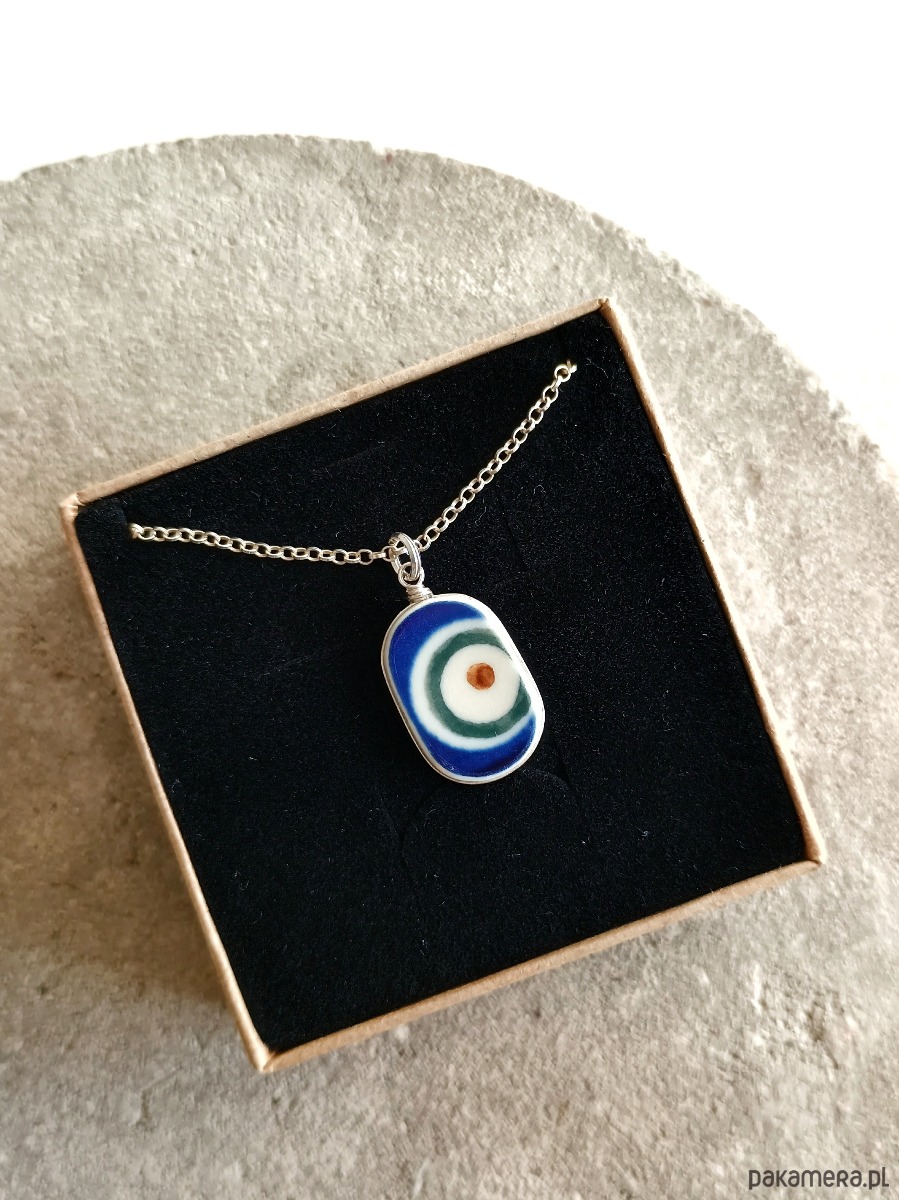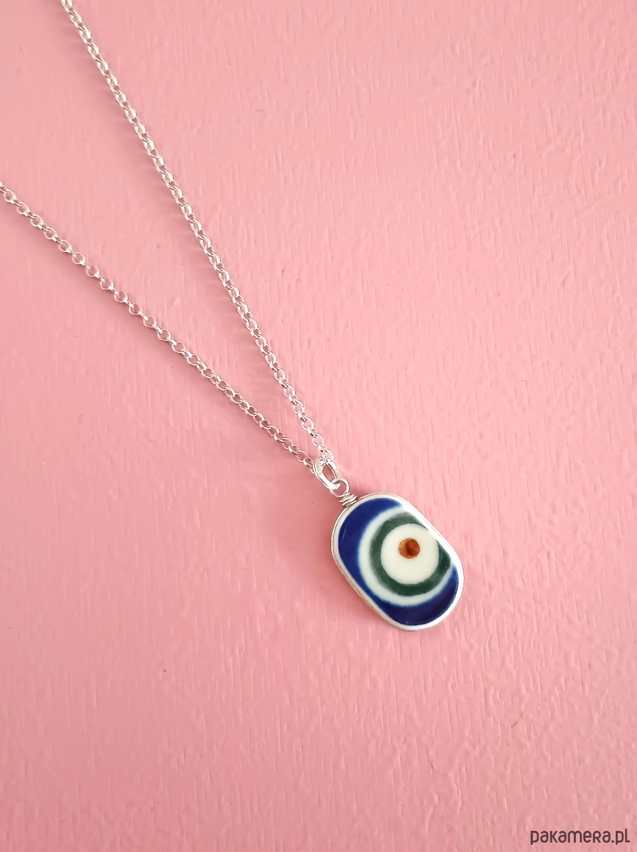 Ceramika w Bolesławcu i jego okolicach produkowana była już w XIV wieku. Do dziś najważniejszy surowiec, czyli glina wydobywany jest na miejscu, a tradycja wyrobu naczyń ceramicznych, rozwijana i kultywowana przez wieki - trwa. Bolesławiec jako marka, tworzona przez kilkadziesiąt różnych manufaktur, znana jest na całym świecie, a charakterystycznego wzoru w kobaltowe kropki nie sposób pomylić z żadnym innym. Co najbardziej wyróżnia Bolesławiec, to że szkliwo nakładane jest ręcznie, za pomocą stempelków z gąbki. Oto naszyjnik, który wykonałam z fragmentu stłuczonego kubka, właśnie z Bolesławca (dekoracja nr 8, pawie oko). Kawałek stłuczki oszlifowałam w owalny kształt, oprawiłam w drucik i zamocowałam na srebrnym łańcuszku (srebro 925). Ceramikę zeszlifowałam również z grubości - jest cieńsza niż pierwotnie, dzięki czemu zawieszka nie jest masywna. Brzegi i tył pokryłam lakierem, co sprawia, że nie brudzą się i nie chłoną wilgoci. Wymiary zawieszki ceramicznej: 13 x 19 mm. Długość łańcuszka w całości: 45 cm. Unikat - każdy z moich wyrobów występuje w jednym egzemplarzu. Upcykling - nie reprodukuję wykorzystywanych wzorów, niczego nie domalowuję - wykorzystuję wyłącznie oryginalne naczynia i motywy, które się na nich znajdują. Tym samym, stłuczce z odzysku nadaję nowe życie.