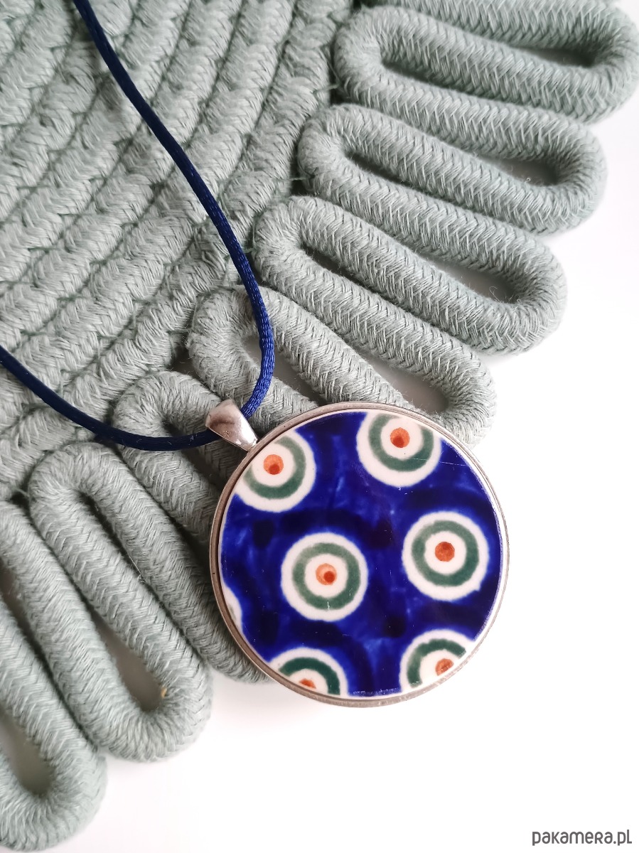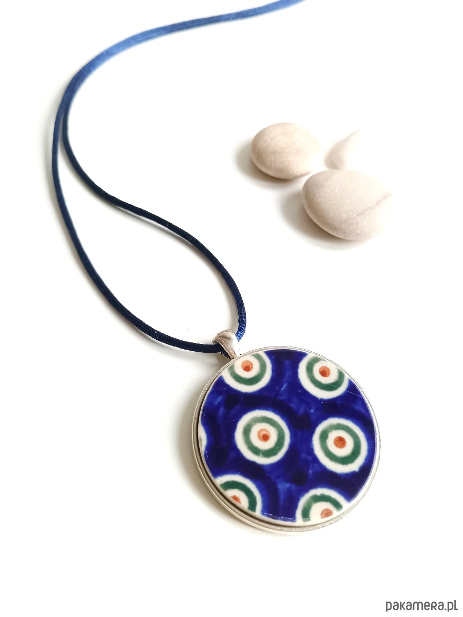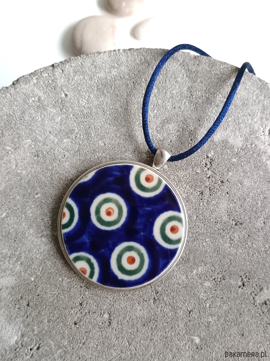 Ceramika w Bolesławcu i jego okolicach produkowana była już w XIV wieku. Do dziś najważniejszy surowiec, czyli glina wydobywany jest na miejscu, a tradycja wyrobu naczyń ceramicznych, rozwijana i kultywowana przez wieki - trwa. Bolesławiec jako marka, tworzona przez kilkadziesiąt różnych manufaktur, znana jest na całym świecie, a charakterystycznego wzoru w kobaltowe kropki nie sposób pomylić z żadnym innym. Co najbardziej wyróżnia Bolesławiec, to że szkliwo nakładane jest ręcznie, za pomocą stempelków z gąbki. Oto naszyjnik, który wykonałam właśnie z fragmentu ceramiki bolesławieckiej (dekoracja 8, pawie oko). Fragment oszlifowałam w okrągły kształt i osadziłam w metalowej bazie w kolorze srebrnym. Ceramikę zeszlifowałam również z grubości - jest cieńsza niż pierwotnie, dzięki czemu wisior nie jest masywny. Brzegi pokryłam lakierem, co sprawia, że nie brudzą się i nie chłoną wilgoci. Do zawieszki dobrałam satynowy sznureczek w kolorze granatowym. Średnica elementu ceramicznego: 45 mm. Długość sznureczka w całości: ok. 80 cm (naszyjnik zakłada się przez głowę). Sznurek łatwo skrócić lub dobrać swój ulubiony rzemień lub łańcuszek. Upcykling - nie reprodukuję wykorzystywanych wzorów, niczego nie domalowuję - wykorzystuję wyłącznie oryginalne naczynia i motywy, które się na nich znajdują. Tym samym, stłuczce z odzysku nadaję nowe życie.