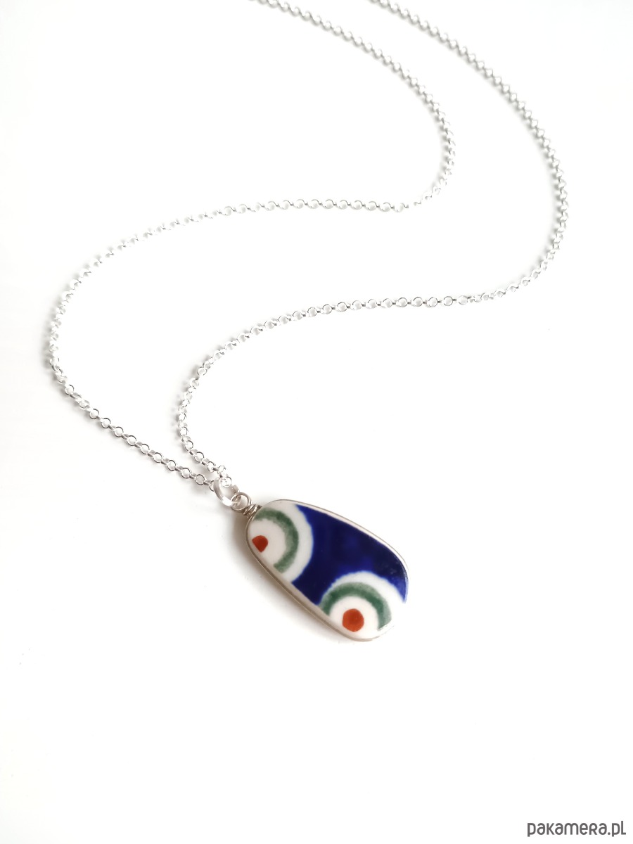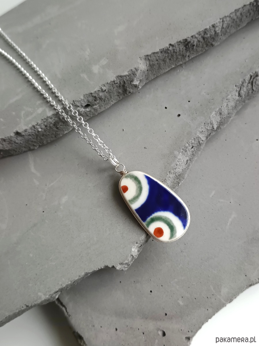 Ceramika w Bolesławcu i jego okolicach produkowana była już w XIV wieku. Do dziś najważniejszy surowiec, czyli glina wydobywany jest na miejscu, a tradycja wyrobu naczyń ceramicznych, rozwijana i kultywowana przez wieki - trwa. Bolesławiec jako marka, tworzona przez kilkadziesiąt różnych manufaktur, znana jest na całym świecie, a charakterystycznego wzoru w kobaltowe kropki nie sposób pomylić z żadnym innym. Co najbardziej wyróżnia Bolesławiec, to że szkliwo nakładane jest ręcznie, za pomocą stempelków z gąbki. Oto naszyjnik, który wykonałam z fragmentu stłuczonego kubka, właśnie z Bolesławca (dekoracja nr 8, pawie oko). Kawałek stłuczki oszlifowałam w owalny kształt, oprawiłam w drucik i zamocowałam na srebrnym łańcuszku (srebro 925). Ceramikę zeszlifowałam również z grubości - jest cieńsza niż pierwotnie, dzięki czemu zawieszka nie jest masywna. Brzegi i tył pokryłam lakierem, co sprawia, że nie brudzą się i nie chłoną wilgoci. Wymiary zawieszki ceramicznej: 14 x 25 mm. Długość łańcuszka w całości: 45 cm. Unikat - każdy z moich wyrobów występuje w jednym egzemplarzu. Upcykling - nie reprodukuję wykorzystywanych wzorów, niczego nie domalowuję - wykorzystuję wyłącznie oryginalne naczynia i motywy, które się na nich znajdują. Tym samym, stłuczce z odzysku nadaję nowe życie.