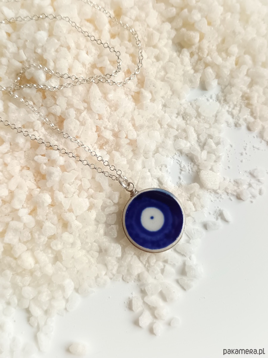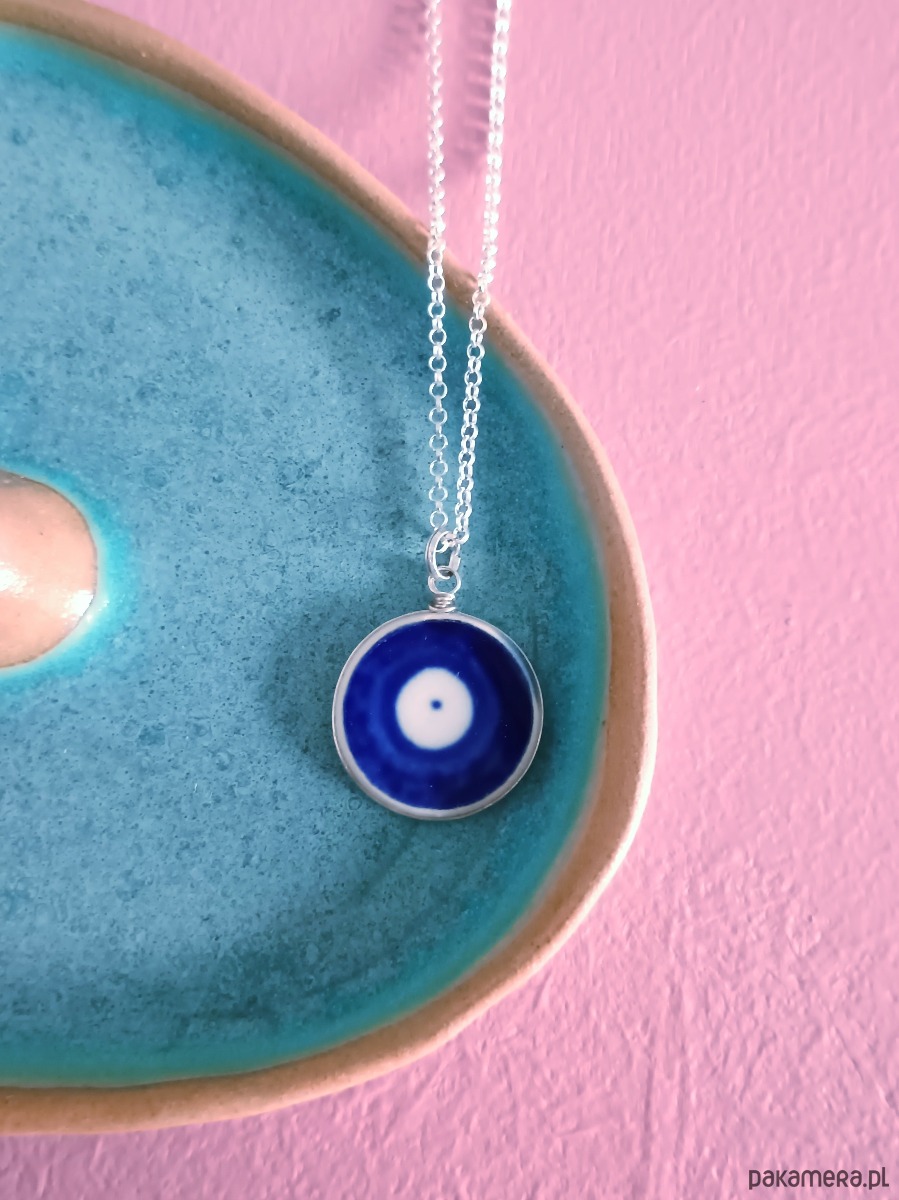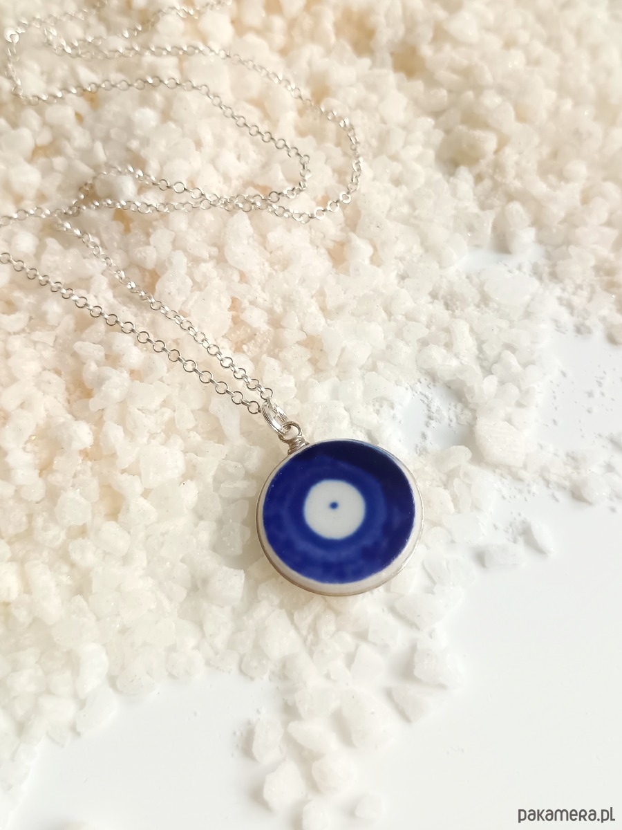 Ceramika w Bolesławcu i jego okolicach produkowana była już w XIV wieku. Do dziś najważniejszy surowiec, czyli glina wydobywany jest na miejscu, a tradycja wyrobu naczyń ceramicznych, rozwijana i kultywowana przez wieki - trwa. Bolesławiec jako marka, tworzona przez kilkadziesiąt różnych manufaktur, znana jest na całym świecie, a charakterystycznego wzoru w kobaltowe kropki nie sposób pomylić z żadnym innym. Co najbardziej wyróżnia Bolesławiec, to że szkliwo nakładane jest ręcznie, za pomocą stempelków z gąbki. Oto naszyjnik, który wykonałam z fragmentu stłuczonego talerza, właśnie z Bolesławca (dekoracja nr 42). Kawałek stłuczki oszlifowałam nadając okrągły kształt, oprawiłam w drucik i zamocowałam na srebrnym łańcuszku (srebro 925). Ceramikę zeszlifowałam również z grubości - jest cieńsza niż pierwotnie, dzięki czemu zawieszka nie jest masywna. Brzegi pokryłam lakierem, co sprawia, że nie brudzą się i nie chłoną wilgoci. Średnica zawieszki ceramicznej: 19 mm. Długość łańcuszka w całości: 45 cm. Unikat - każdy z moich wyrobów występuje w jednym egzemplarzu. Upcykling - nie reprodukuję wykorzystywanych wzorów, niczego nie domalowuję - wykorzystuję wyłącznie oryginalne naczynia i motywy, które się na nich znajdują. Tym samym, stłuczce z odzysku nadaję nowe życie.