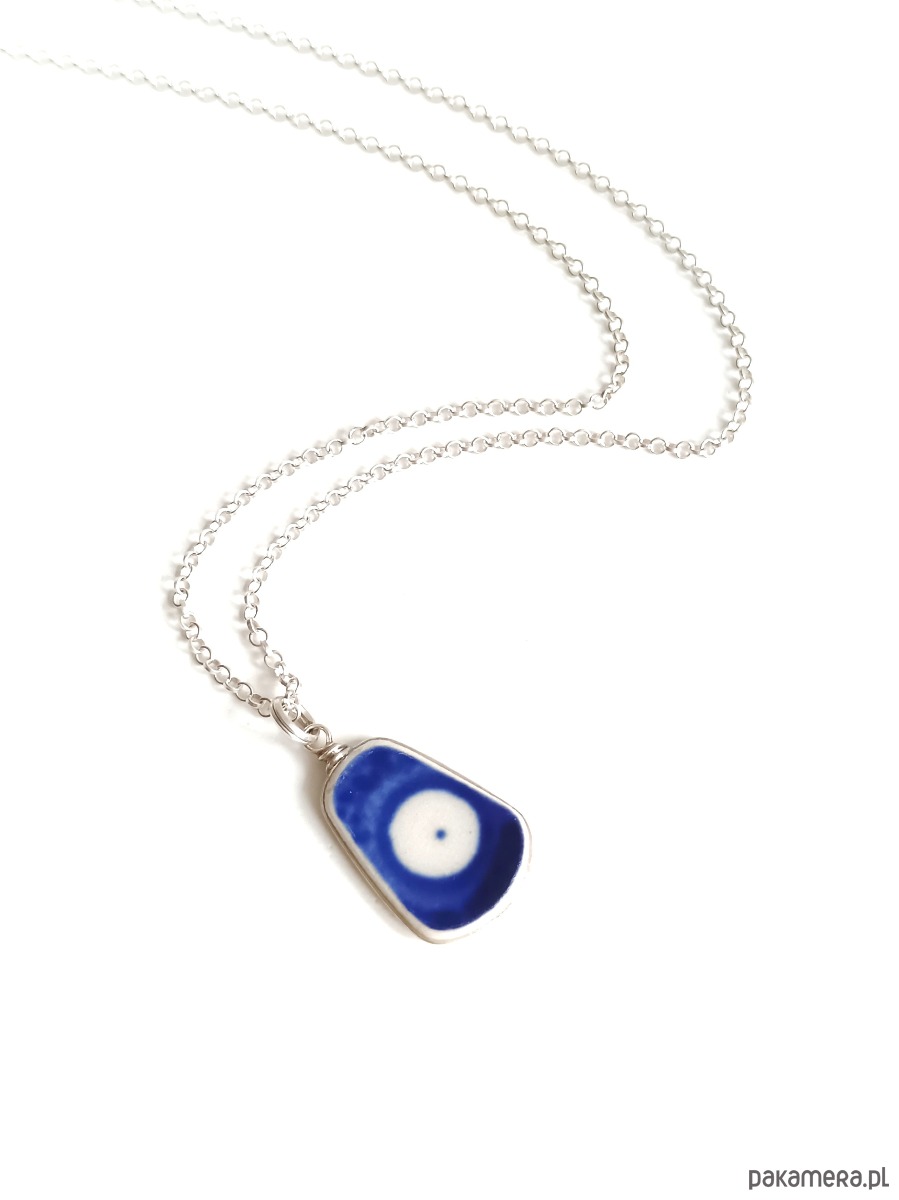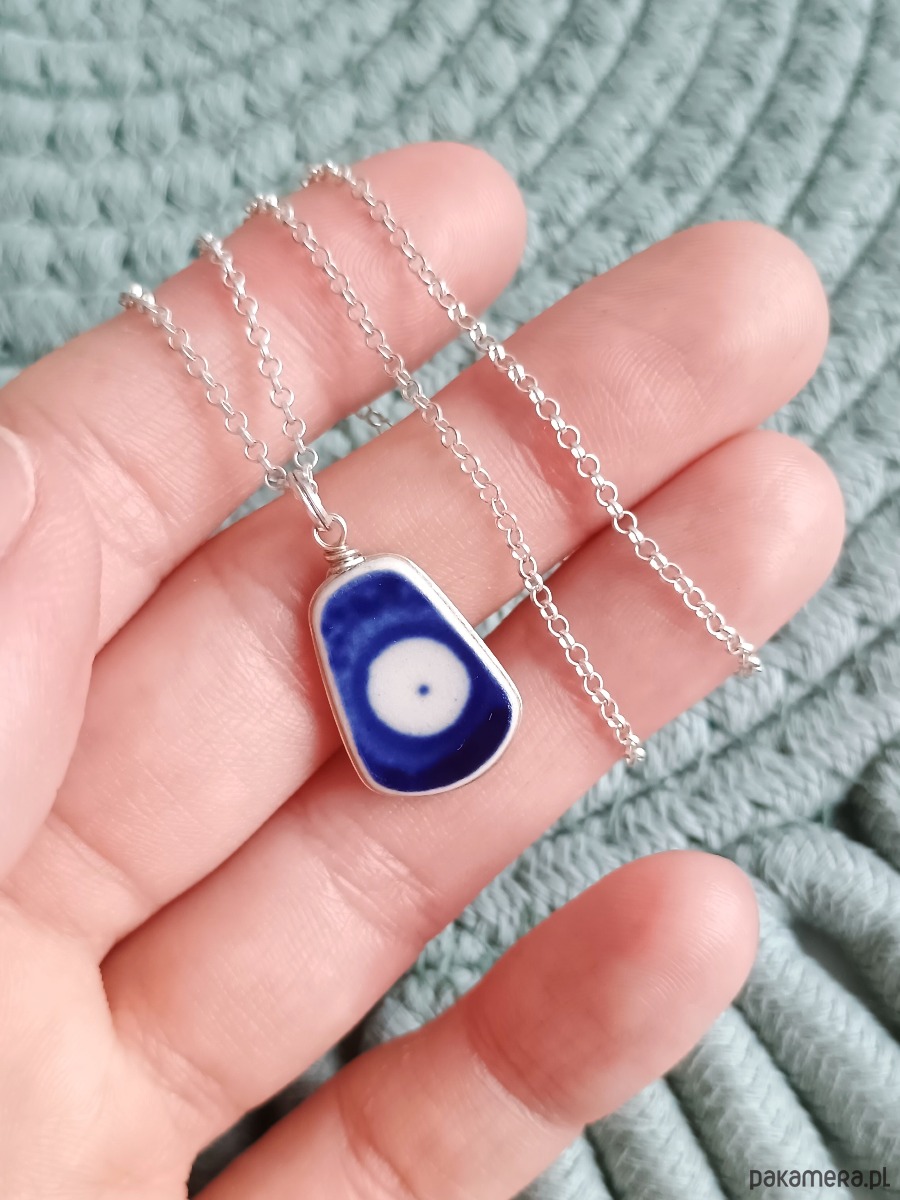 Ceramika w Bolesławcu i jego okolicach produkowana była już w XIV wieku. Do dziś najważniejszy surowiec, czyli glina wydobywany jest na miejscu, a tradycja wyrobu naczyń ceramicznych, rozwijana i kultywowana przez wieki - trwa. Bolesławiec jako marka, tworzona przez kilkadziesiąt różnych manufaktur, znana jest na całym świecie, a charakterystycznego wzoru w kobaltowe kropki nie sposób pomylić z żadnym innym. Co najbardziej wyróżnia Bolesławiec, to że szkliwo nakładane jest ręcznie, za pomocą stempelków z gąbki. Oto naszyjnik, który wykonałam z fragmentu stłuczonego kubka, właśnie z Bolesławca (dekoracja nr 42). Kawałek stłuczki oszlifowałam w opływowy kształt, oprawiłam w drucik i zamocowałam na srebrnym łańcuszku (srebro 925). Ceramikę zeszlifowałam również z grubości - jest cieńsza niż pierwotnie, dzięki czemu zawieszka nie jest masywna. Brzegi i tył pokryłam lakierem, co sprawia, że nie brudzą się i nie chłoną wilgoci. Wymiary zawieszki ceramicznej: 13 x 18 mm. Długość łańcuszka w całości: 45 cm. Unikat - każdy z moich wyrobów występuje w jednym egzemplarzu. Upcykling - nie reprodukuję wykorzystywanych wzorów, niczego nie domalowuję - wykorzystuję wyłącznie oryginalne naczynia i motywy, które się na nich znajdują. Tym samym, stłuczce z odzysku nadaję nowe życie.