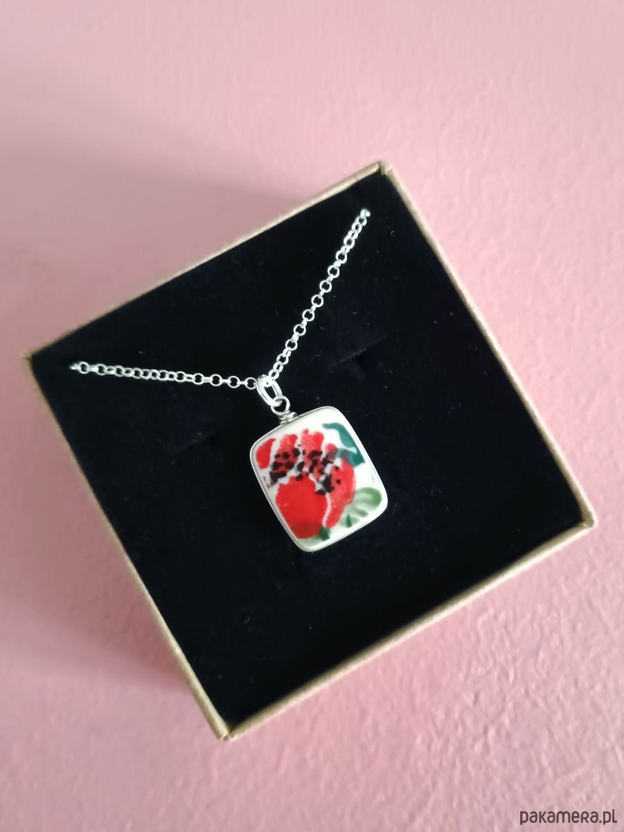 Ceramika w Bolesławcu i jego okolicach produkowana była już w XIV wieku. Do dziś najważniejszy surowiec, czyli glina wydobywany jest na miejscu, a tradycja wyrobu naczyń ceramicznych, rozwijana i kultywowana przez wieki - trwa. Bolesławiec jako marka, tworzona przez kilkadziesiąt różnych manufaktur, znana jest na całym świecie, a charakterystycznego wzoru w kobaltowe kropki nie sposób pomylić z żadnym innym. Co najbardziej wyróżnia Bolesławiec, to że szkliwo nakładane jest ręcznie, za pomocą stempelków z gąbki. Oto naszyjnik, który wykonałam z fragmentu stłuczonego kubka, wykonanego właśnie w Bolesławcu. Kawałek stłuczki oszlifowałam w opływowy prostokątny kształt, oprawiłam w drucik i zamocowałam na srebrnym łańcuszku (srebro 925). Ceramikę zeszlifowałam również z grubości - jest cieńsza niż pierwotnie, dzięki czemu zawieszka nie jest masywna. Brzegi i tył pokryłam lakierem, co sprawia, że nie brudzą się i nie chłoną wilgoci. Wymiary zawieszki ceramicznej: 15 x 17 mm. Długość łańcuszka w całości: 45 cm. Unikat - każdy z moich wyrobów występuje w jednym egzemplarzu. Upcykling - nie reprodukuję wykorzystywanych wzorów, niczego nie domalowuję - wykorzystuję wyłącznie oryginalne naczynia i motywy, które się na nich znajdują. Tym samym, stłuczce z odzysku nadaję nowe życie.
