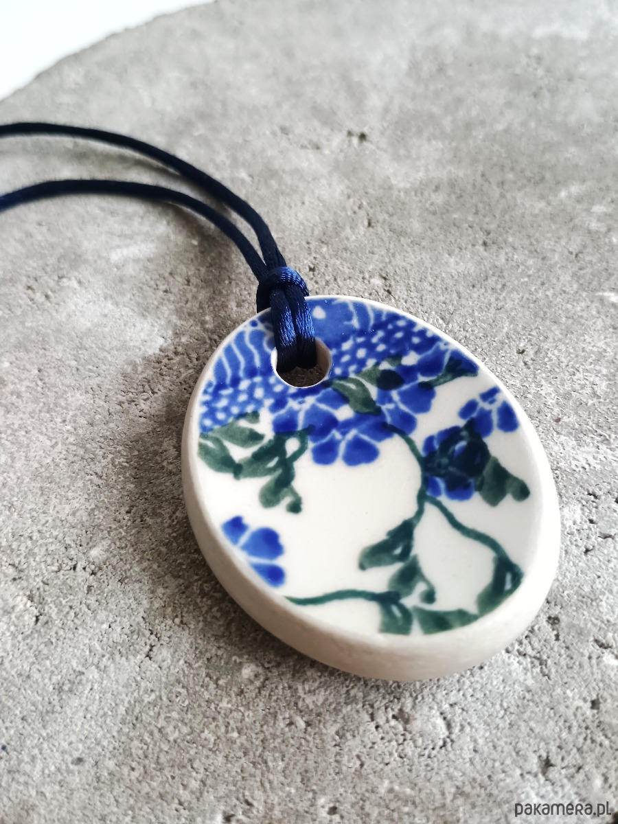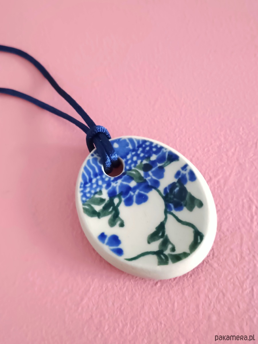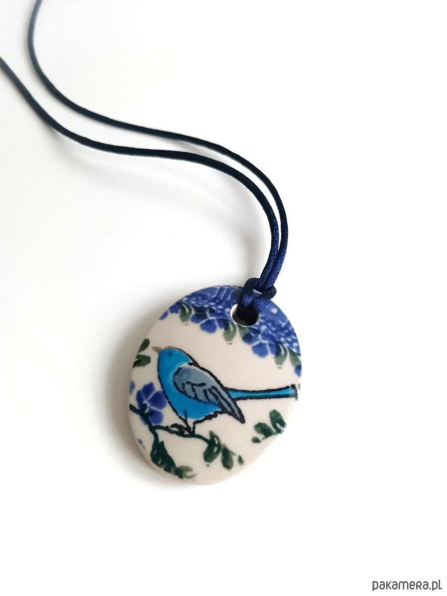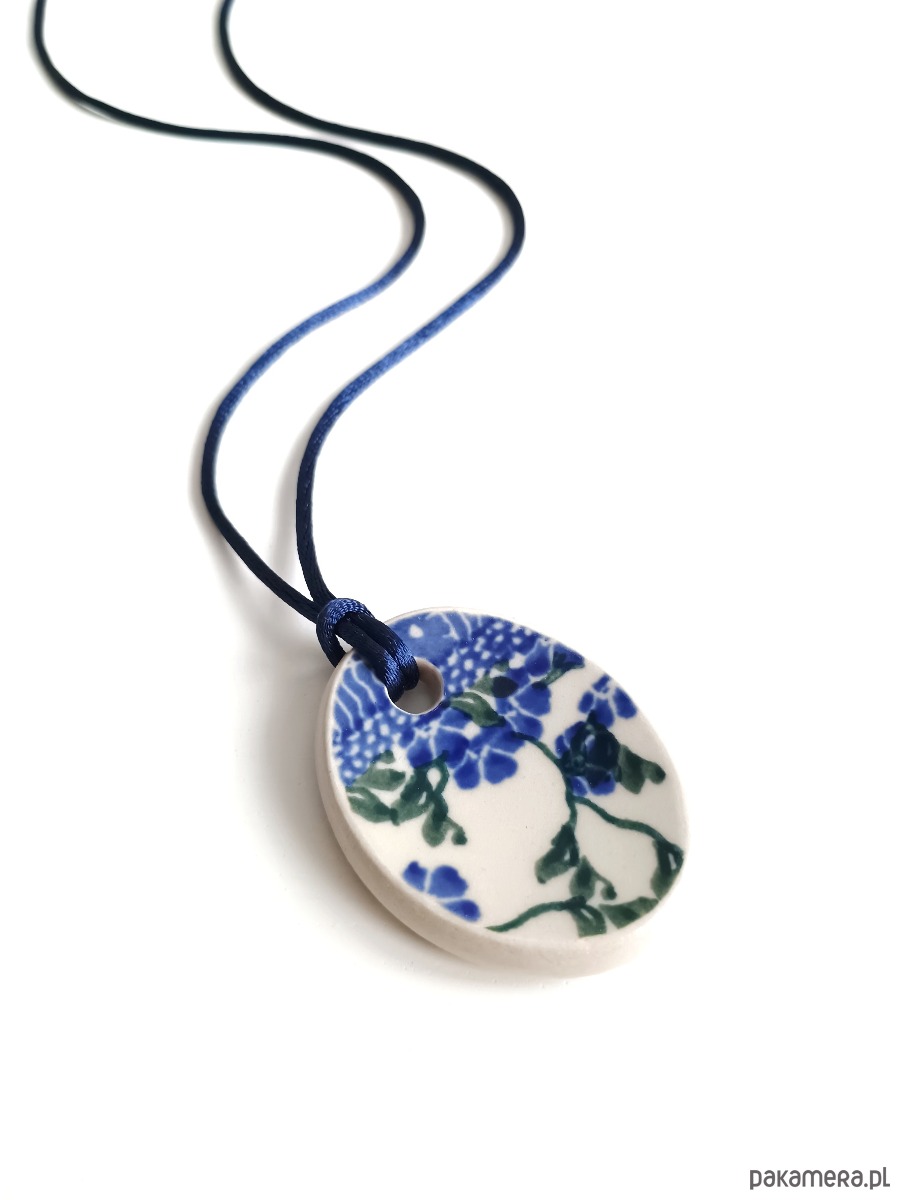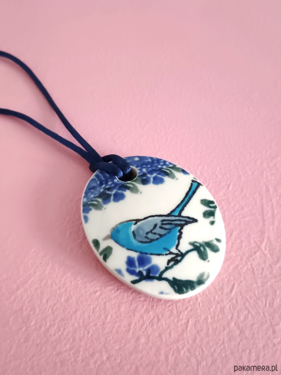Ceramika w Bolesławcu i jego okolicach produkowana była już w XIV wieku. Do dziś najważniejszy surowiec, czyli glina wydobywany jest na miejscu, a tradycja wyrobu naczyń ceramicznych, rozwijana i kultywowana przez wieki - trwa. Bolesławiec jako marka, tworzona przez kilkadziesiąt różnych manufaktur, znana jest na całym świecie, a charakterystycznego wzoru w kobaltowe kropki nie sposób pomylić z żadnym innym. Co najbardziej wyróżnia Bolesławiec, to że szkliwo nakładane jest ręcznie, za pomocą stempelków z gąbki. Oto naszyjnik, który wykonałam właśnie z fragmentu ceramiki bolesławieckiej. Fragment ze wzorem widocznym po obu stronach i motywem ptaka z jednej strony oszlifowałam w owalny kształt. Brzegi pokryłam lakierem, co sprawia, że nie brudzą się i nie chłoną wilgoci. Do zawieszki dobrałam satynowy sznureczek w kolorze granatowym. Wymiary elementu ceramicznego: 41 x 51 mm. Długość sznureczka w całości: ok. 80 cm (naszyjnik zakłada się przez głowę). Sznurek łatwo skrócić lub dobrać swój ulubiony rzemień lub łańcuszek. Upcykling - nie reprodukuję wykorzystywanych wzorów, niczego nie domalowuję - wykorzystuję wyłącznie oryginalne naczynia i motywy, które się na nich znajdują. Tym samym, stłuczce z odzysku nadaję nowe życie.