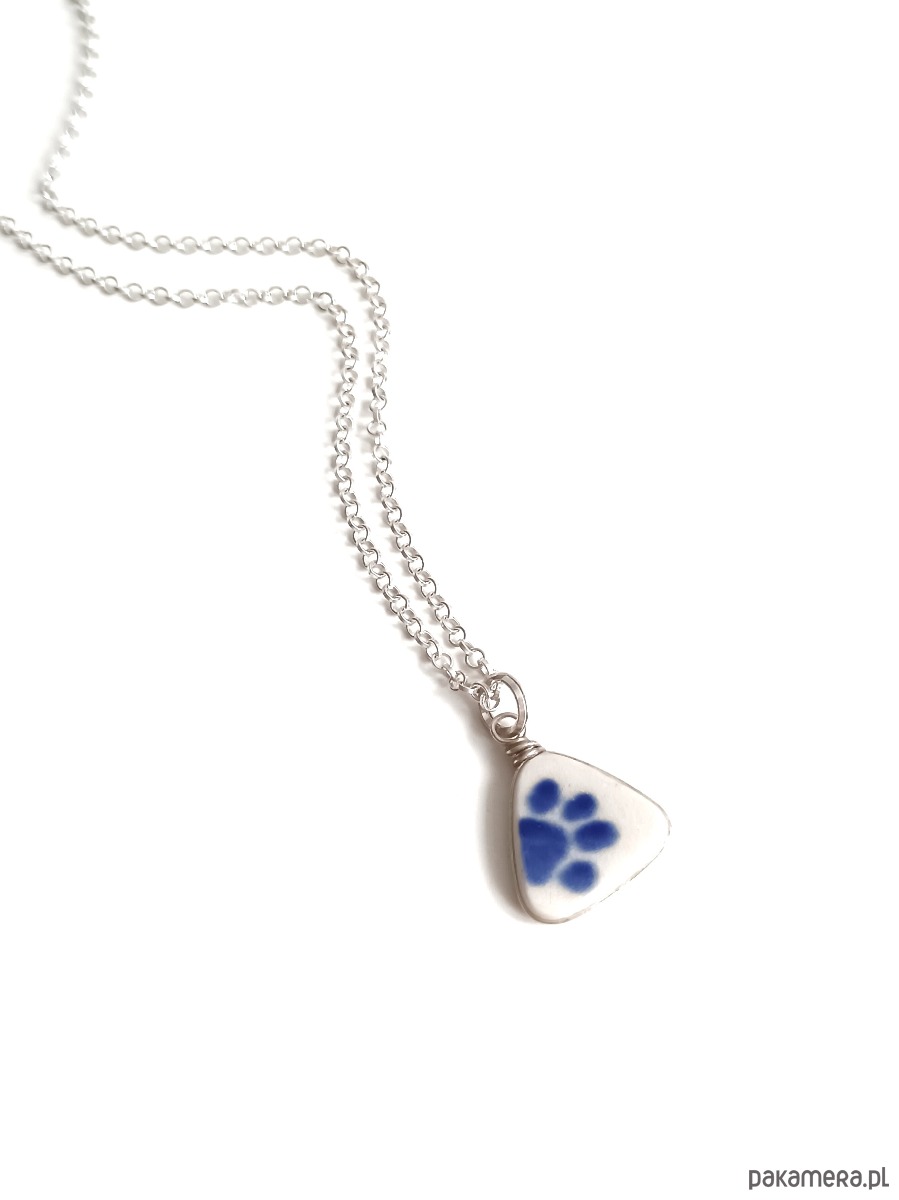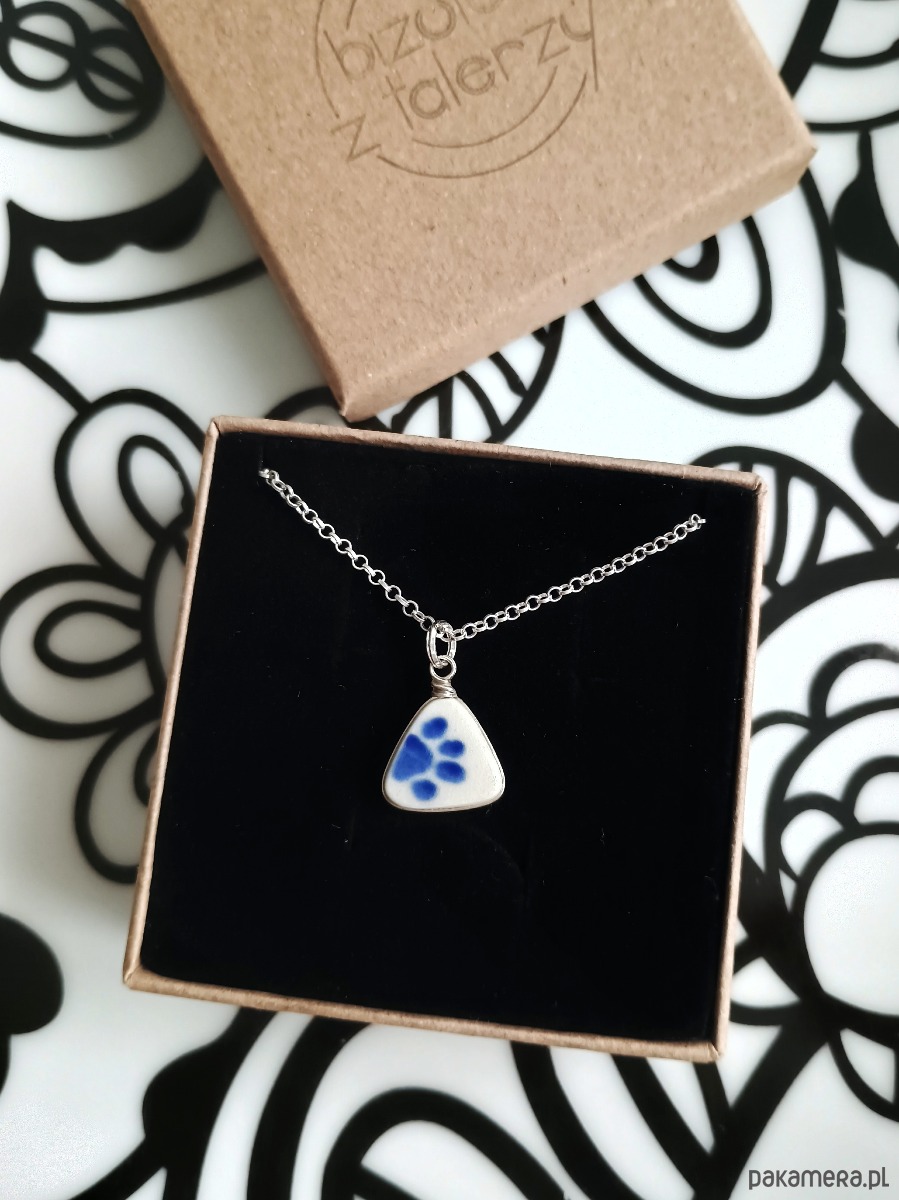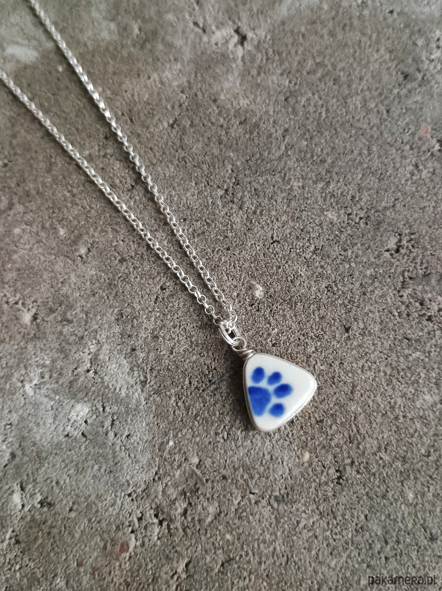 Ceramika w Bolesławcu i jego okolicach produkowana była już w XIV wieku. Do dziś najważniejszy surowiec, czyli glina wydobywany jest na miejscu, a tradycja wyrobu naczyń ceramicznych, rozwijana i kultywowana przez wieki - trwa. Bolesławiec jako marka, tworzona przez kilkadziesiąt różnych manufaktur, znana jest na całym świecie, a charakterystycznego wzoru w kobaltowe kropki nie sposób pomylić z żadnym innym. Co najbardziej wyróżnia Bolesławiec, to że szkliwo nakładane jest ręcznie, za pomocą stempelków z gąbki. Oto naszyjnik, który wykonałam z fragmentu stłuczonego wazonu, właśnie z Bolesławca. Kawałek stłuczki z motywem łapki oszlifowałam nadając trójkątny kształt, oprawiłam w drucik i zamocowałam na srebrnym łańcuszku (srebro 925). Ceramikę zeszlifowałam również z grubości - jest cieńsza niż pierwotnie, dzięki czemu zawieszka nie jest masywna. Brzegi i tył pokryłam lakierem, co sprawia, że nie brudzą się i nie chłoną wilgoci. Wymiary zawieszki ceramicznej: 12 x 12 mm. Długość łańcuszka w całości: 45 cm. Unikat - każdy z moich wyrobów występuje w jednym egzemplarzu. Upcykling - nie reprodukuję wykorzystywanych wzorów, niczego nie domalowuję - wykorzystuję wyłącznie oryginalne naczynia i motywy, które się na nich znajdują. Tym samym, stłuczce z odzysku nadaję nowe życie.