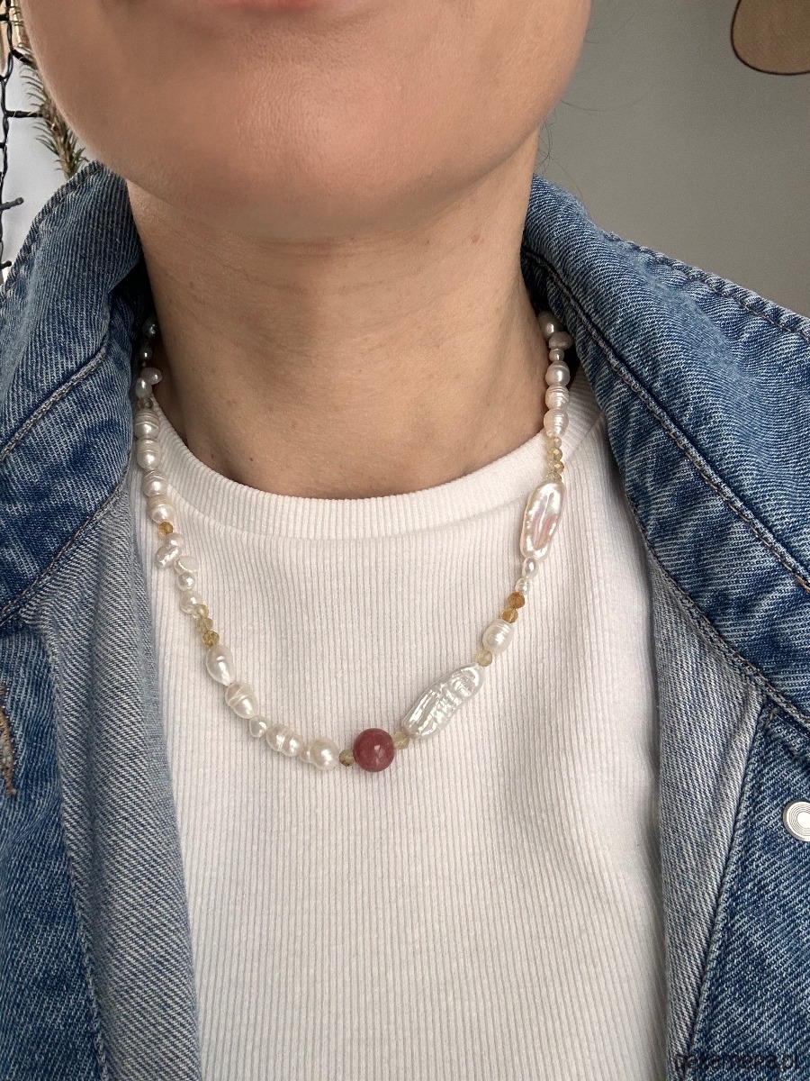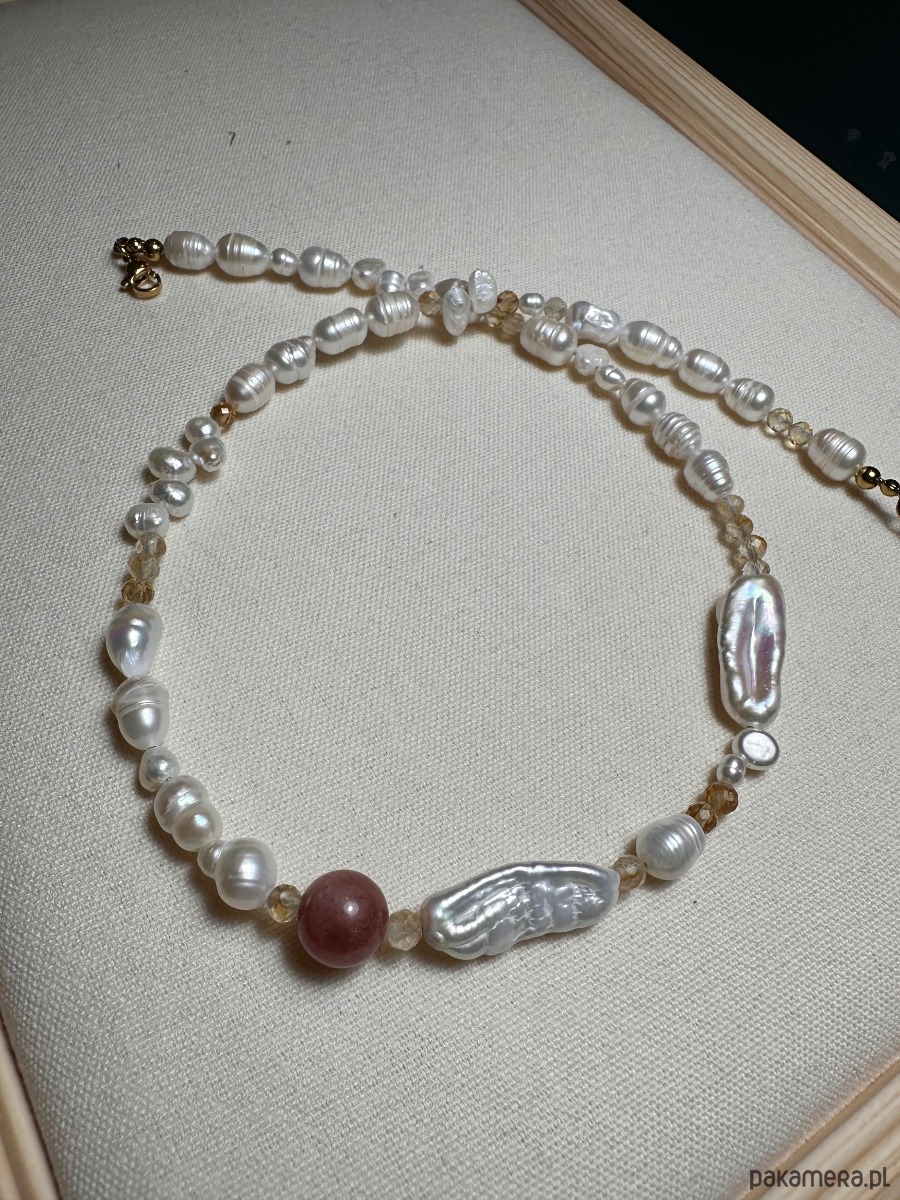 Przepiękny naszyjnik wykonany ręcznie z różnego rodzaju pereł naturalnych słodkowodnych. Niezwykle interesująca kompilacja kształtów beczułkowych, spłaszczonych, większych, mniejszych, podłużnych, okrągłych. Naszyjnik w którym perły świetnie dogadują się z cytrynem który mieni się pięknie , kamień jest falsetowany. Wisienką na torcie jest różowy Jadeit .