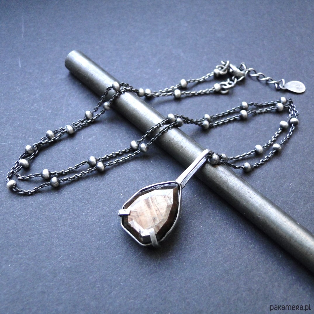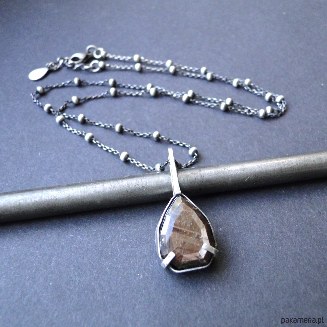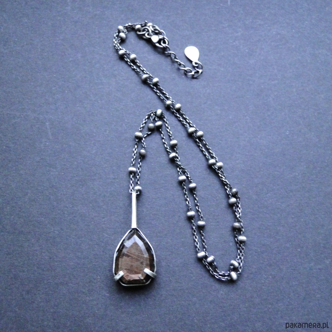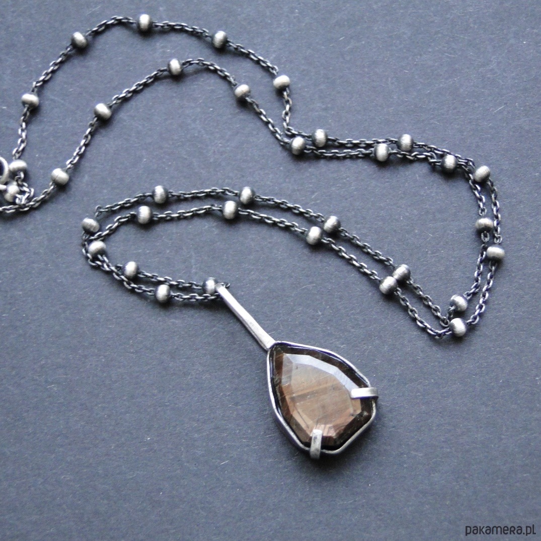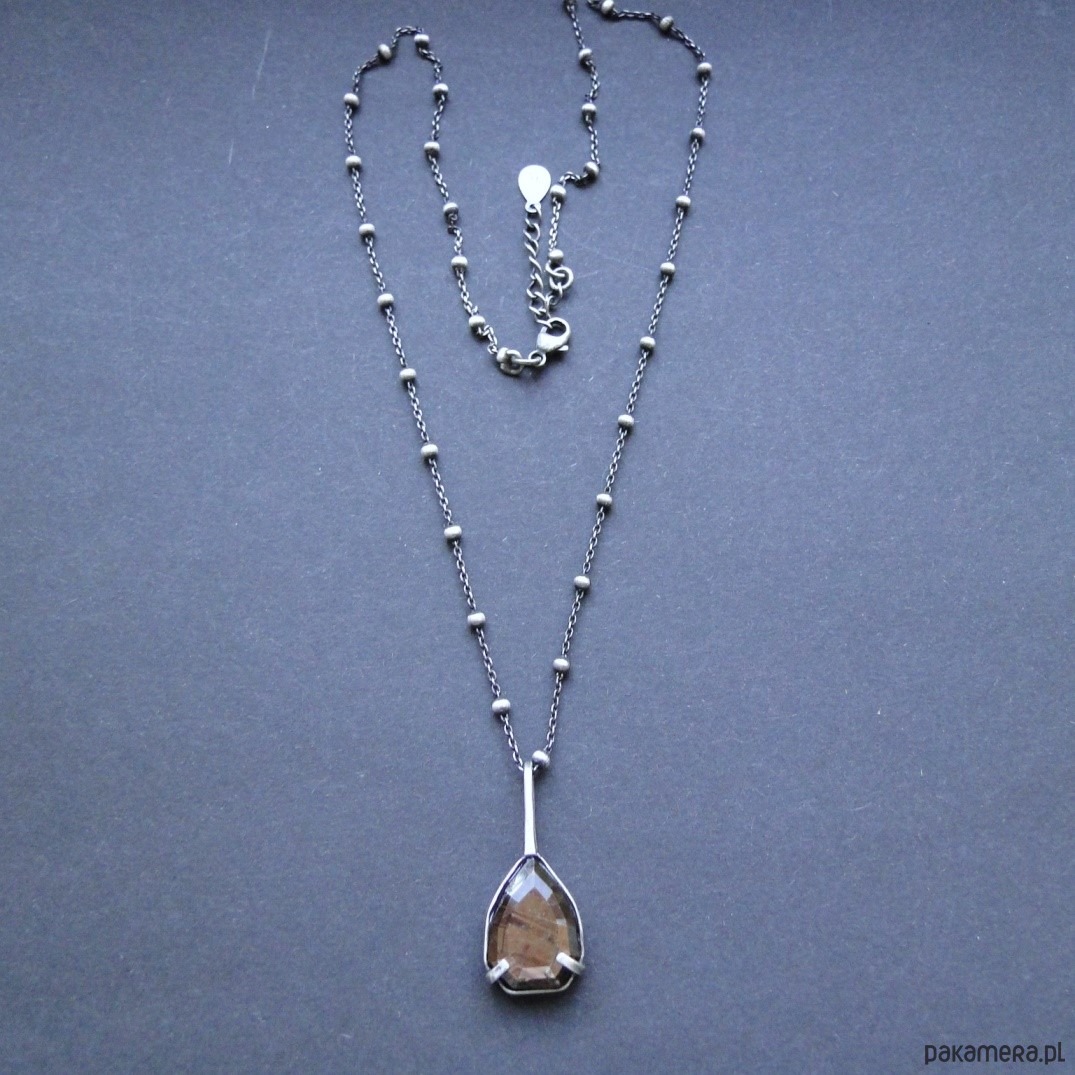Piękny unikatowy naszyjnik wykonany w pojedynczym egzemplarzu. Srebro 925,oksydowane i szorowane. Kamień: imponuj acy naturalny szafir brązowy,elkko surowy, z brylantowym szlifem. Pięknie odbija światło.Kamień ma wym.15x12mm,oprawiłam go w prostą surową kasetkę z dwoma łapkami. Obwód łałncuszka- 45 cm plus 3 cm przedłużki. Nie moczyć w wodzie.
