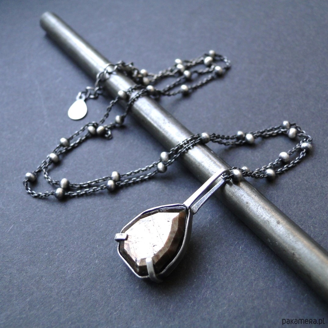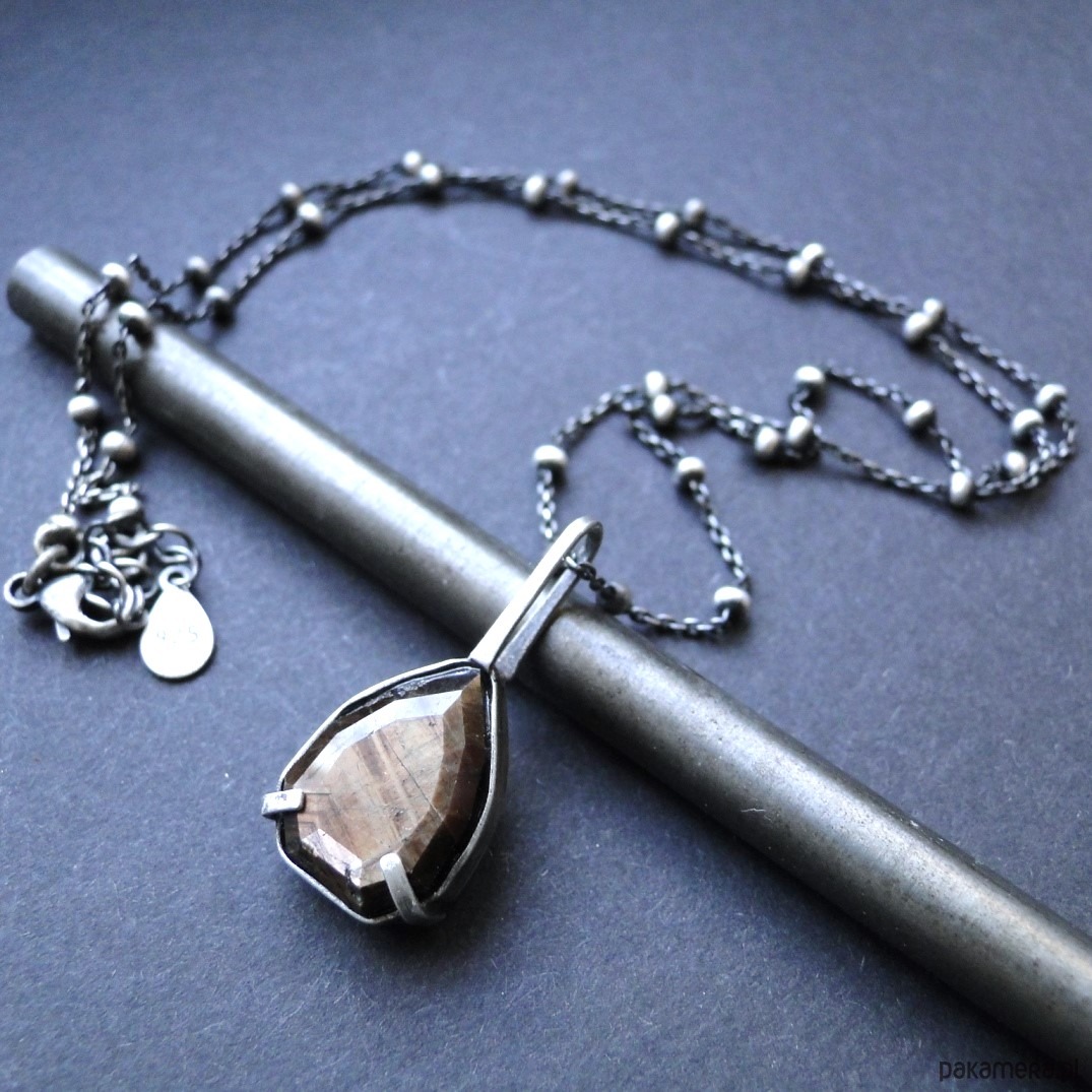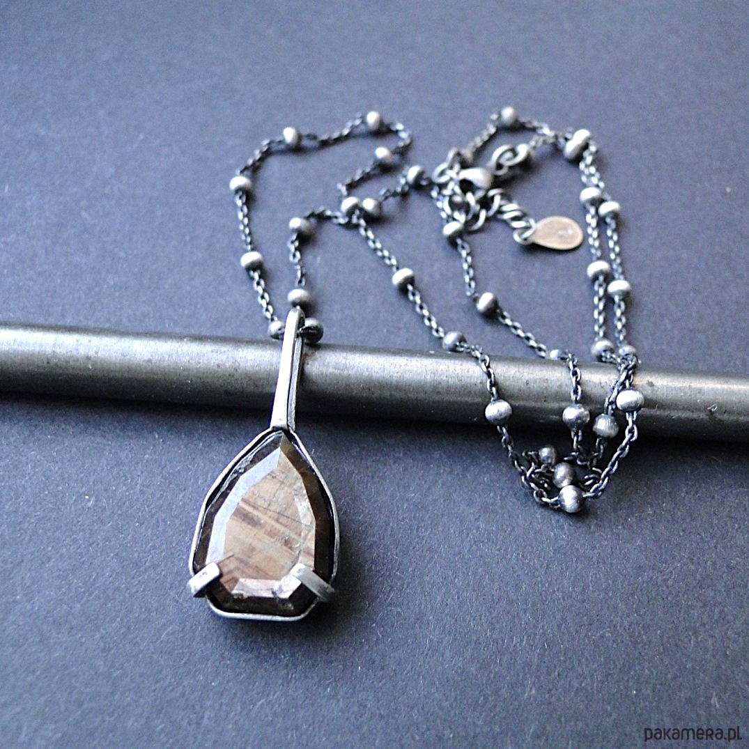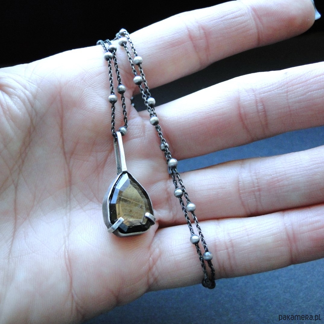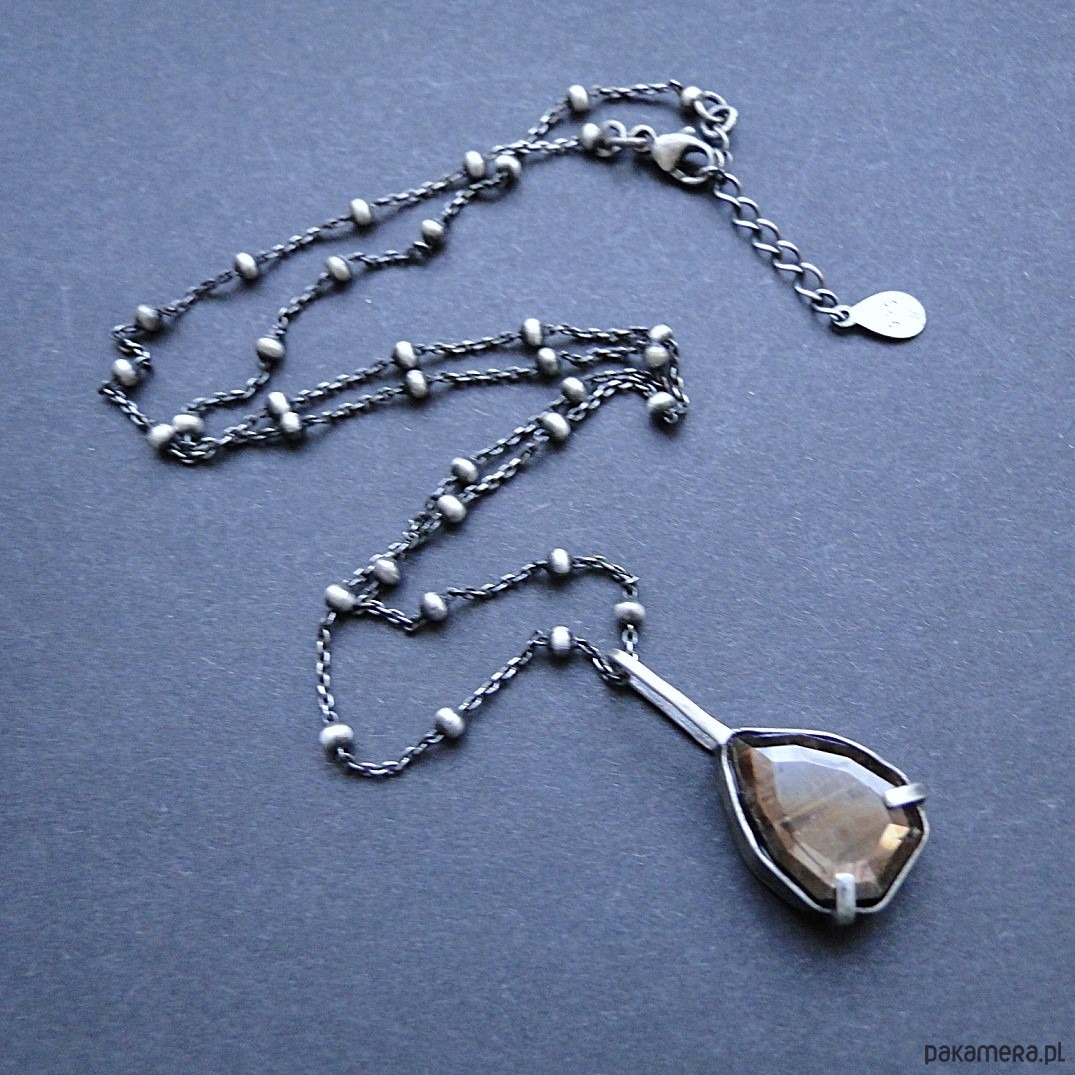 Piękny unikatowy naszyjnik wykonany w pojedynczym egzemplarzu. Srebro 925,oksydowane i szorowane. Kamień: imponuj acy naturalny szafir brązowy,elkko surowy, z brylantowym szlifem. Pięknie odbija światło.Kamień ma wym.15x12mm,oprawiłam go w prostą surową kasetkę z dwoma łapkami. Obwód łałncuszka- 45 cm plus 3 cm przedłużki. Nie moczyć w wodzie.