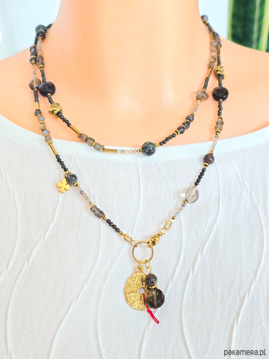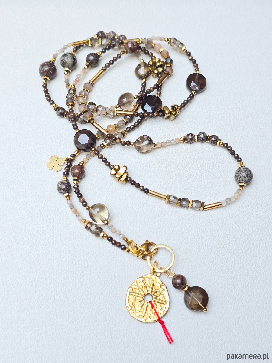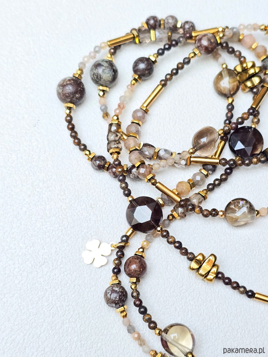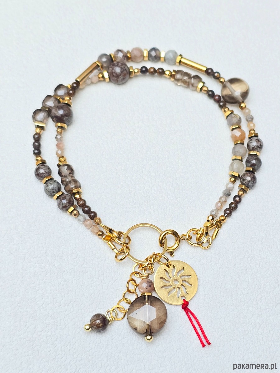 Wykorzystane kamienie: kwarc dymny, bronzyt, kamień słoneczny, złocony hematyt.
