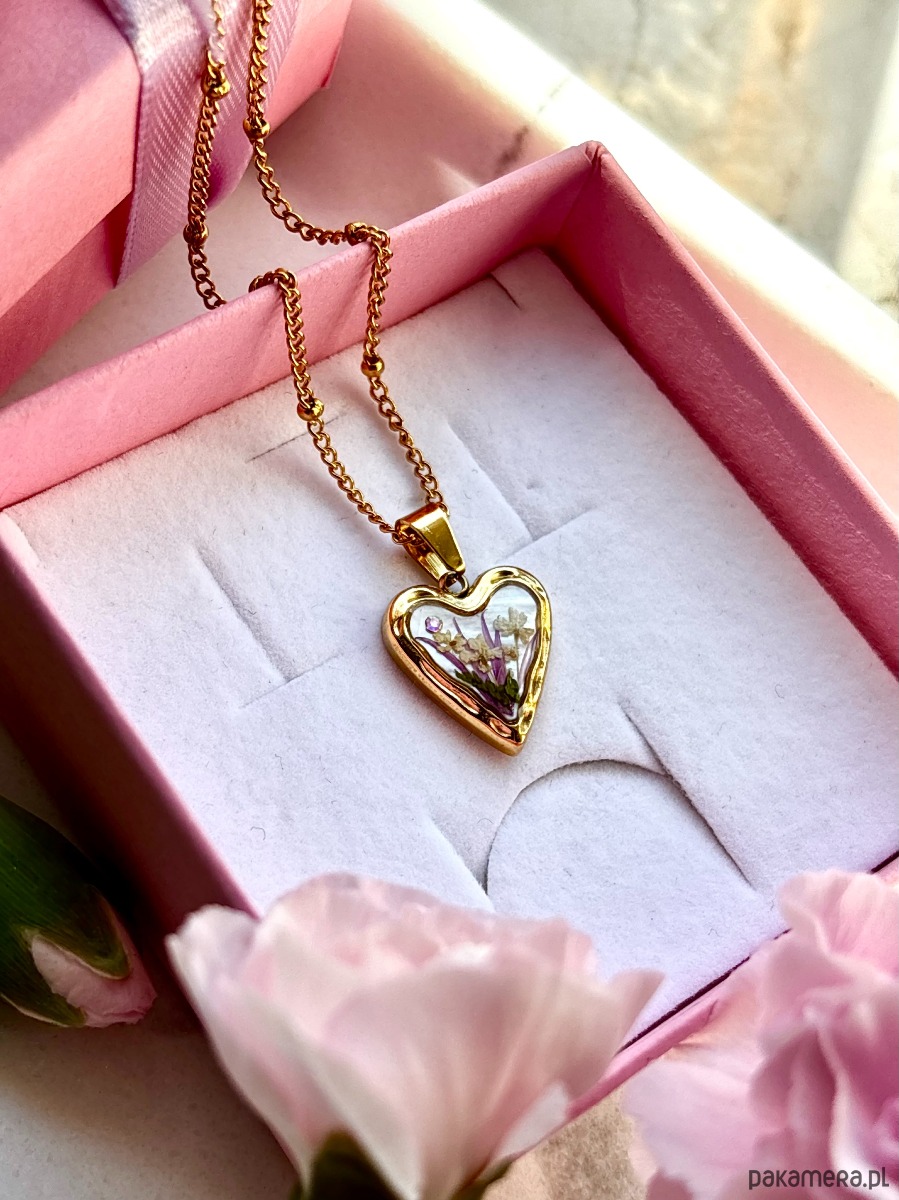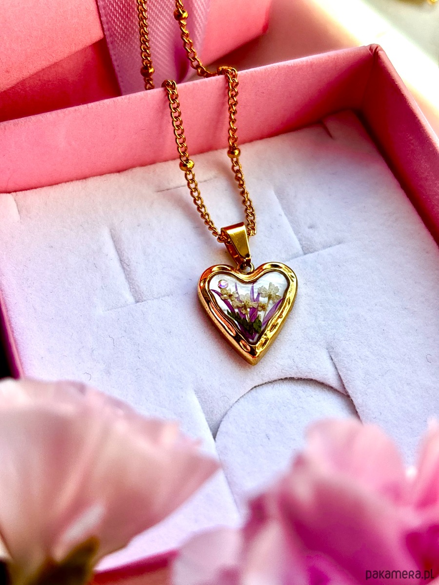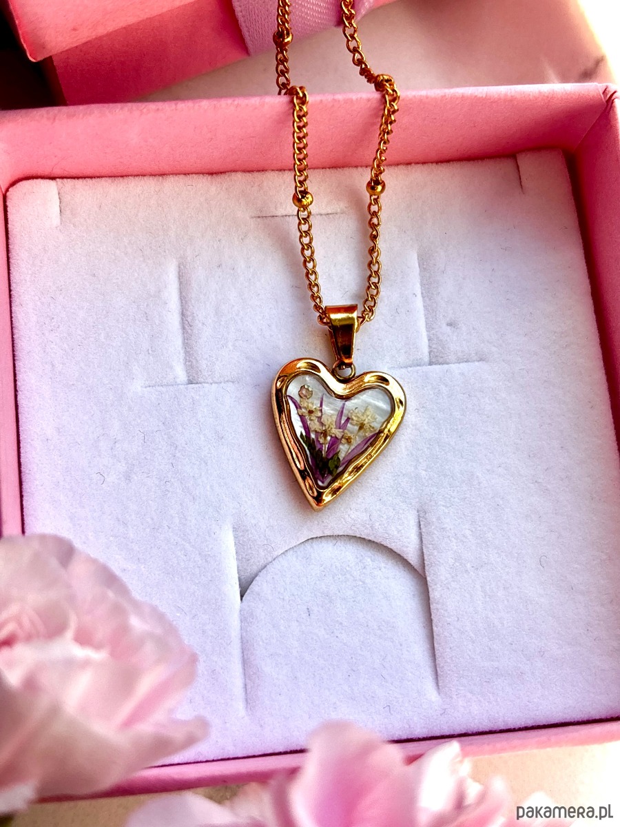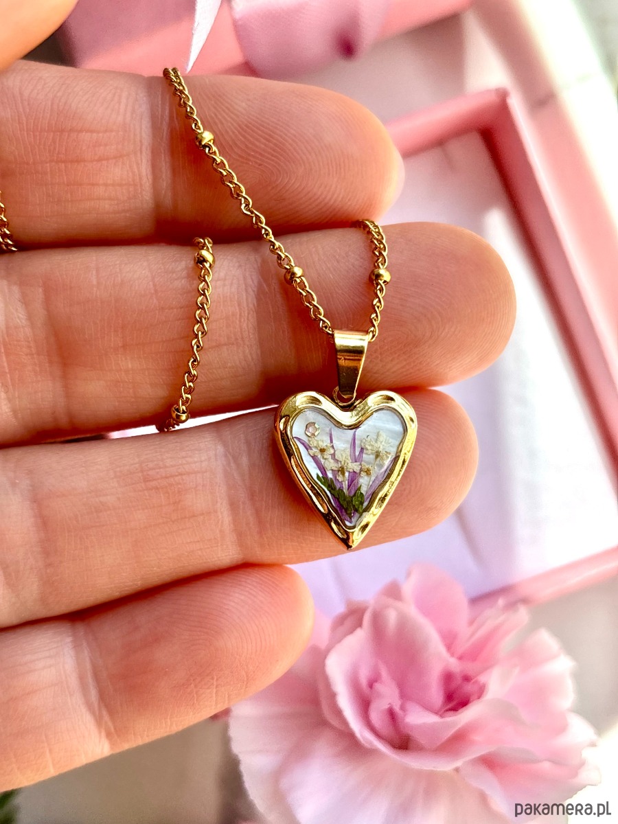 Ten wyjątkowy naszyjnik w kształcie serca to subtelne połączenie natury i elegancji. W jego wnętrzu kryje się miniaturowa kompozycja z polnych, ręcznie suszonych kwiatów. Drobne białe i fioletowe akcenty tworzą romantyczny bukiecik, który nigdy nie zwiędnie.