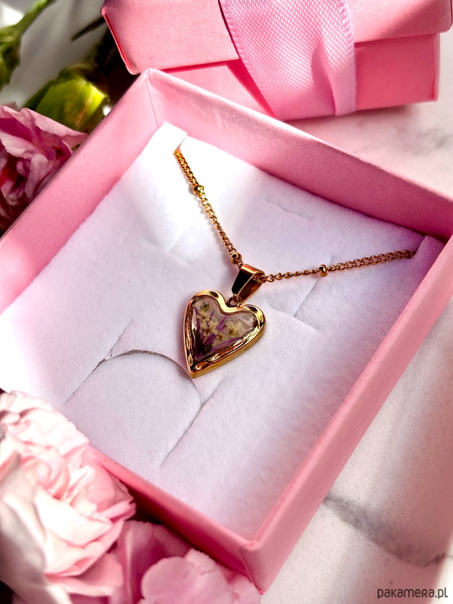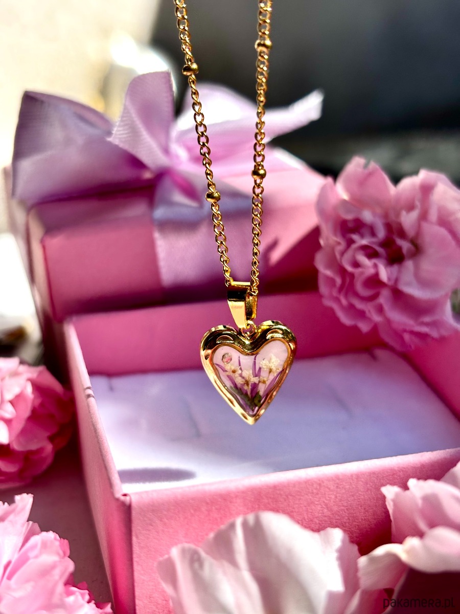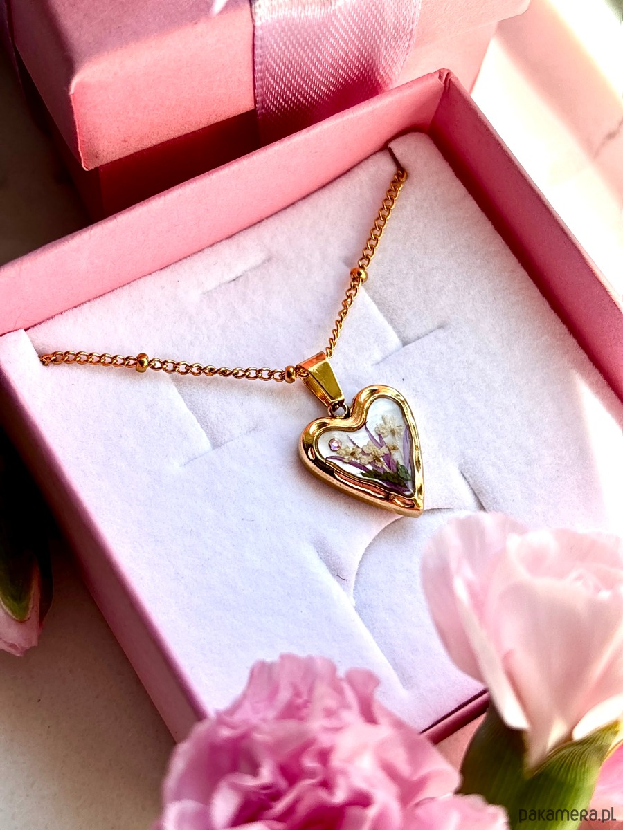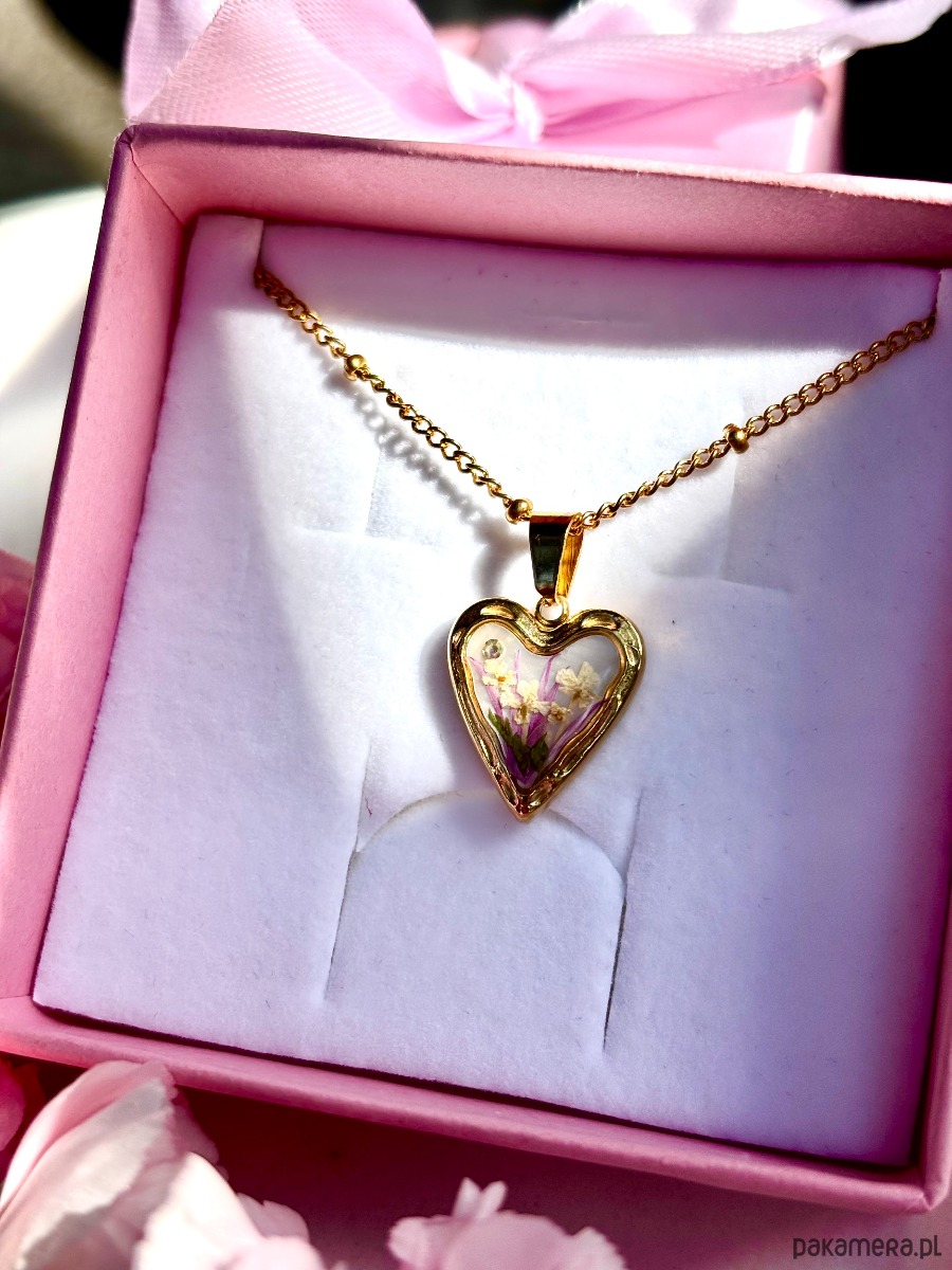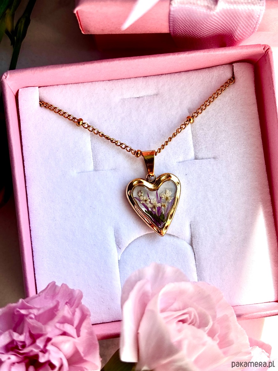 Ten wyjątkowy naszyjnik w kształcie serca to subtelne połączenie natury i elegancji. W jego wnętrzu kryje się miniaturowa kompozycja z polnych, ręcznie suszonych kwiatów. Drobne białe i fioletowe akcenty tworzą romantyczny bukiecik, który nigdy nie zwiędnie.