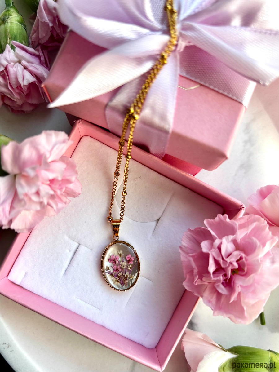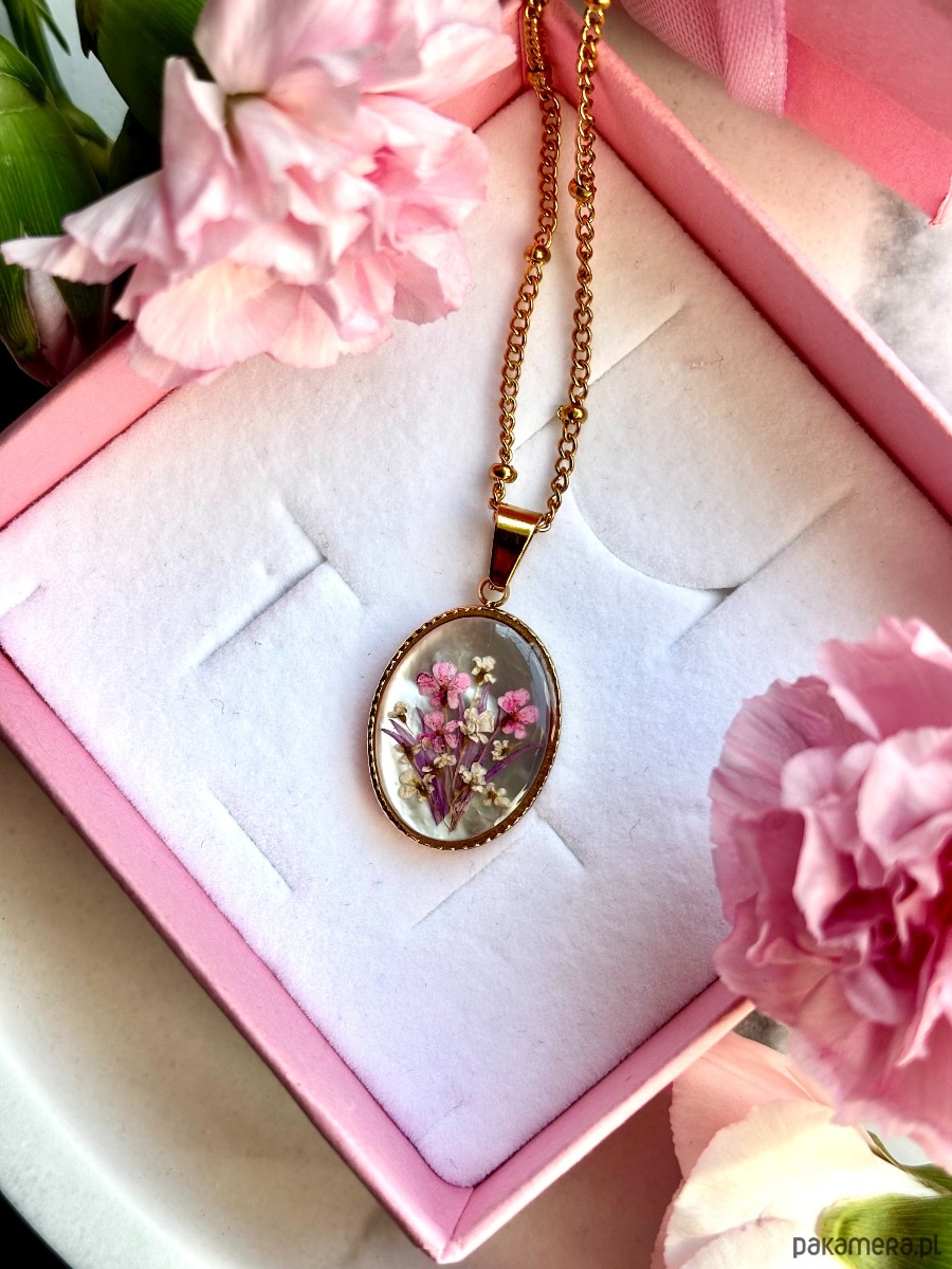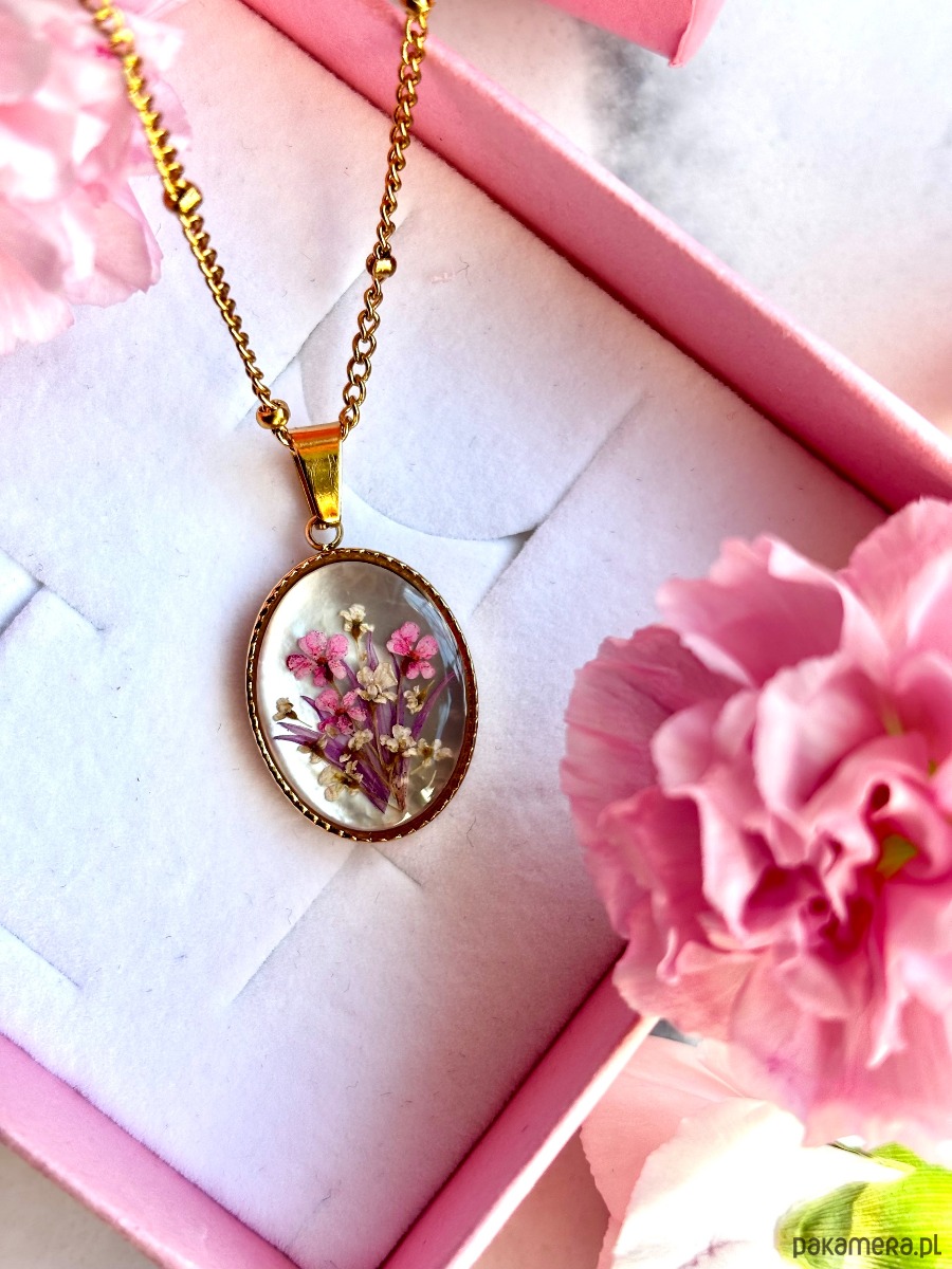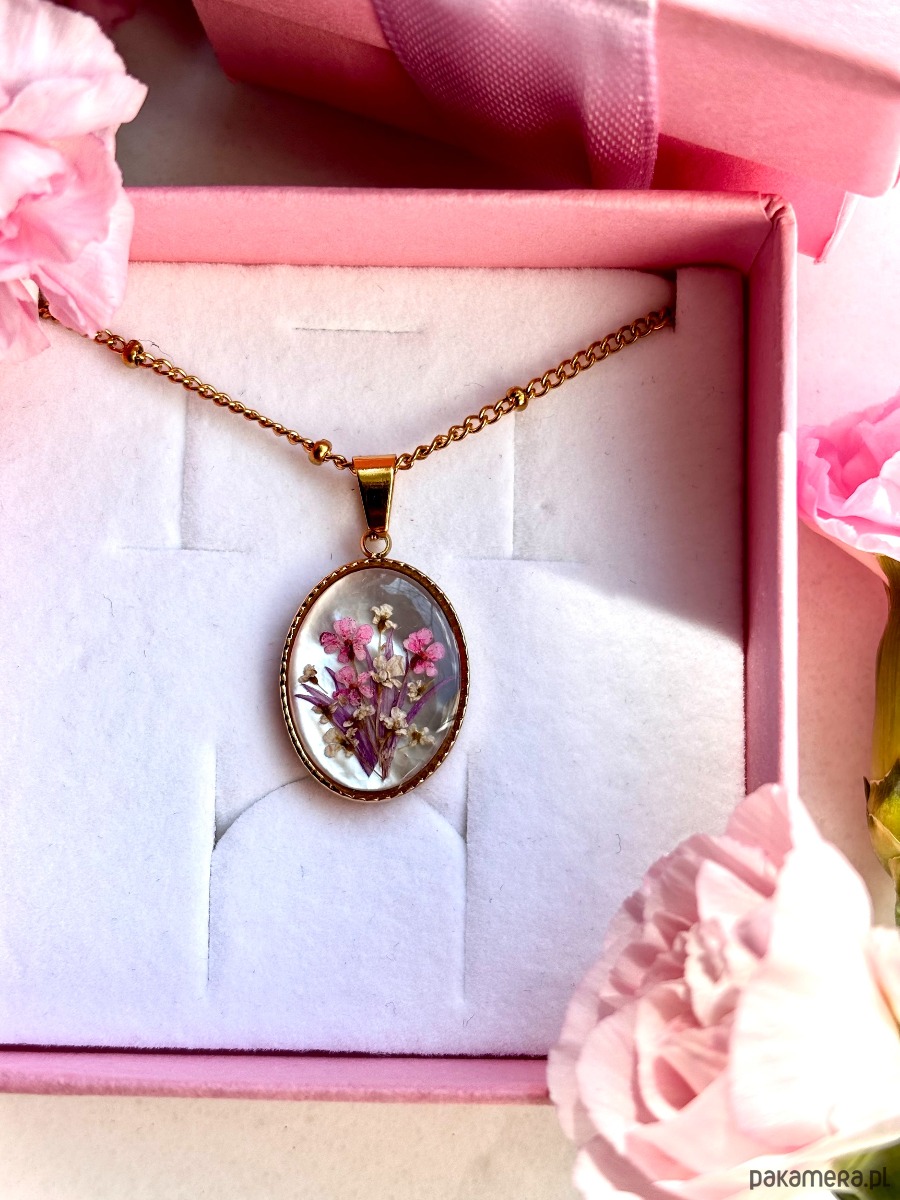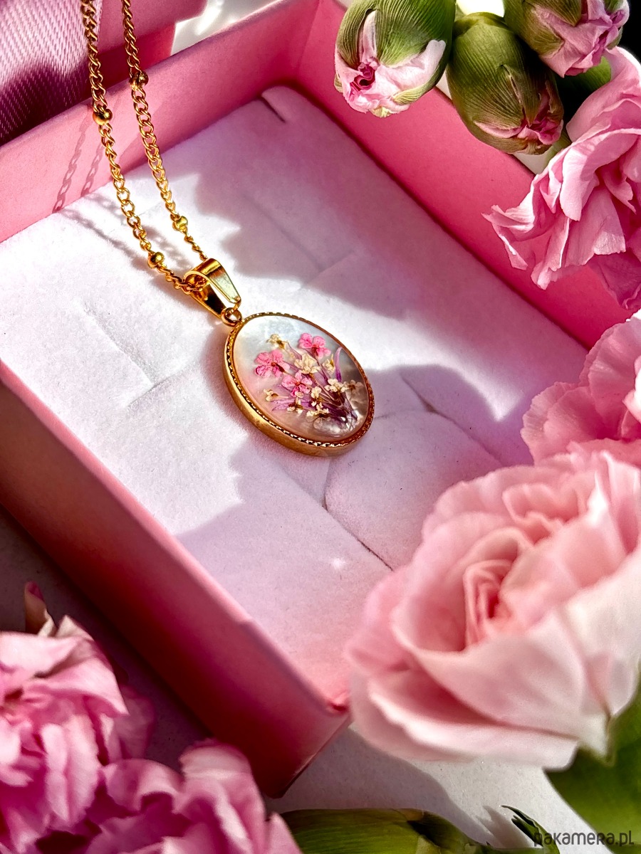 W owalnej oprawie o wymiarach 20 mm x 14 mm zostały zatopione starannie wyselekcjonowane, ręcznie suszone kwiaty w odcieniach różu, kremu i subtelnej zieleni. Każdy z nich zachował swoją unikalną formę, dzięki czemu kompozycja przypomina miniaturową, kwitnącą łąkę zatrzymaną w czasie.