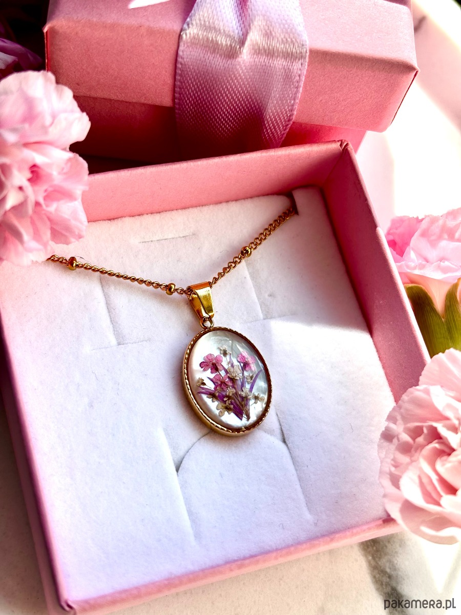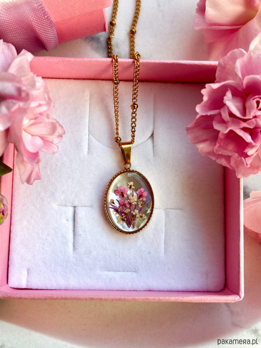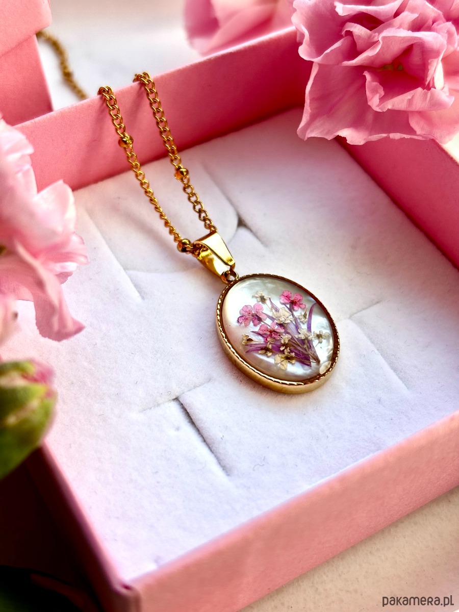 Materiał: stal nierdzewna w kolorze złotym, żywica epoksydowa, suszone kwiaty, masa perłowa.