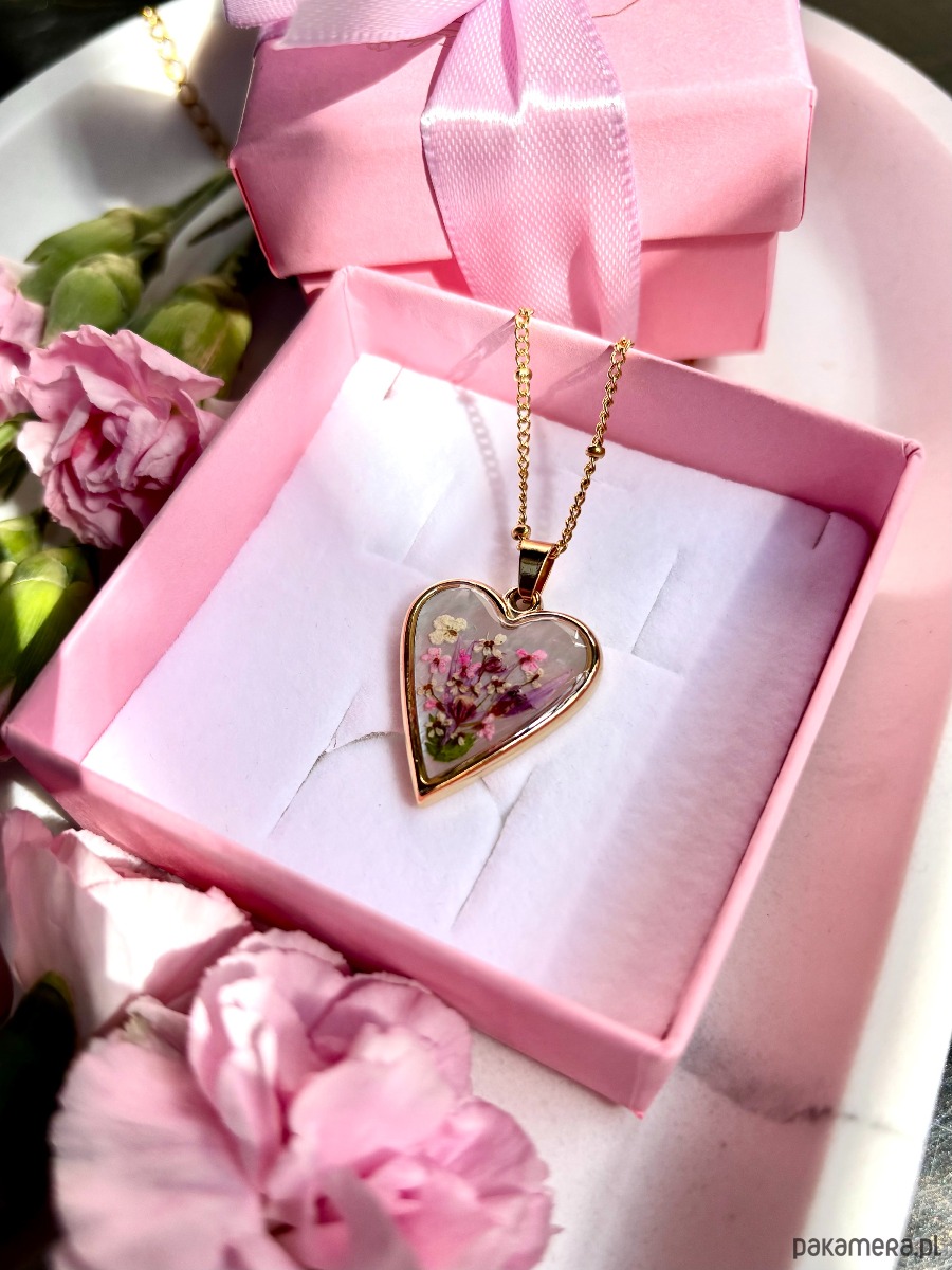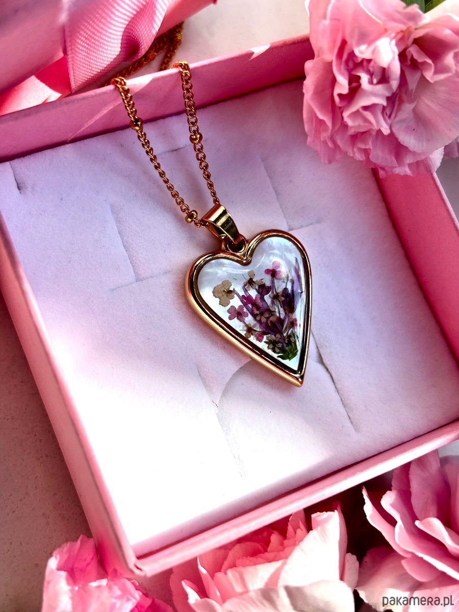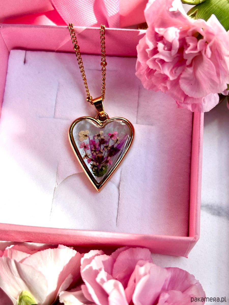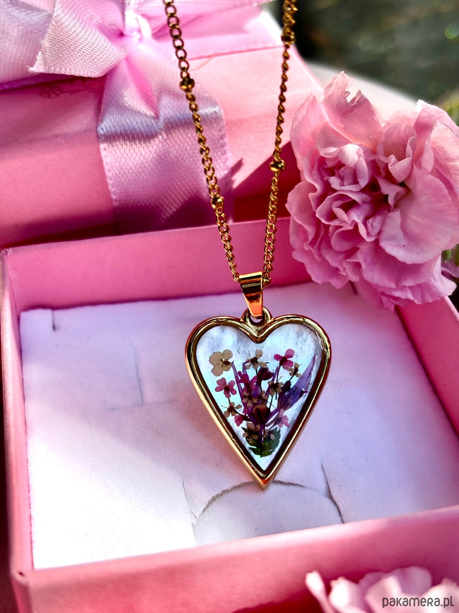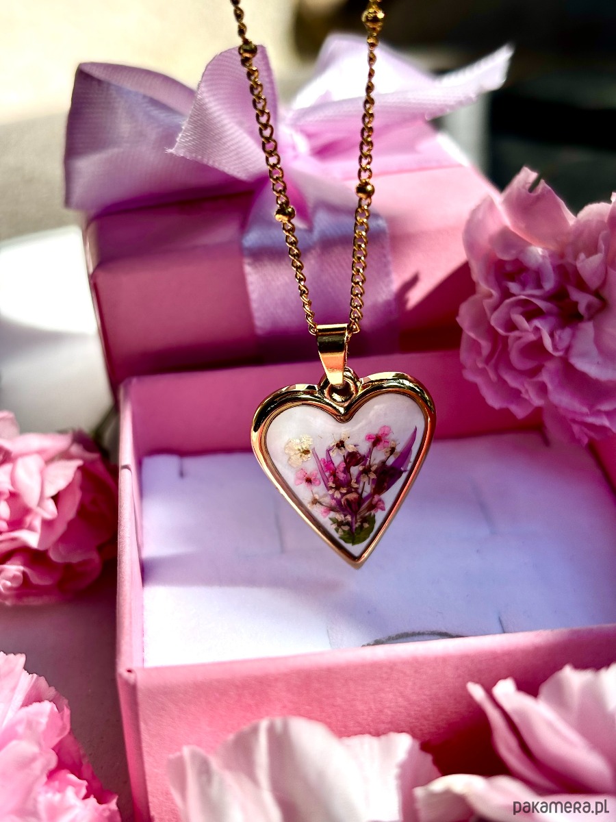 Ten wyjątkowy naszyjnik w kształcie serca to subtelne połączenie natury i elegancji. W jego wnętrzu kryje się miniaturowa kompozycja z polnych, ręcznie suszonych kwiatów. Drobne białe, różowe i fioletowe akcenty tworzą romantyczny bukiet, który nigdy nie zwiędnie.