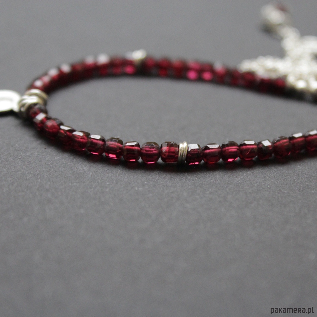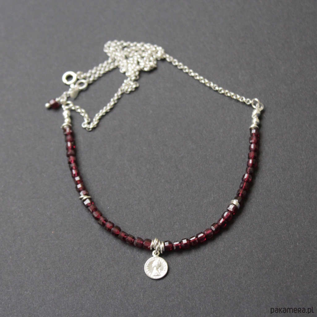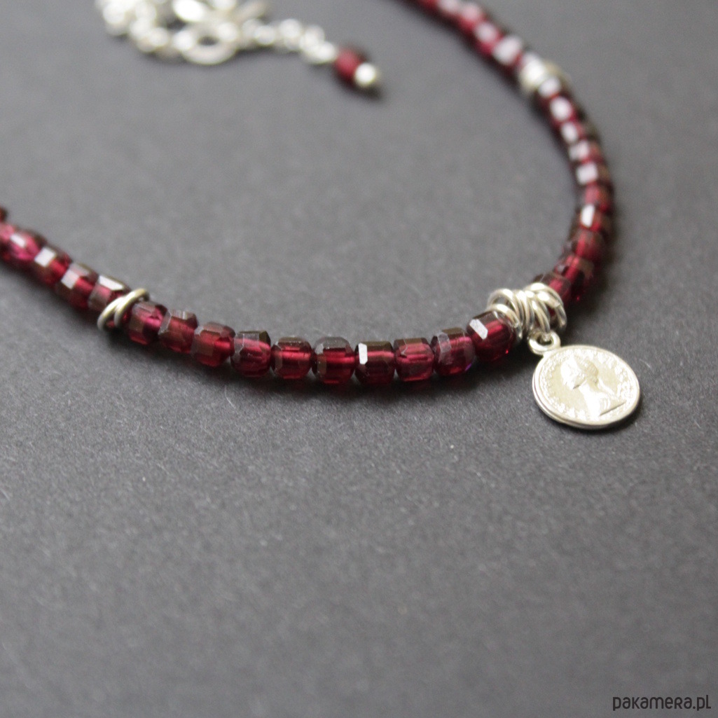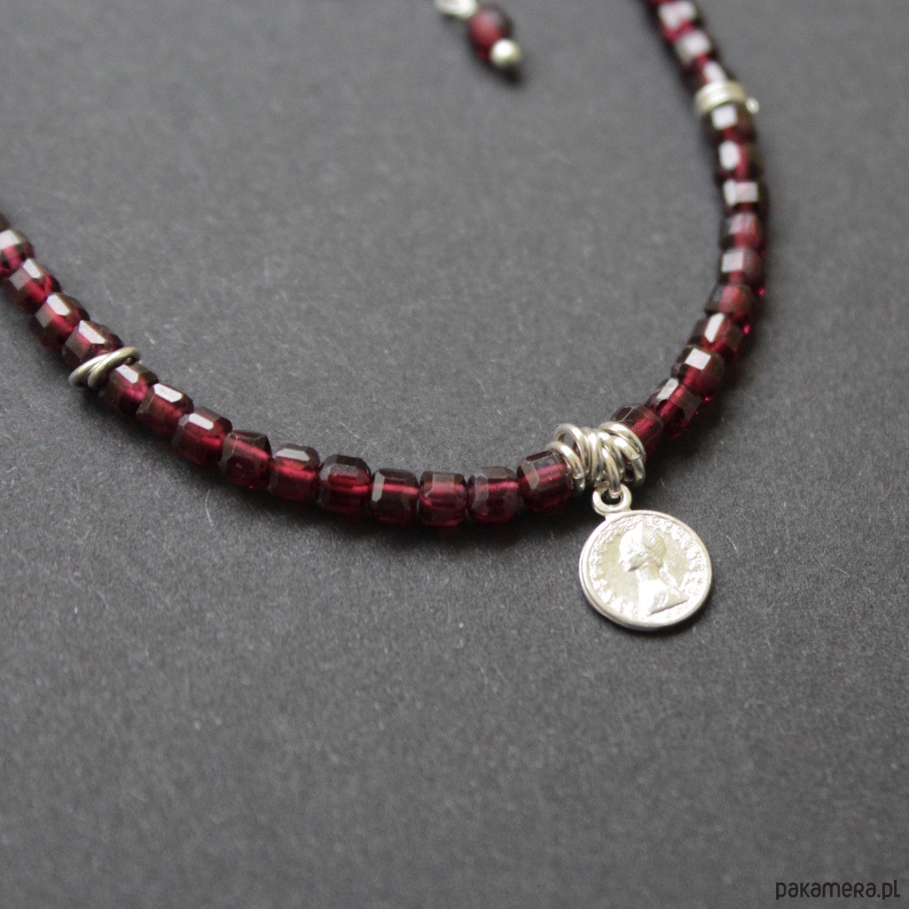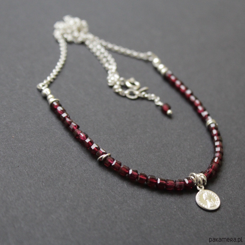 Piękny naszyjnik wykonany został ze srebra próby 925 oraz przepięknych fasetowanych kosteczek granatu wielkości 0,3cm.