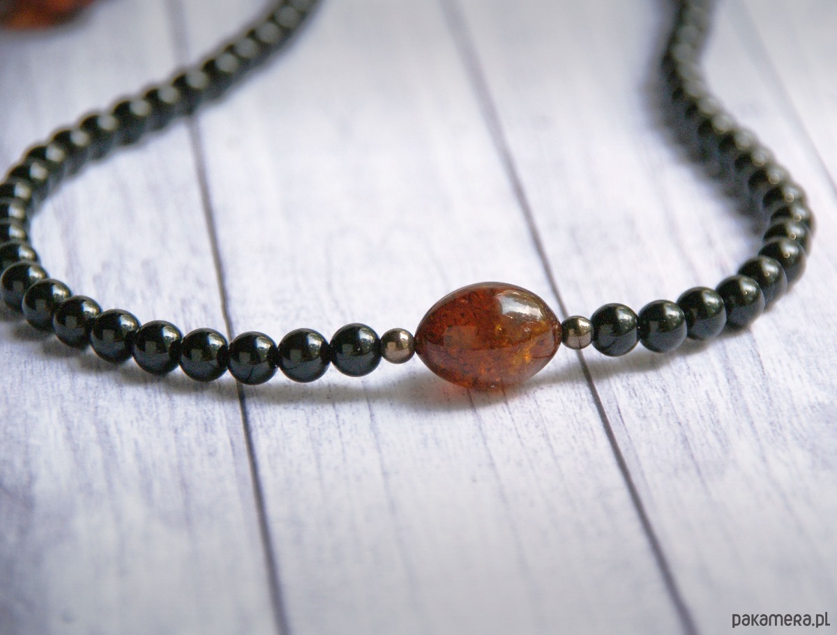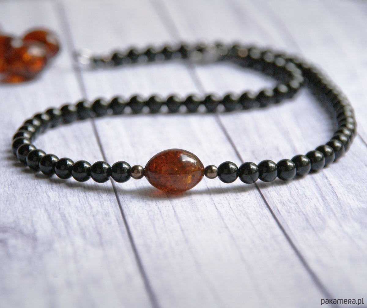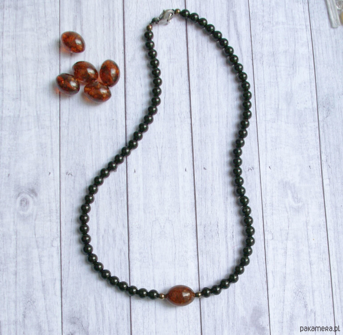 wykonany z oliwki naturalnego bursztynu bałtyckiego w intensywnym koniakowym odcieniu - ok.17-18mm (pięknie wybarwiony) , cudnie kontrastującej z czernią turmalinu (błysk - kule 6mm)