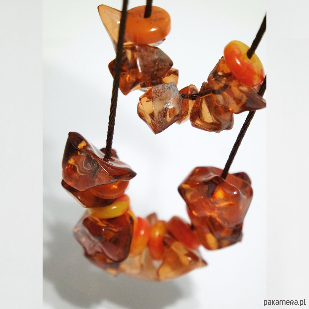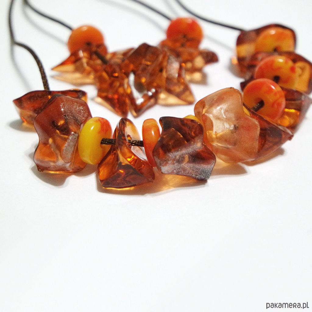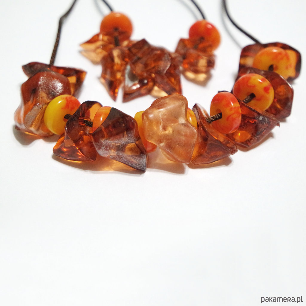 Wykonany z koralików akrylowych w kolorze bursztynu i pomarańczowych, marmurkowych oraz brązowego sznureczka nylonowego.