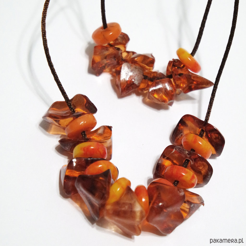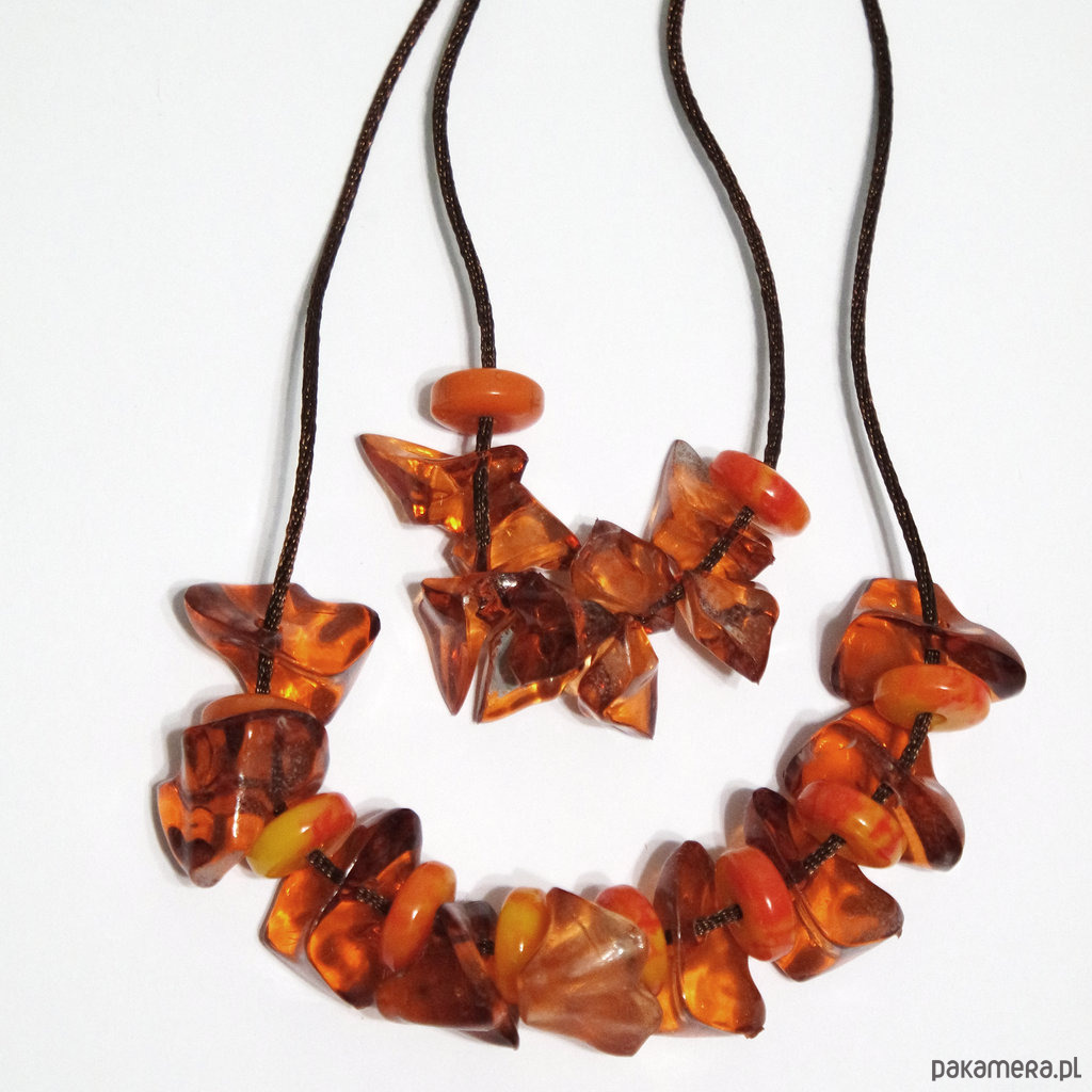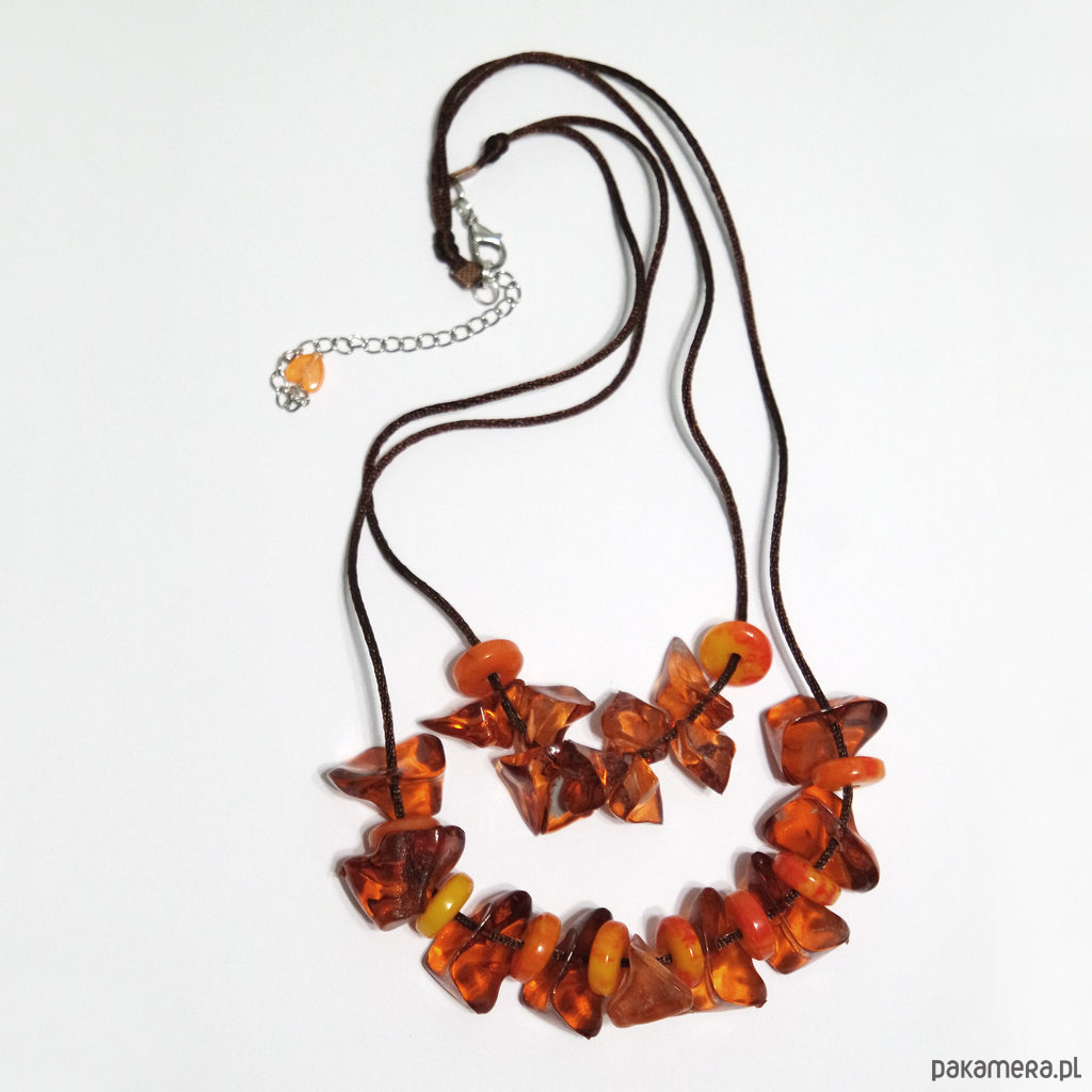 Wykonany z koralików akrylowych w kolorze bursztynu i pomarańczowych, marmurkowych oraz brązowego sznureczka nylonowego.