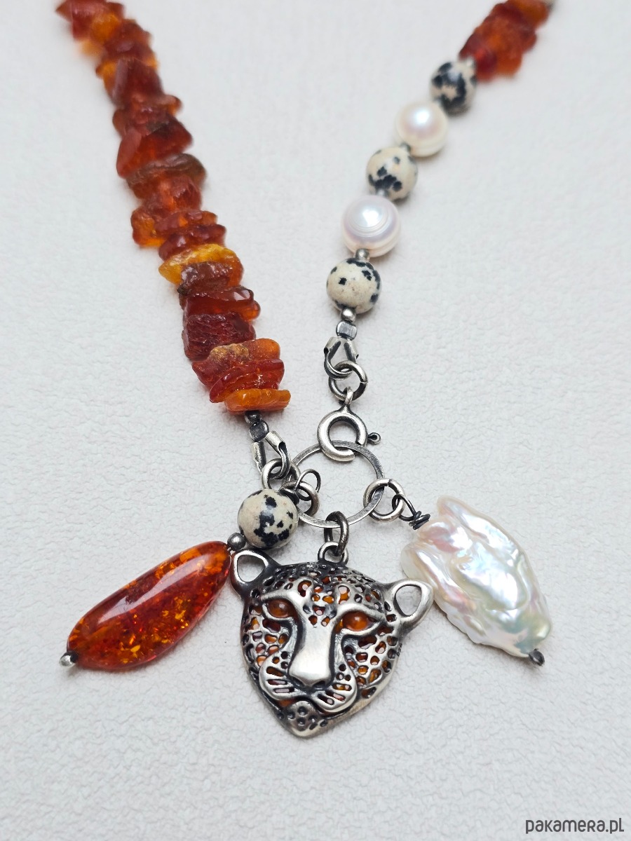 Ozdobą naszyjnika są 3 zawieszki: ażurowa w kształcie głowy geparda, bryłka bursztynu i perła.