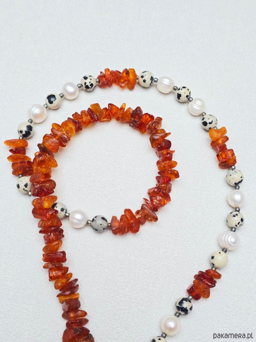 Unikatowy naszyjnik z naturalnych pereł, jaspisu dalmatyńskiego i bursztynu o średnicy ok 6-8mm. Zapinany z przodu.
