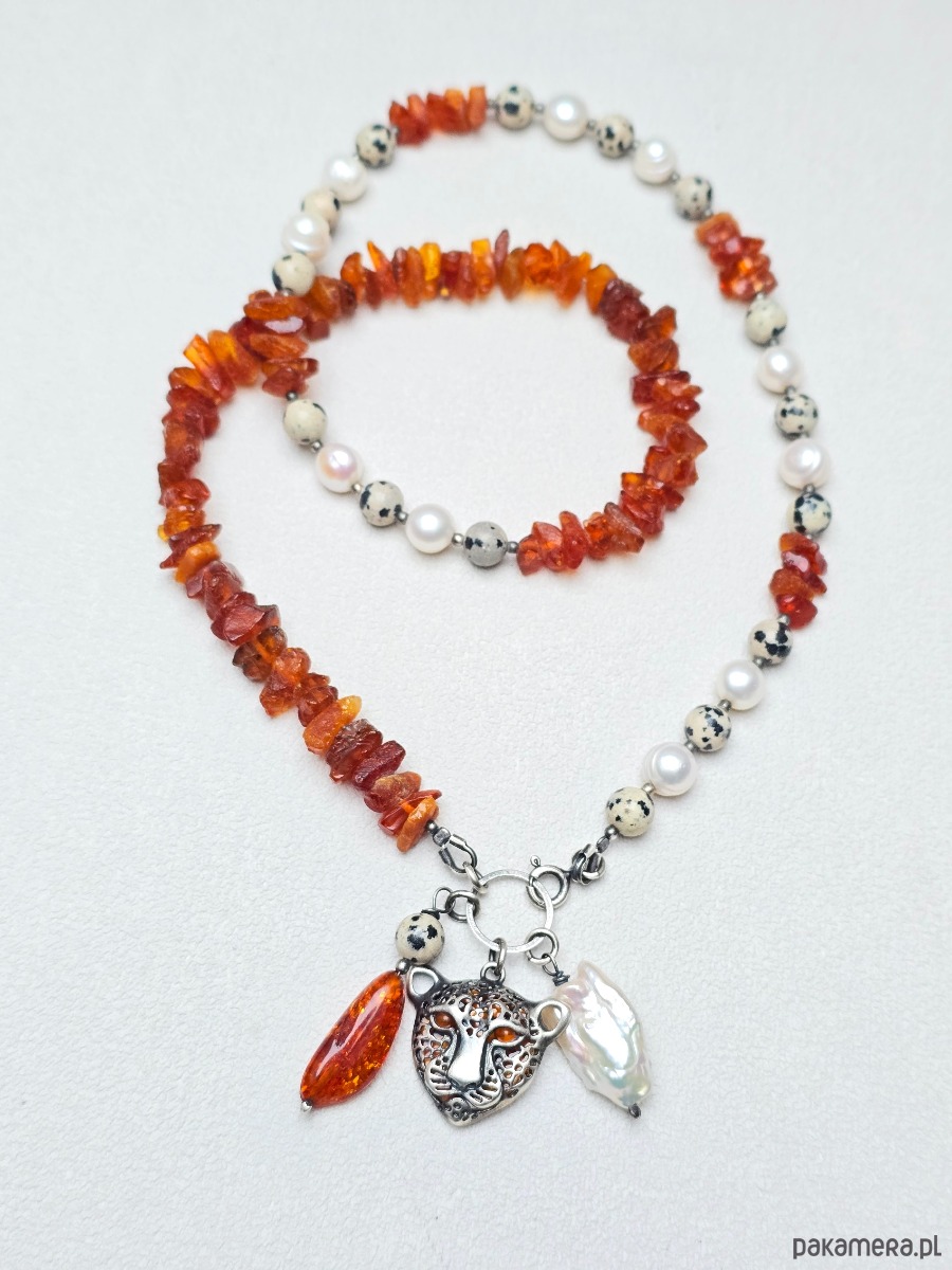 Ozdobą naszyjnika są 3 zawieszki: ażurowa w kształcie głowy geparda, bryłka bursztynu i perła.